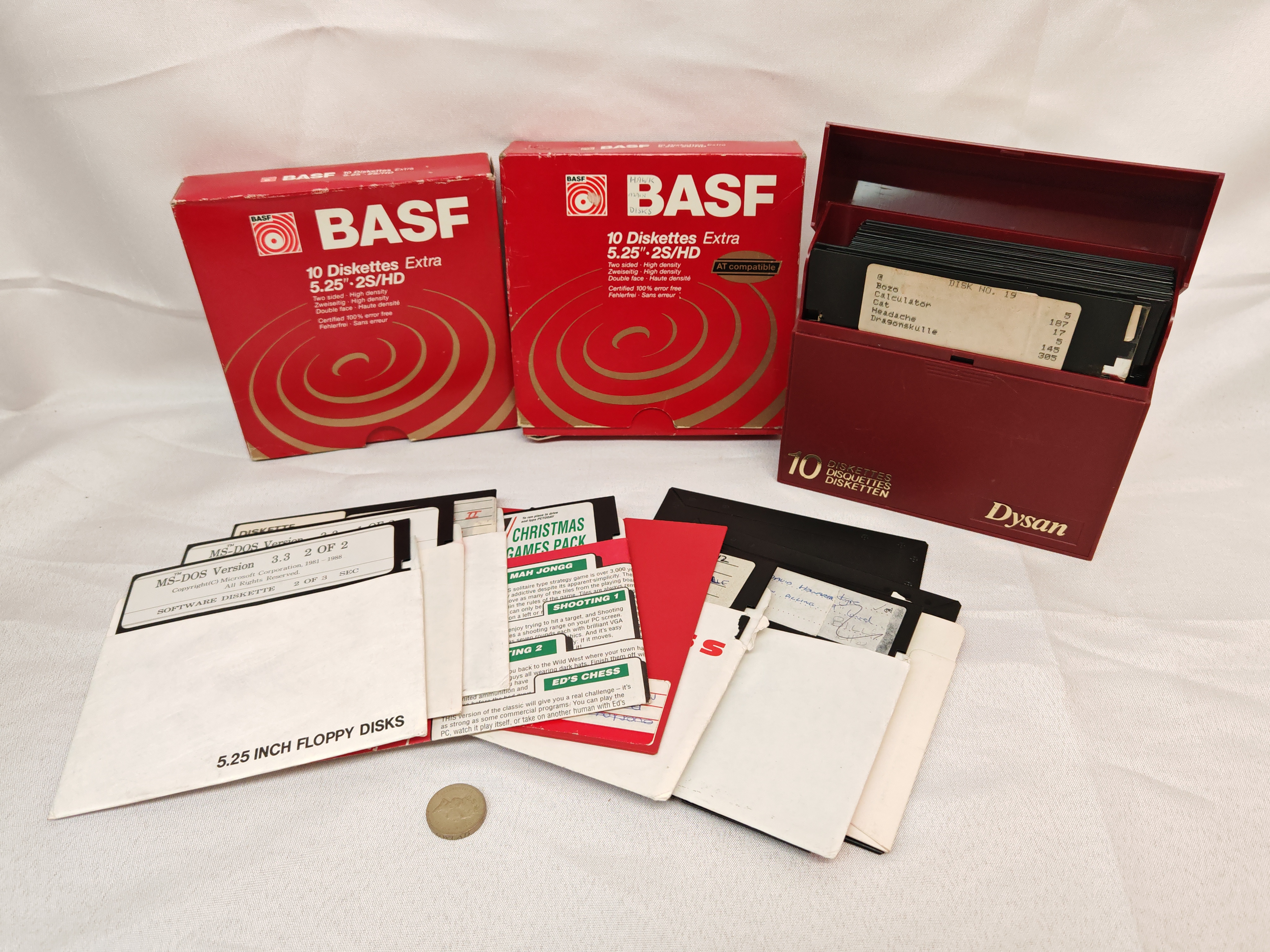Microsoft Corporation, MS-DOS Version 3.3, Microsoft, c. 1981-1988, Version 3.3 (Disk 2 of 2). Format consists of 5.25-inch magnetic floppy disks in paper sleeves and original card packaging. This collection of vintage computing ephemera includes a Christmas Games Pack printed insert detailing games such as Mah Jongg, Shooting 1, and Ed’s Chess. The lot features two original red BASF card boxes for 10 Diskettes Extra 5.25-inch 2S/HD media and a maroon Dysan plastic flip-top storage case containing approximately 15 to 20 additional floppy disks. Several disks feature contemporary user-applied labels, including DISK NO. 19 listing Bozo, Calculator, Cat, Headache, and Dragonskulle. Provenance includes various handwritten ownership notations and ink labelling on disk sleeves. Includes a single small metal token.