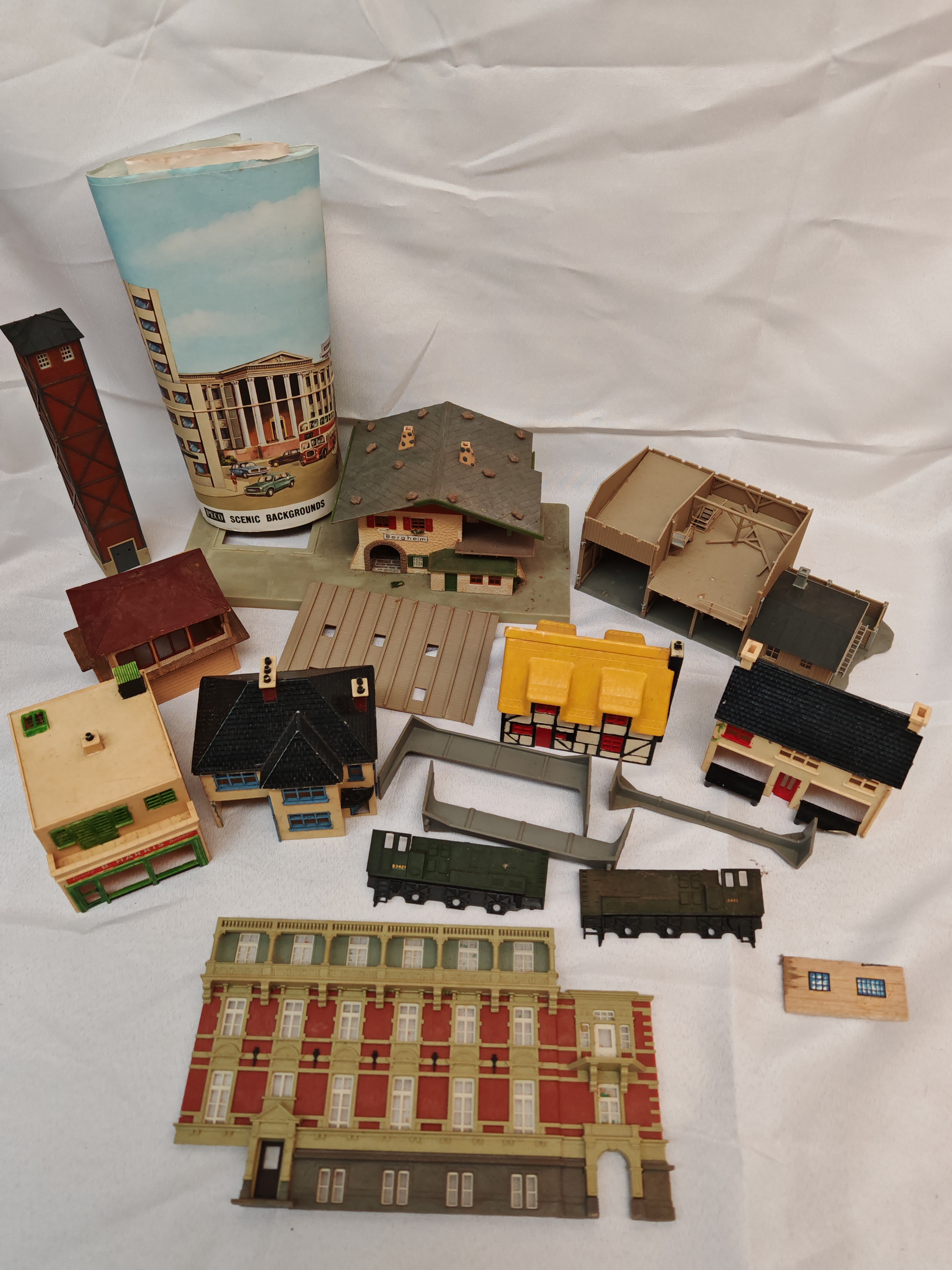 Kibri, Peco, and others, various town and industrial buildings including Bergheim station and city facades, locomotive shells including British Rail D3421, references include Kibri 38294 and 38381, movement type static, plastic construction, various architectural finishes, no serial numbers, no boxes or papers. OO/HO Scale.