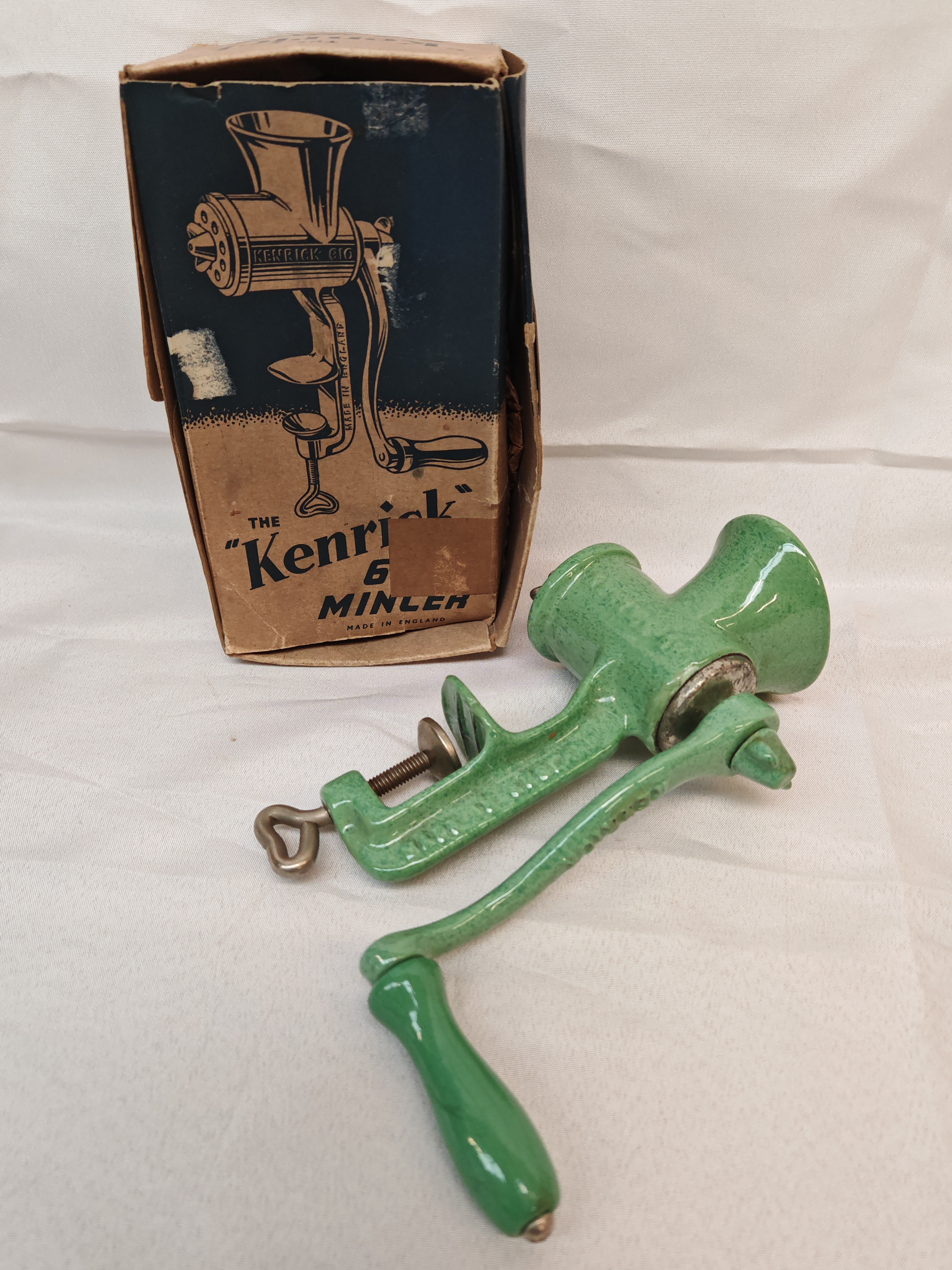 A vintage Archibald Kenrick and Sons No. 6 hand-cranked meat mincer, manufactured in West Bromwich, England. This heavy-duty kitchen tool is constructed from cast iron and finished in a distinctive mottled green vitreous enamel. The appliance features a matching green-painted wooden handle on the crank arm and a screw-clamp mechanism for secure table-top attachment. The body is prominently embossed with the markings KENRICK 6 and MADE IN ENGLAND. The item is accompanied by its original illustrated cardboard retail box, which features period-appropriate typography and a graphic representation of the mincer. This piece is a quintessential example of mid-century British domestic hardware and kitcheniana.