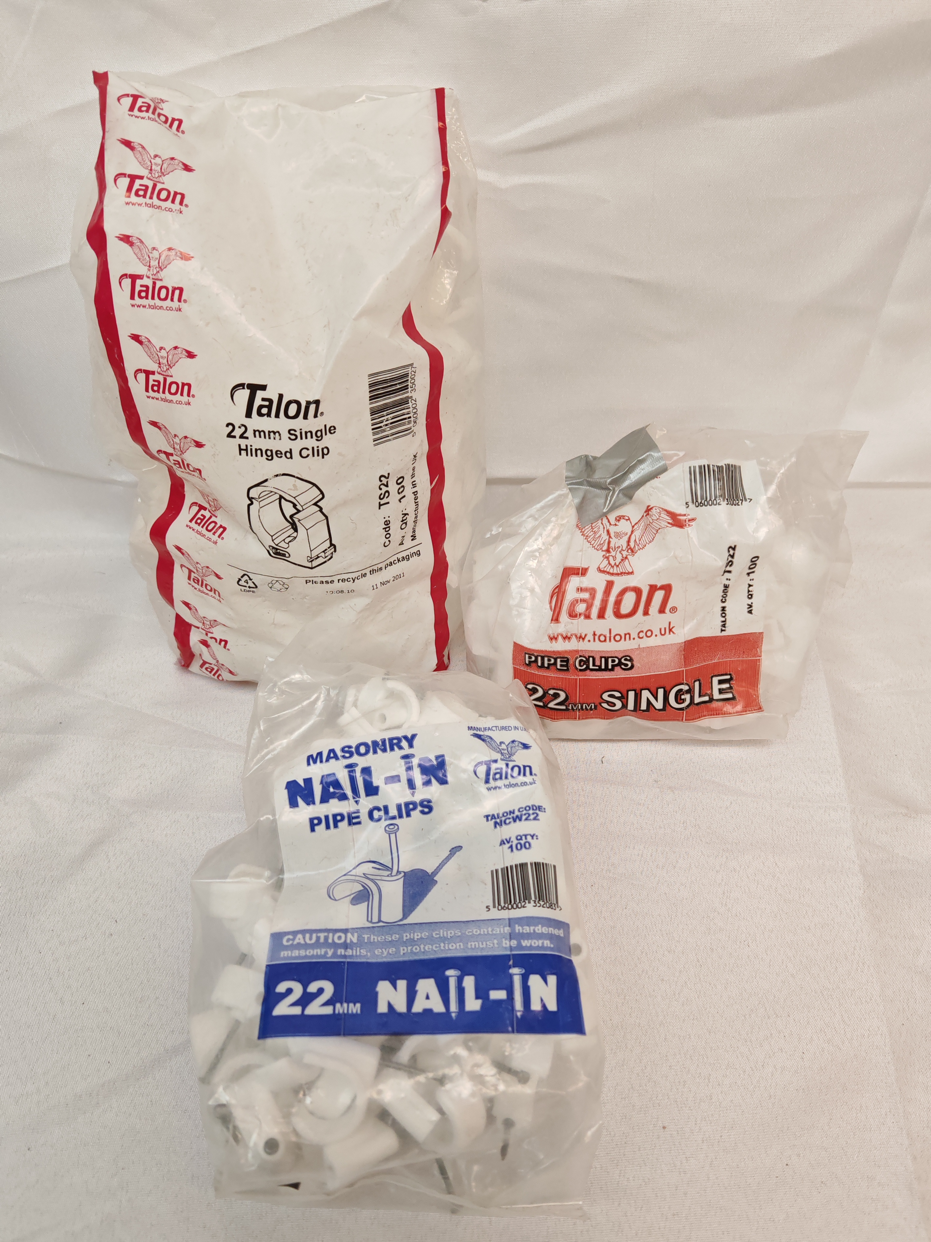 A collection of professional-grade plumbing fixtures manufactured in the United Kingdom by Talon. This lot comprises three original branded bags of white plastic clips specifically engineered for 22mm diameter piping. The assembly includes two bags of Talon Single Hinged Clips, Model TS22, and one bag of Talon Masonry Nail-In Pipe Clips, Model NCW22. Each bag is factory-labelled with an average quantity of 100 pieces. The packaging features the distinctive Talon eagle logo and manufacture details, with one bag bearing a specific production date of 11 November 2011. These items represent standard trade-quality hardware from the early 21st century. Measurements: Designed for 22mm diameter pipes.