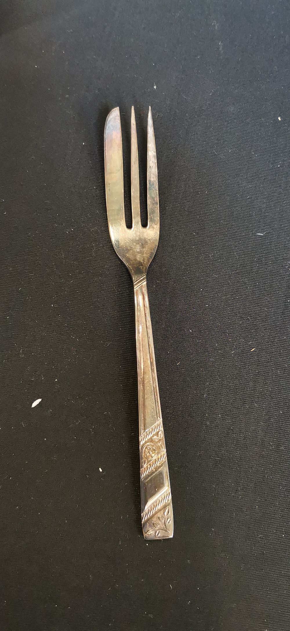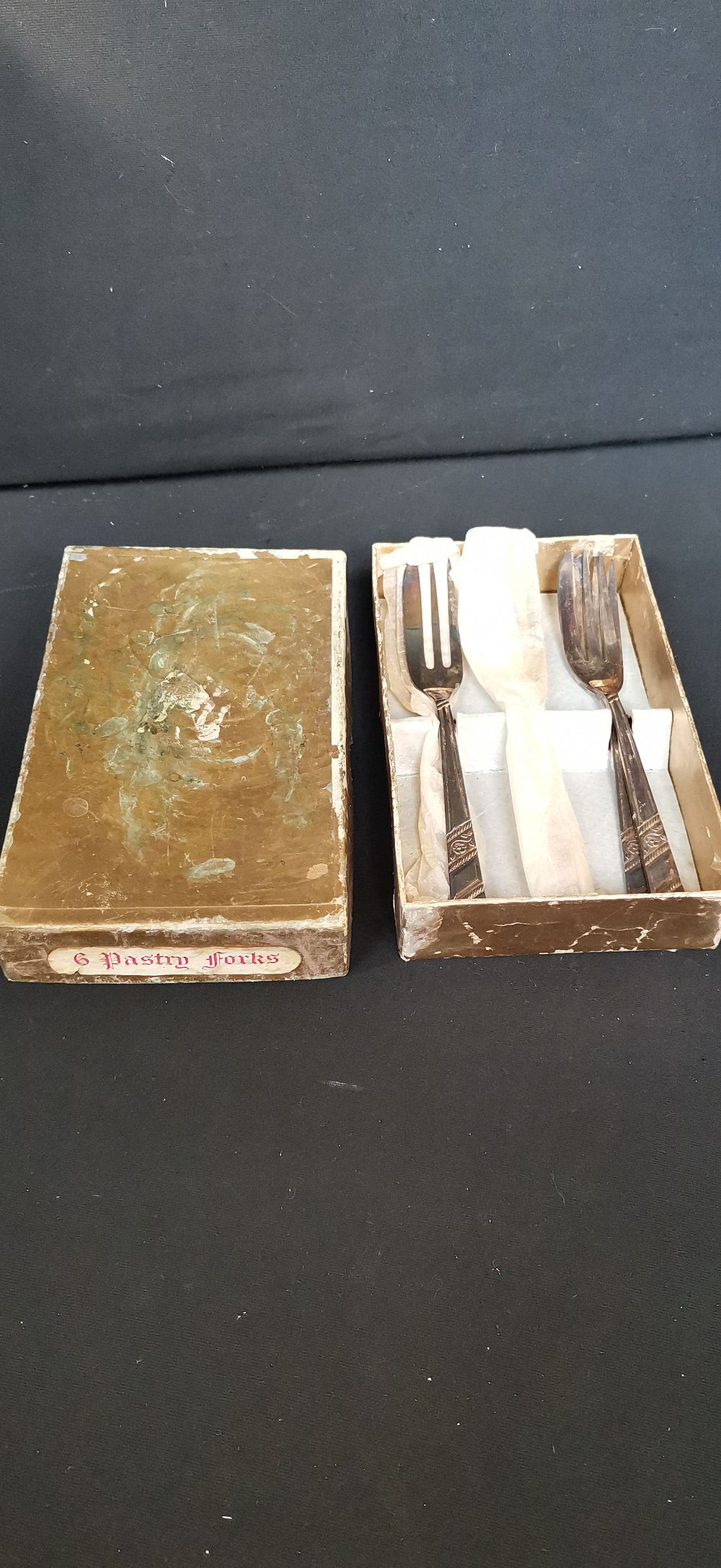 A set of pastry forks of white metal construction, likely silver-plated. Each fork features three tines, with the outer tine designed with a broad edge for cutting. The handles are decorated with a pattern of diagonal bands, rope-twist borders, and stylised floral and foliate motifs. The set is housed in its original gold-coloured cardboard presentation box, which features a printed label on the side reading 6 Pastry Forks. No maker’s marks or hallmarks are visible on the front of the pieces.