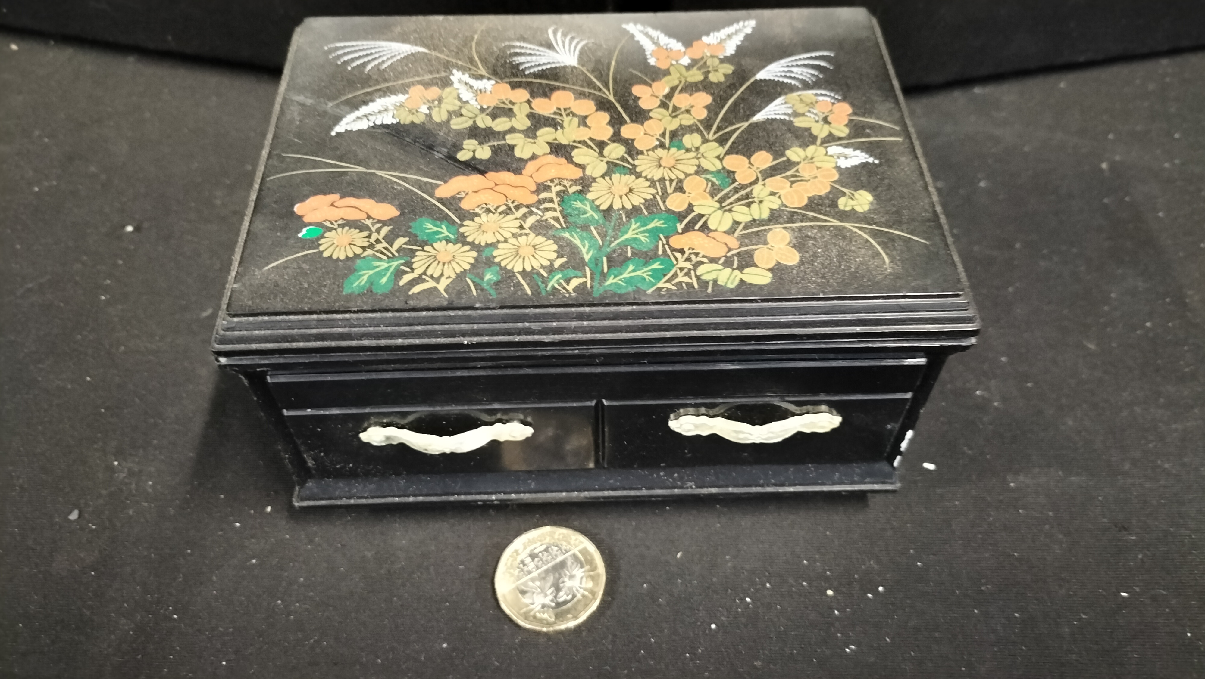 This miniature jewellery chest is constructed from lacquered wood or composite material with a black finish. The lid is decorated with a traditional Autumn Grasses or Akigusa motif, featuring chrysanthemums and pampas grass rendered in orange, green, and silver-toned pigments. The decoration appears to be transfer-applied or hand-painted. The chest features a tansu-style design with two small drawers at the base, each fitted with white composite or plastic handles. This item is characteristic of mid-to-late 20th-century Japanese export or souvenir lacquerware and is similar in style to pieces produced by Otagiri, though no maker marks are visible.