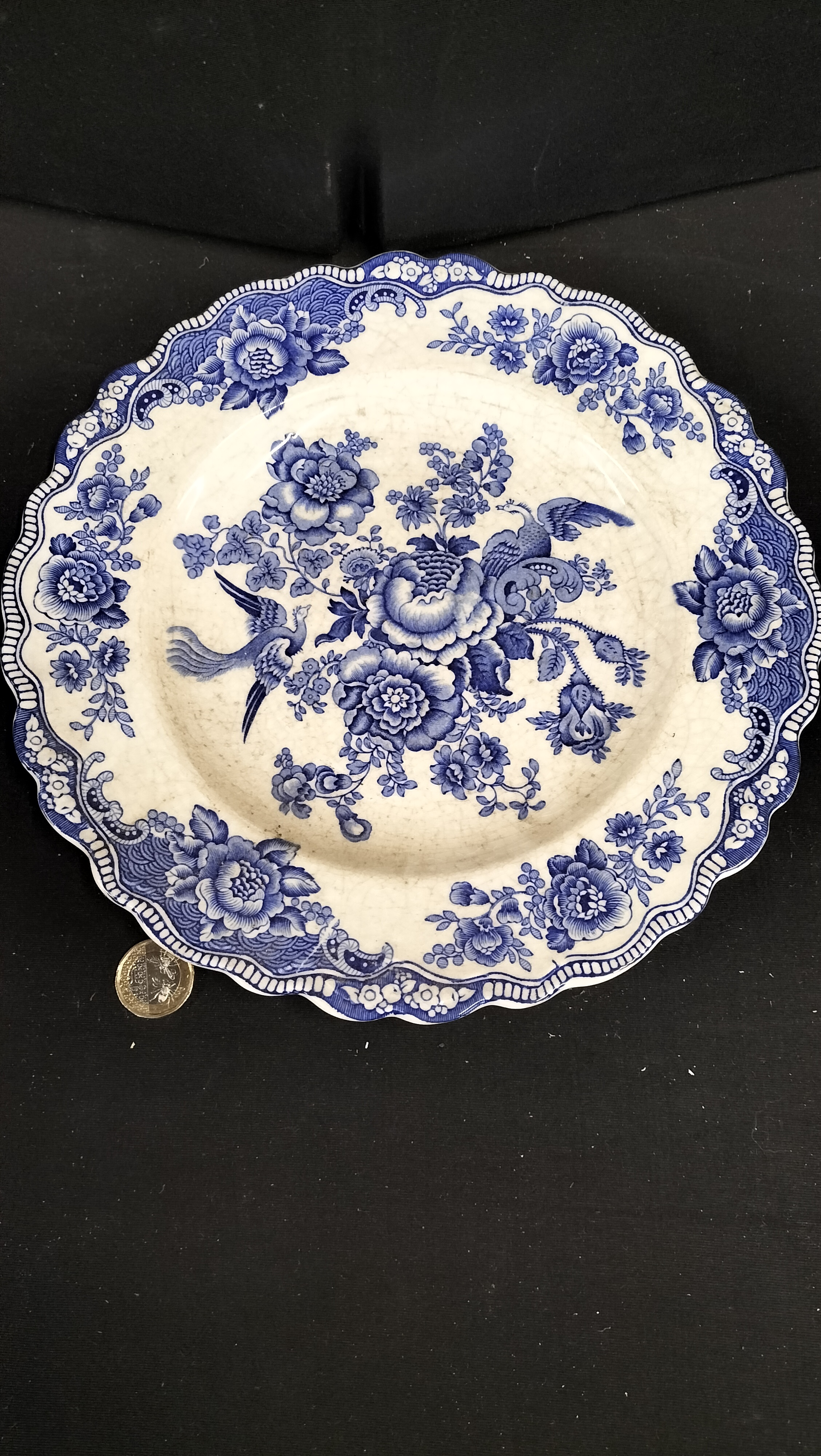 A circular earthenware plate featuring a scalloped, wavy rim. The decoration consists of blue underglaze transfer-printed designs in the Bristol pattern, which is a variation of the traditional Asiatic Pheasant motif. The central scene depicts floral sprays with exotic birds, surrounded by a repeating floral and patterned border. The reverse of the plate bears a printed mark in blue underglaze: BRISTOL / Crown Ducal / England / Rd No 762055. This registered design number indicates the pattern was first registered in approximately 1931.