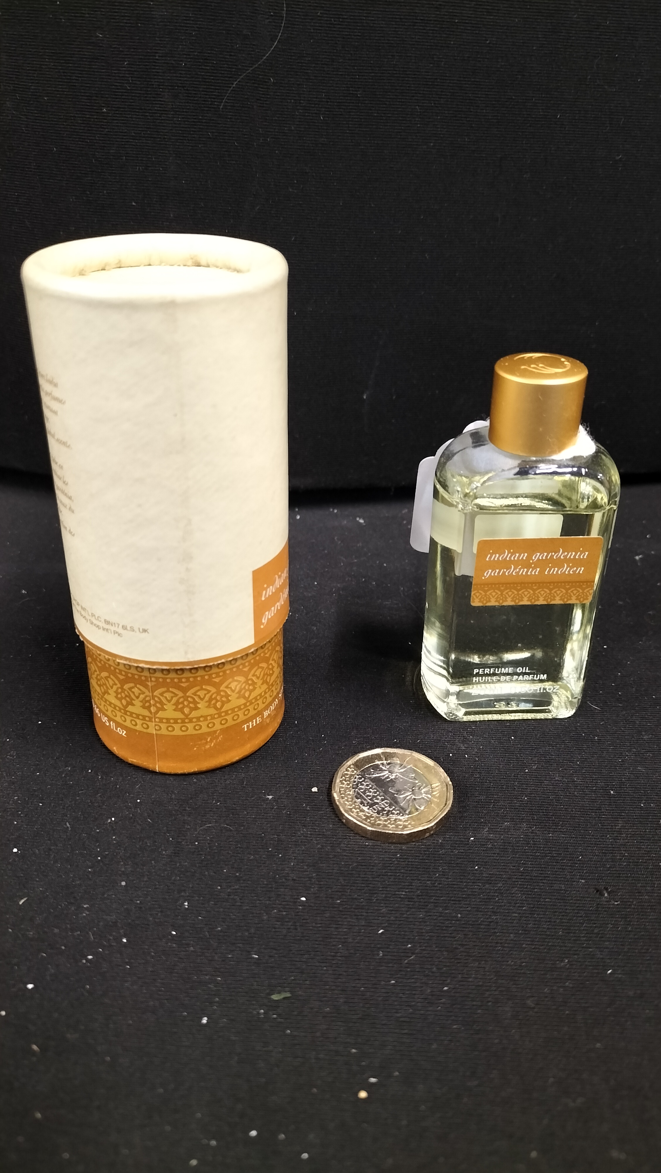 A 30ml bottle of Indian Gardenia perfume oil by The Body Shop, accompanied by its original cylindrical cardboard packaging. The glass bottle is fitted with a gold-toned plastic screw cap embossed with the brand logo and bears a label with the text indian gardenia / gardénia indien above PERFUME OIL / HUILE DE PARFUM and a volume of 30 ml 1.0 US FL.OZ. The matching cylindrical box features a decorative orange and gold-toned band at the base with the brand and product names. Fine print on the side of the container identifies the manufacturer as The Body Shop Int’l Plc with a UK postcode of BN17 6LS. The bottle contains a pale yellow liquid and appears substantially full. A UK one pound coin is included for scale.