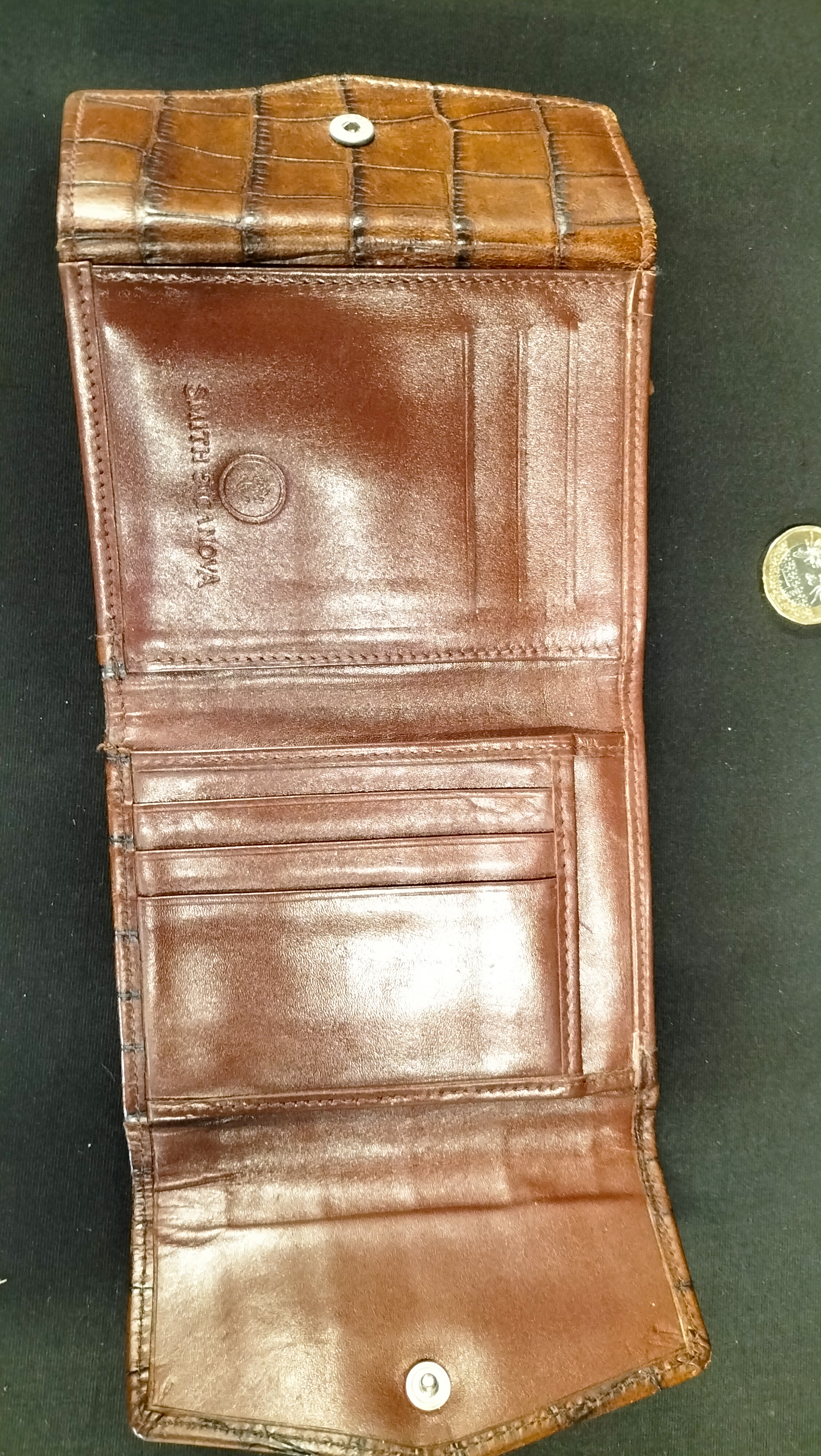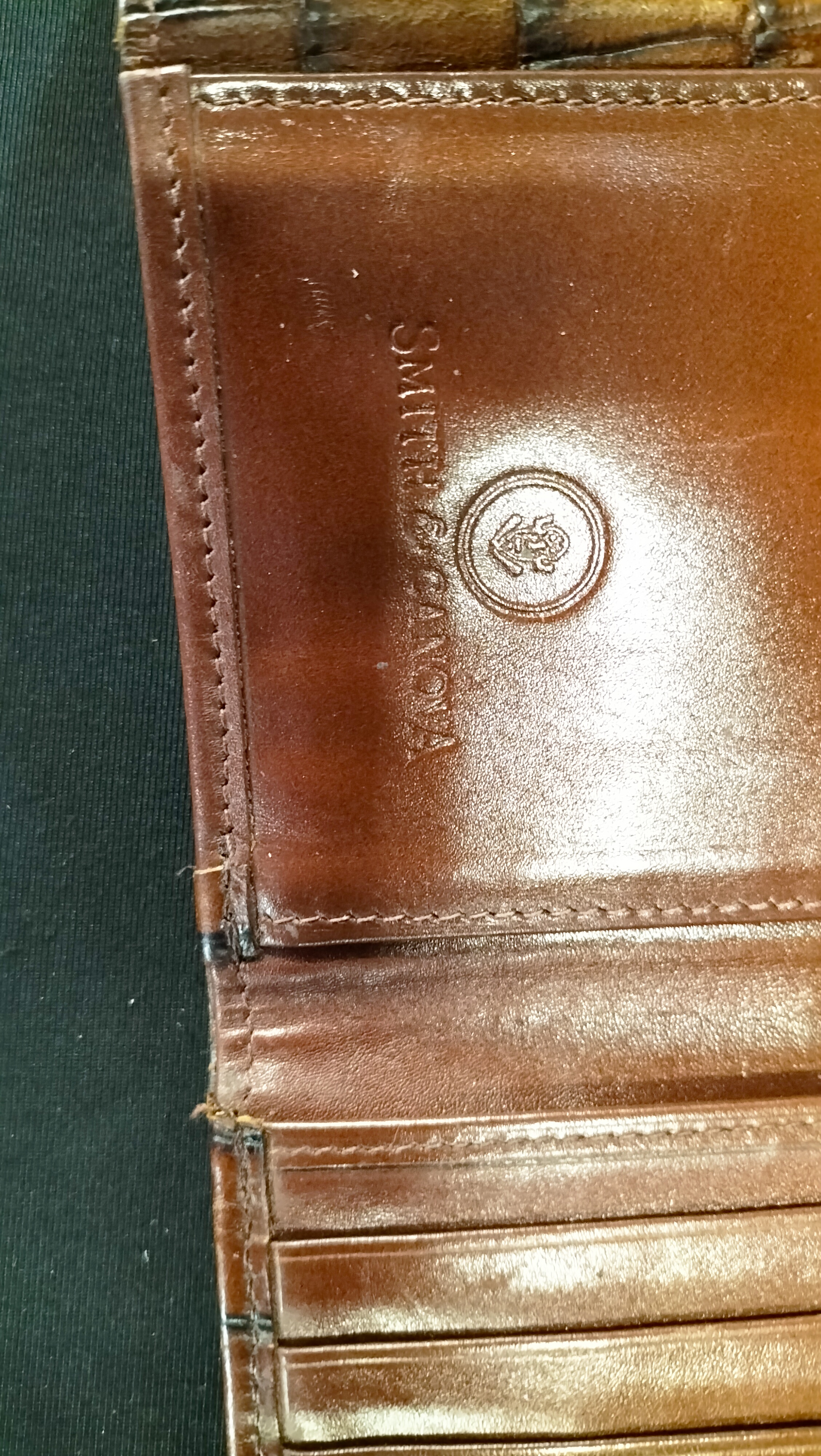 A tri-fold wallet by the British brand Smith & Canova. The exterior is crafted from cognac-coloured leather featuring a crocodile-embossed pattern with a high-gloss finish. The interior is lined with smooth tonal brown leather and contains multiple card slots and a full-length compartment for banknotes. The wallet is secured by a silver-tone metal press-stud closure. The interior leather is embossed with the maker mark SMITH & CANOVA and a circular logo containing a heraldic-style crest.