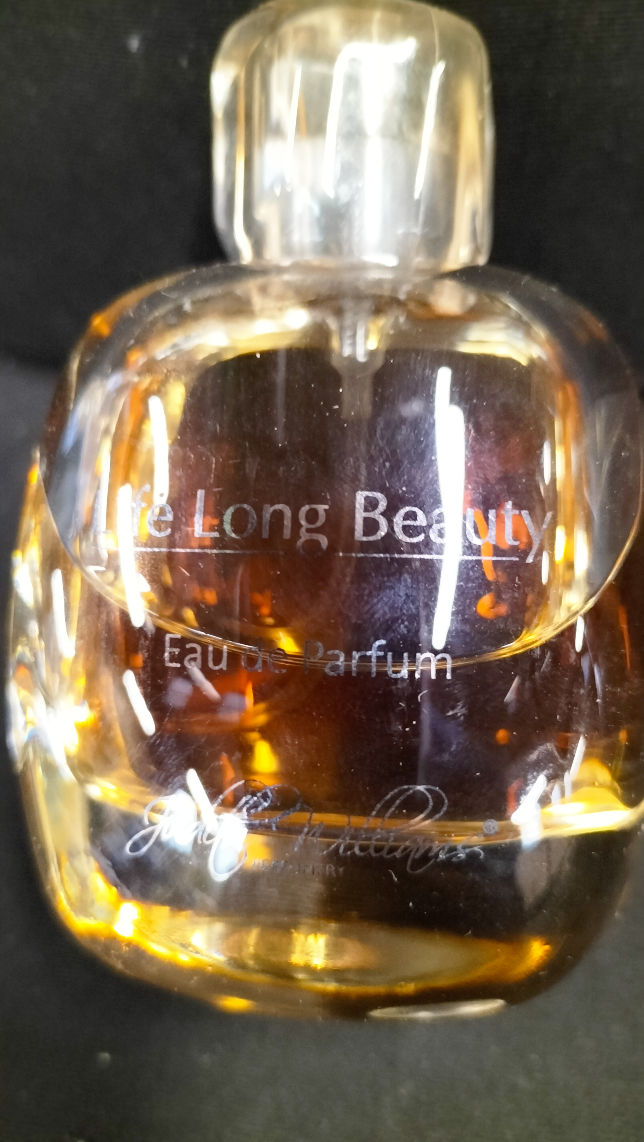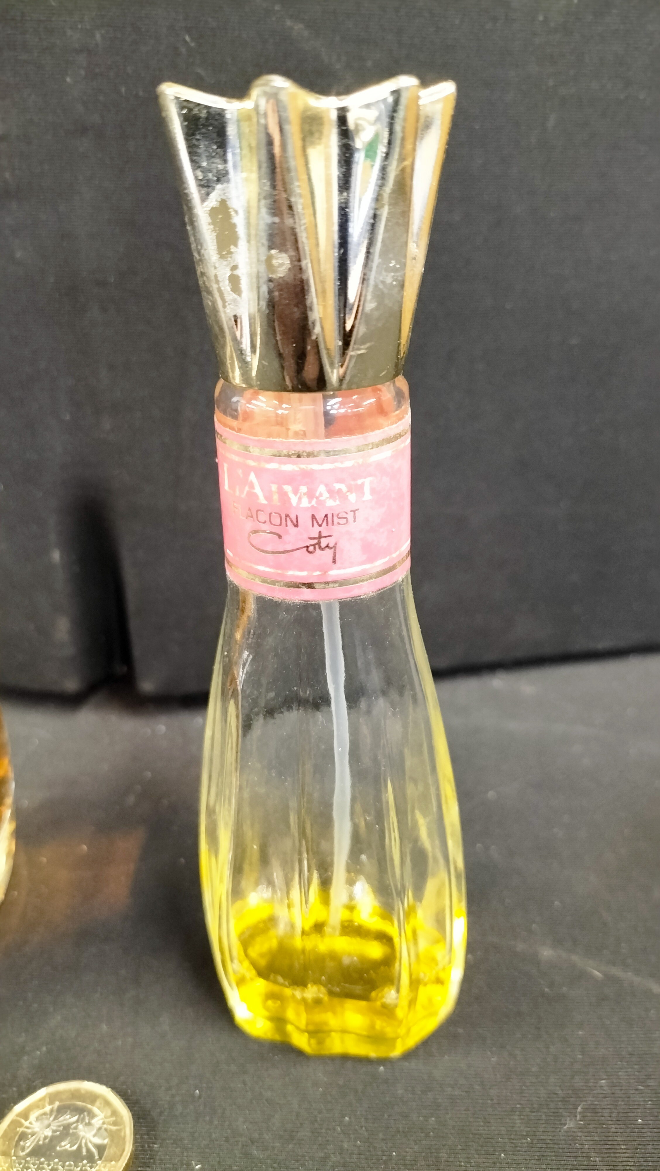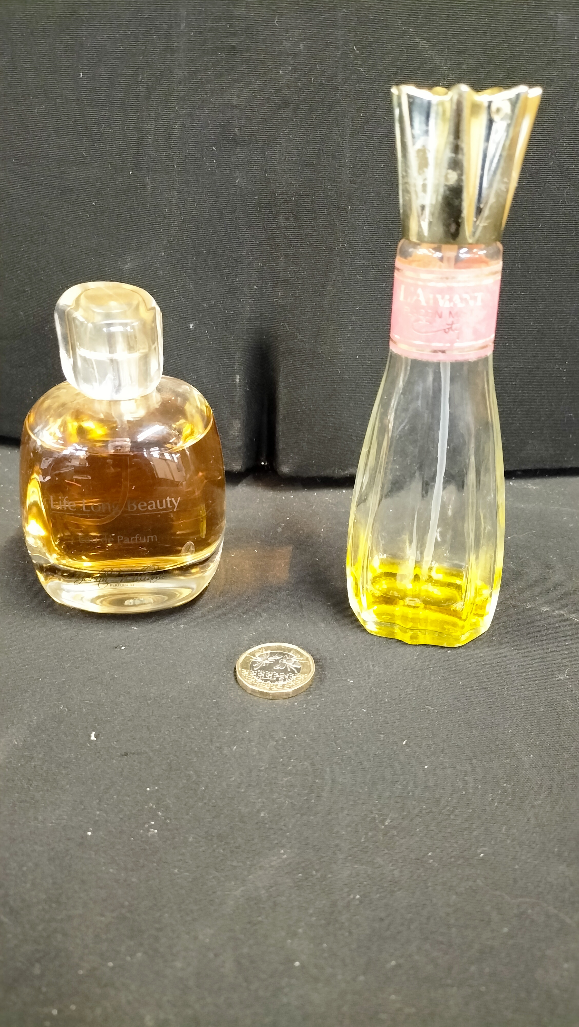 A collection of two glass perfume bottles of varying forms. The first is a Judith Williams Life Long Beauty Eau de Parfum, featuring a squat, rounded clear glass body with a clear rectangular cap. The bottle bears a printed inscription and a cursive signature for Judith Williams and contains a significant volume of amber-coloured liquid. The second is a Coty L’Aimant Flacon Mist, comprising a slender, faceted clear glass flacon with a pink label. The label is marked L’AIMANT / FLACON MIST / Coty. The bottle is fitted with a decorative gold-tone crown-shaped cap and contains a small amount of yellow-toned liquid. A British one-pound coin is present in the images for scale.