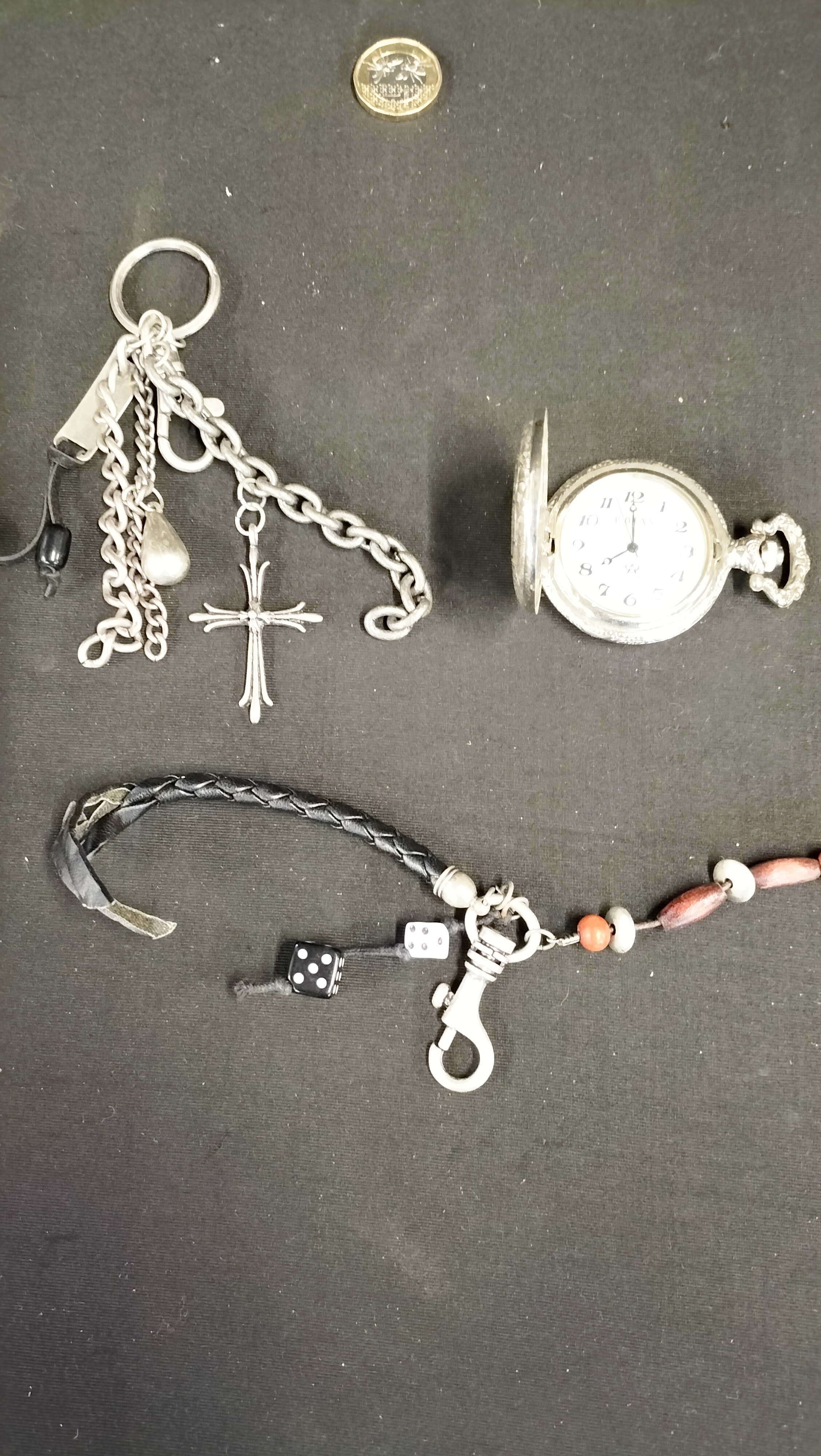 A trio of personal accessories comprising a pocket watch and two decorative chains. The full hunter pocket watch features a silver-tone base metal case with embossed floral and scrollwork motifs to the front and reverse. The white dial displays black Arabic numeral hour markers and decorative filigree hands, with branding present below the 12 o’clock position and a logo above the 6 o’clock position. The first accessory is a silver-tone multi-charm keychain, resembling Gothic styles, featuring a large split ring with suspended chains, a cross with fleur-de-lis terminals, a pear-shaped drop, a rectangular bar, and a black bead. The second accessory is a lanyard featuring a silver-tone bolt snap clip attached to a braided black leather-style cord, a strand of terracotta and cream-coloured beads, and two miniature dice charms on knotted cords.
