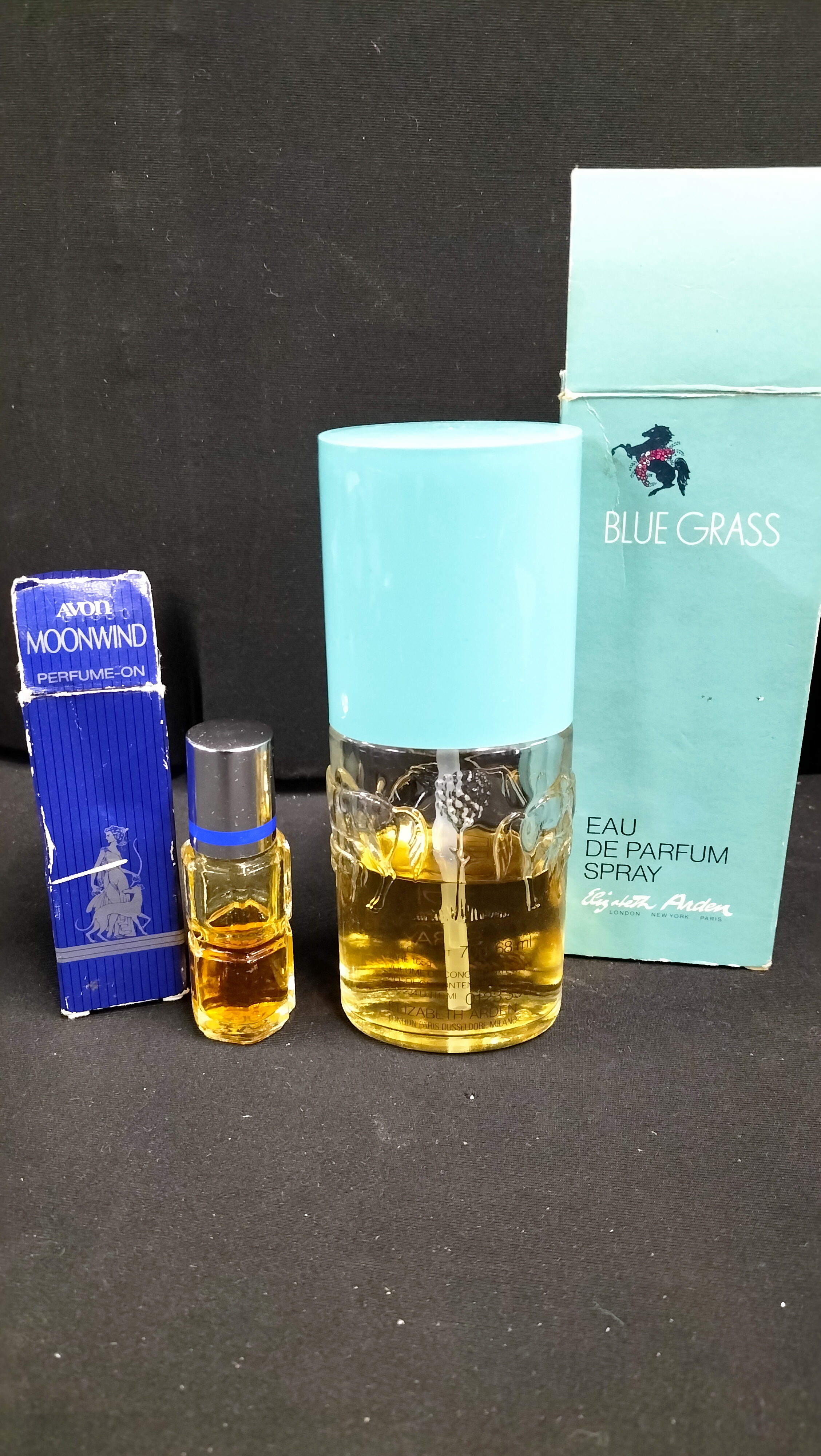 A collection of two vintage fragrance sets. The first is an Avon Moonwind Perfume-On applicator, featuring an octagonal glass bottle with a silver-tone plastic cap accented by a blue band. The original blue cardboard box is printed with the brand name, fragrance name, and a graphic of Diana the Huntress with a bow and greyhound. The second item is an Elizabeth Arden Blue Grass Eau de Parfum spray. The glass bottle features a moulded relief of a horse on the shoulder and is topped with a light blue plastic cap. The base of the bottle is marked Elizabeth Arden with locations including London, Paris, Dusseldorf, and Milano. The accompanying light blue cardboard box is printed with Blue Grass, Eau de Parfum Spray, and Elizabeth Arden in script, featuring a horse logo with floral accents.