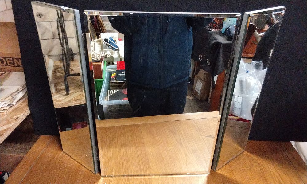 An Art Deco style tri fold dressing table mirror, likely dating from the mid 20th century. The mirror comprises a central rectangular panel flanked by two hinged, trapezoidal side panels. Each glass section features bevelled edges and is secured within a minimalist chrome plated metal frame. The panels are connected by metal hinges allowing for adjustable viewing angles. The reverse of the panels appears to be finished with a dark backing material. No maker marks or inscriptions are visible on the item.