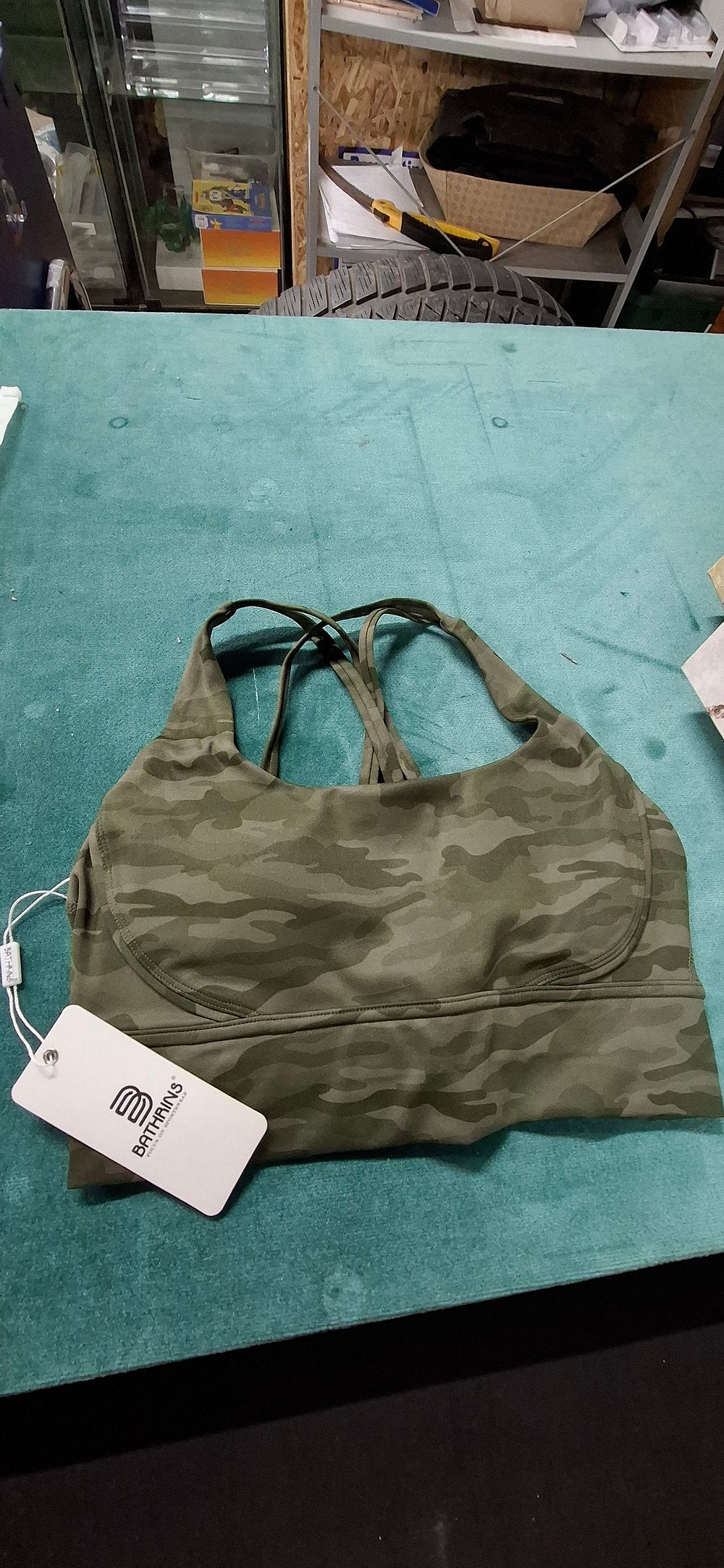 A women’s sports bra by the brand Bathrins, featuring an all-over camouflage motif in shades of olive, forest, and sage green. The garment is constructed from a matte synthetic performance fabric. The design includes a scoop neckline and a racerback configuration with four integrated thin straps. It features a wide supporting under-bust band with visible flatlock stitching. A white card hangtag is attached, printed with the logo and text BATHRINS FOCUS ON SPORTSWEAR. No internal size or care labels are visible.