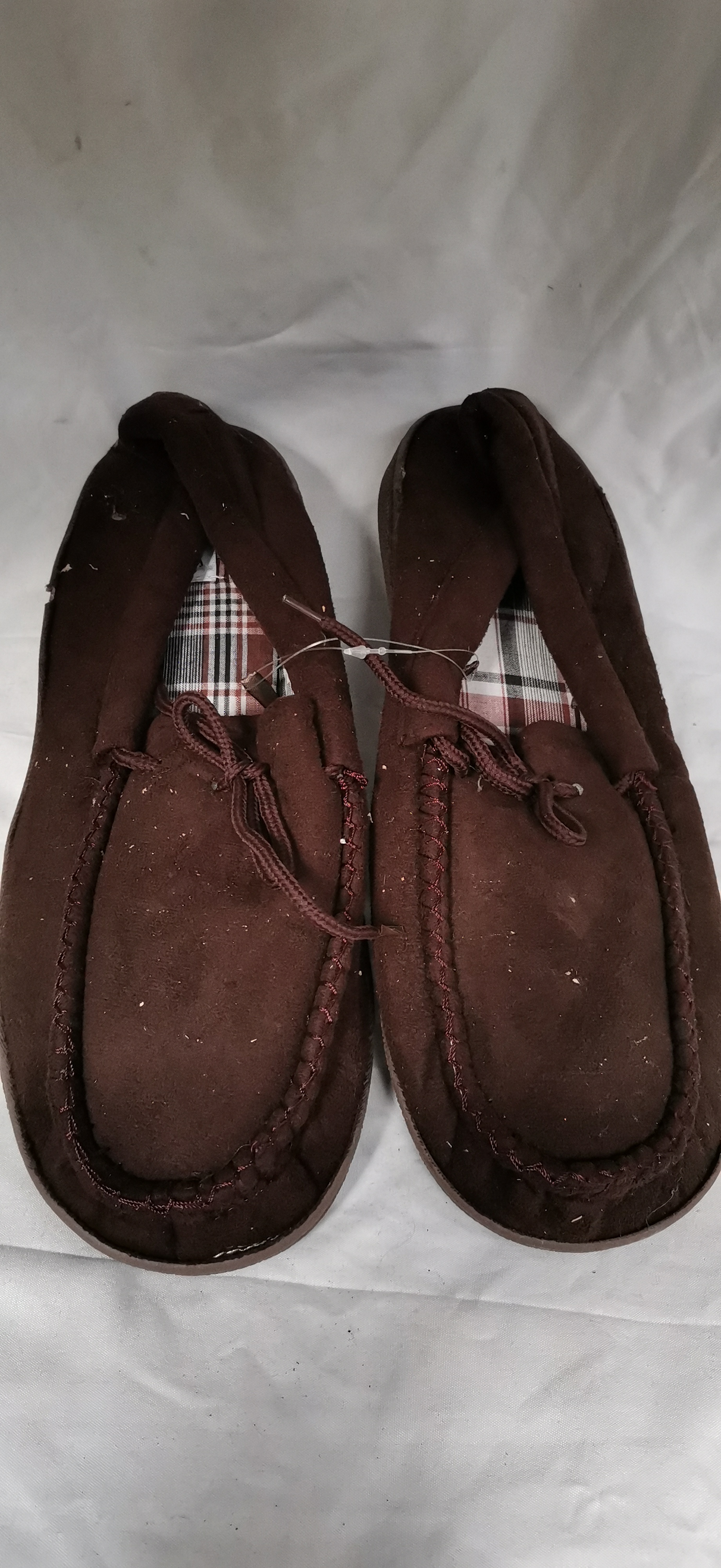 A pair of men's synthetic suede moccasin slippers, size UK 10