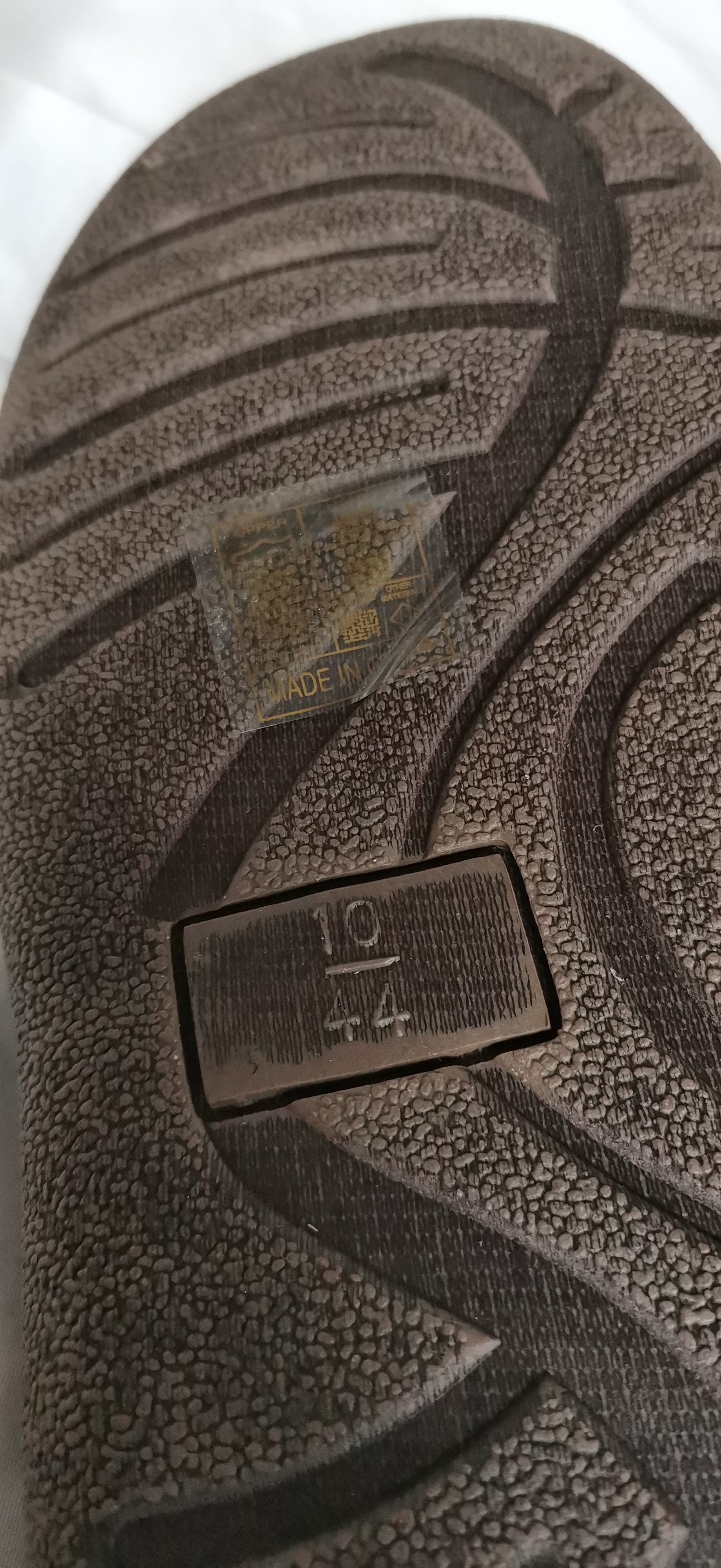 A pair of men’s moccasin-style slippers featuring dark brown synthetic suede-effect uppers. The design includes decorative bow detailing to the front and visible perimeter stitching. The interior is lined with a red, black, and white plaid textile. The slippers are fitted with flat, textured synthetic soles. Size markings on the sole indicate a UK size 10 (EU 44). A partially-peeled adhesive label on the sole states MADE IN CHINA and OTHER MATERIALS.