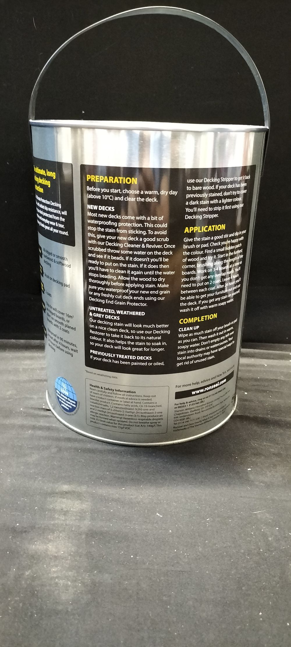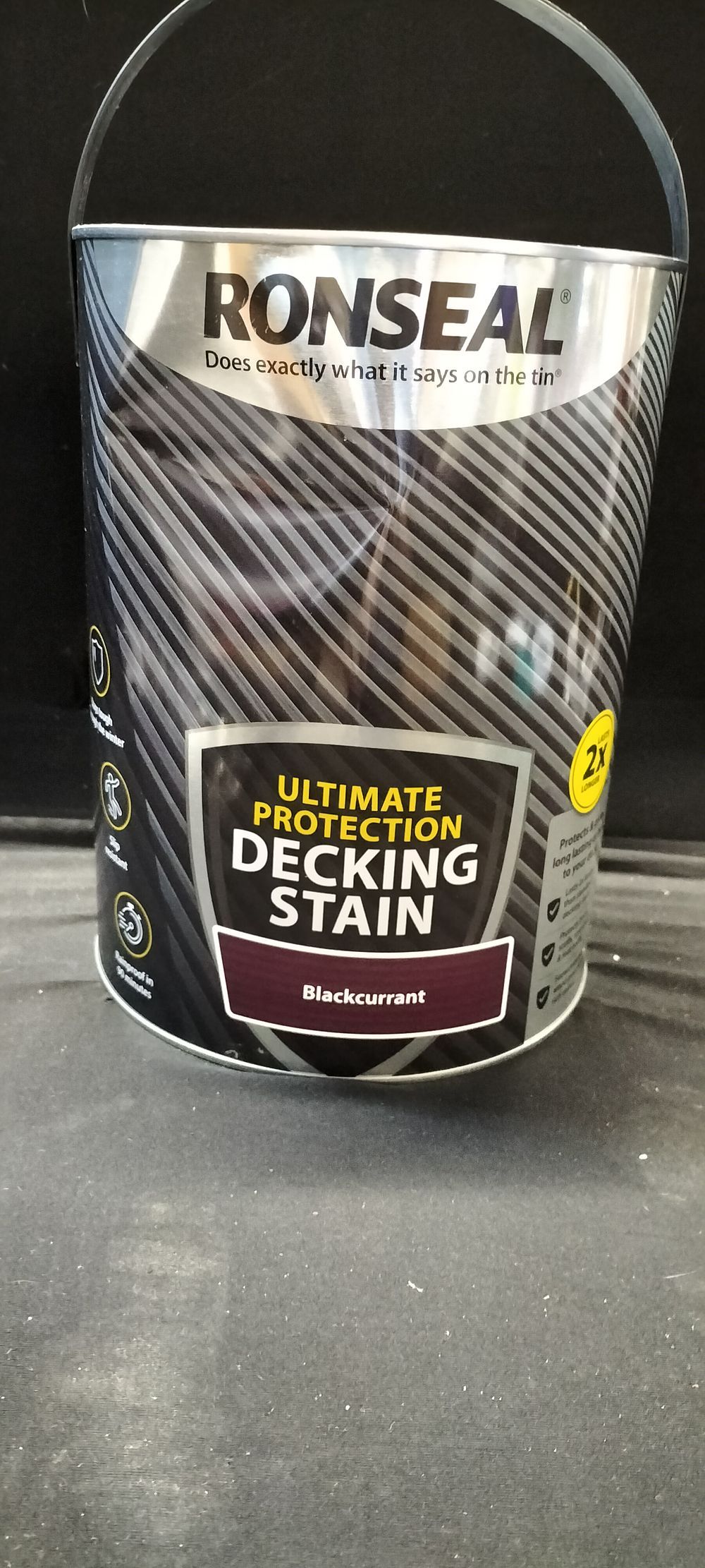 A single metallic and black tin of Ronseal Ultimate Protection Decking Stain in the colour blackcurrant.