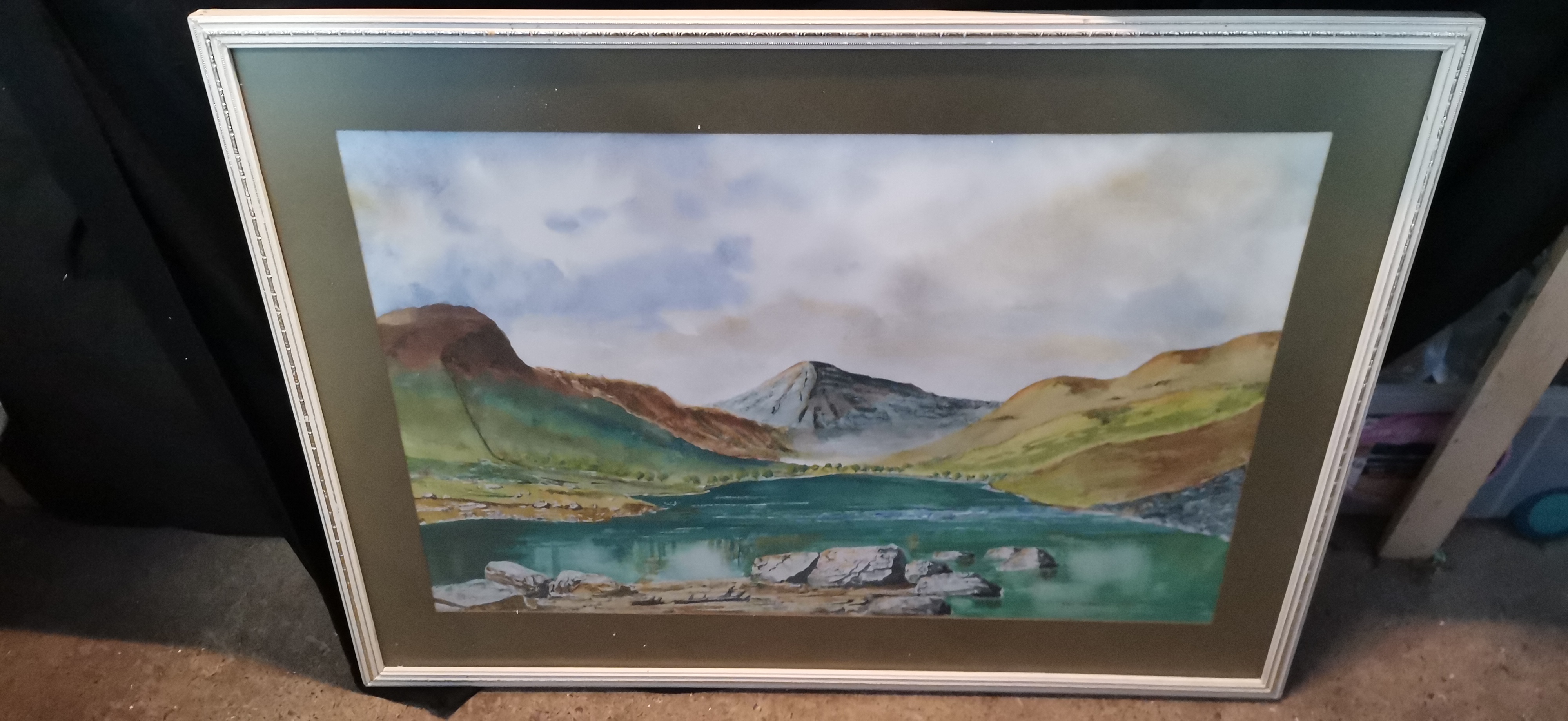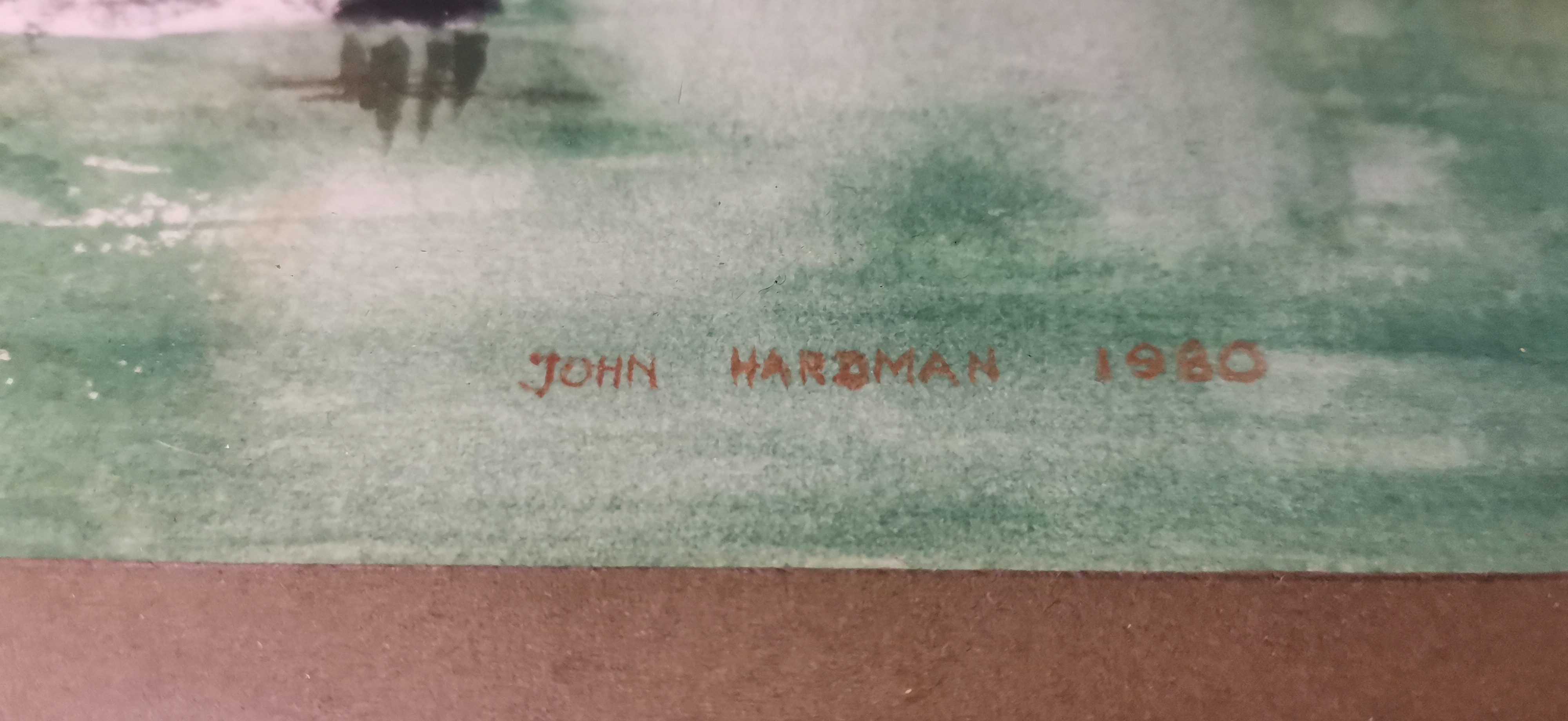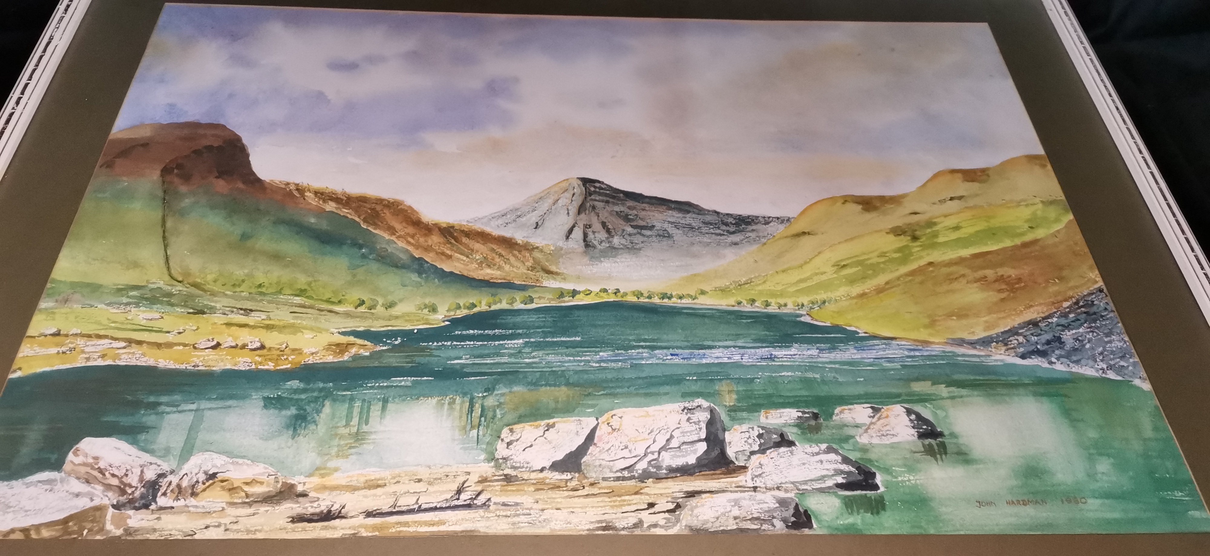 A framed watercolour landscape painting depicting a mountain lake scene in shades of green, brown, and blue, signed and dated John Hardman 1980.