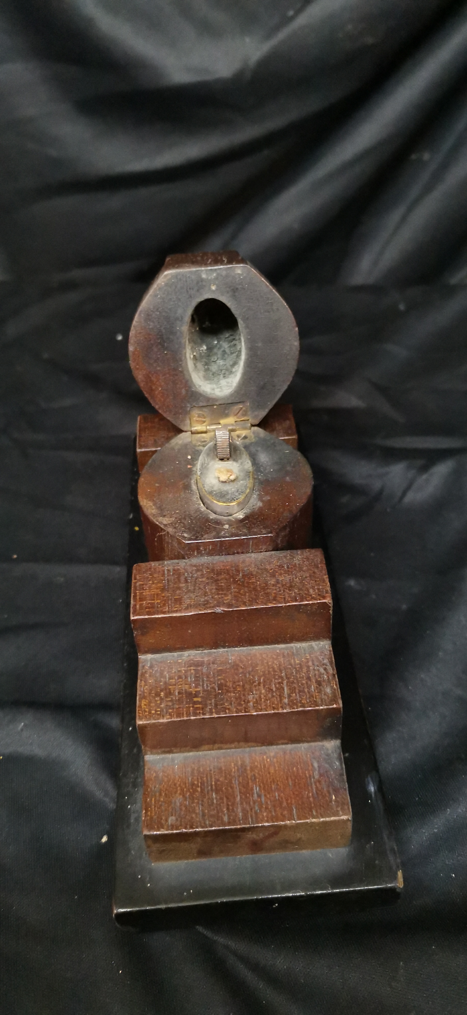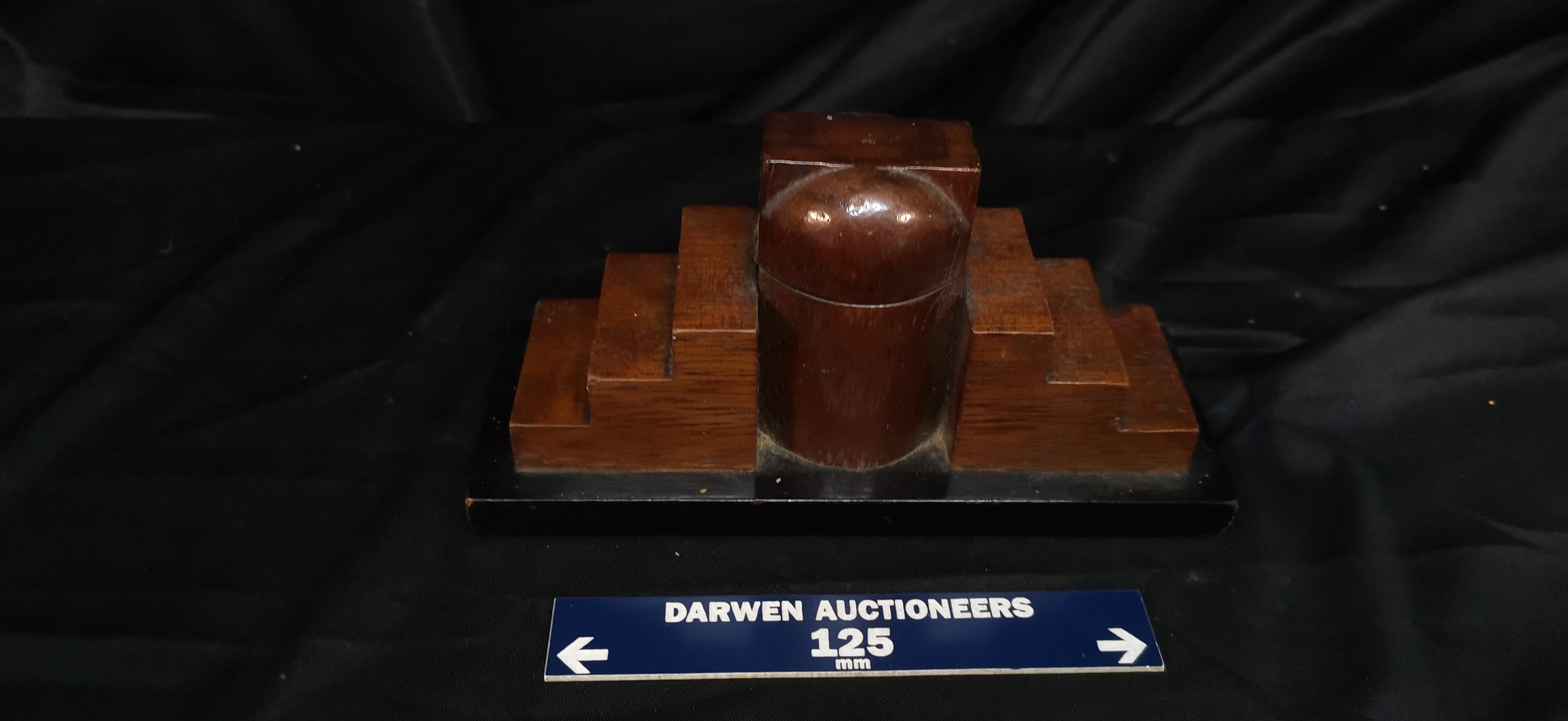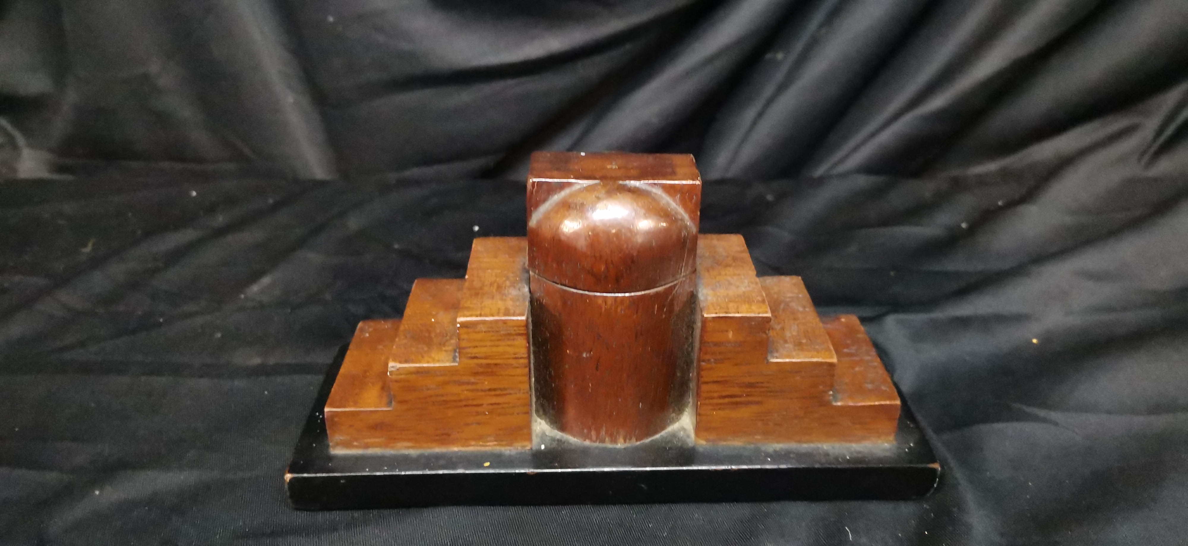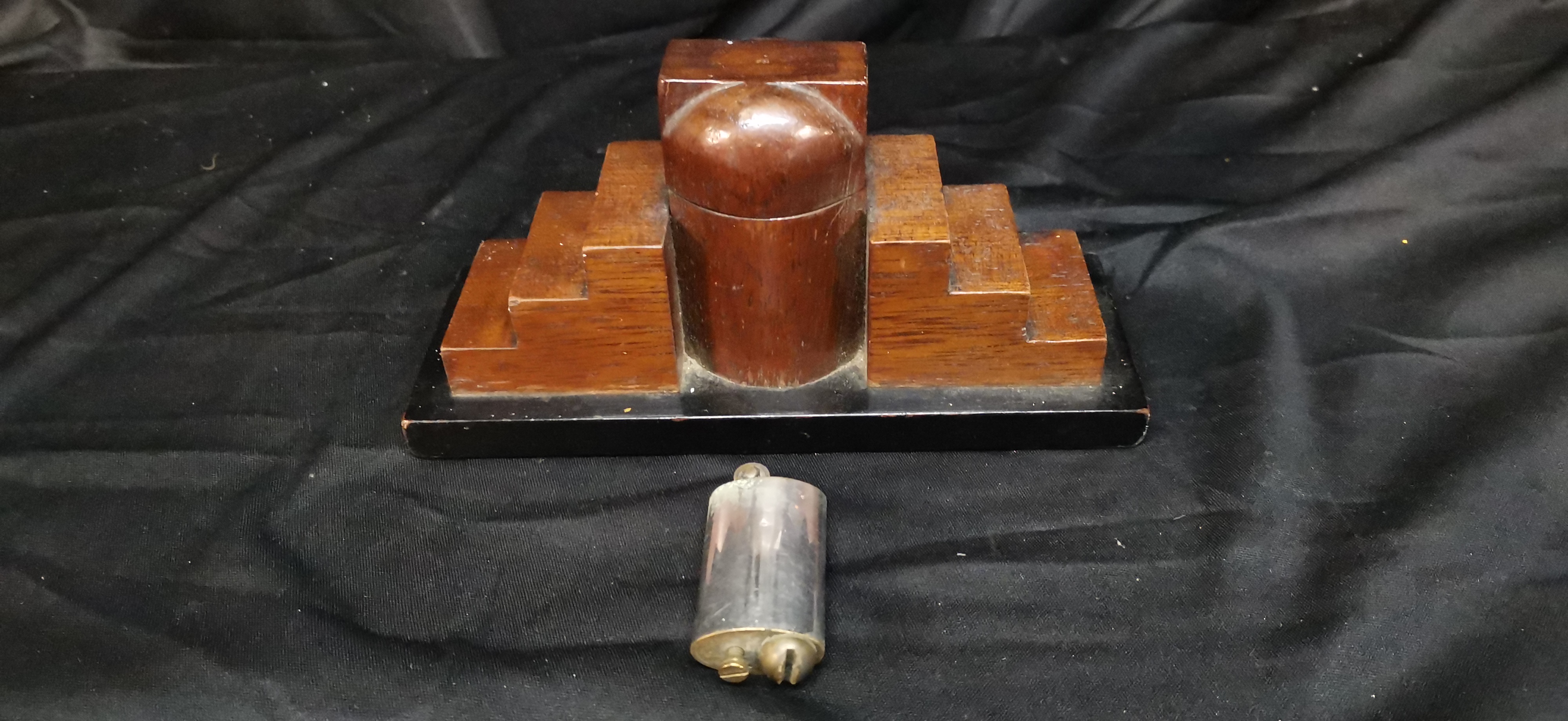 An Art Deco style stepped table lighter base in brown and black wood with a silver-coloured metallic insert, measuring approximately 125mm in length.