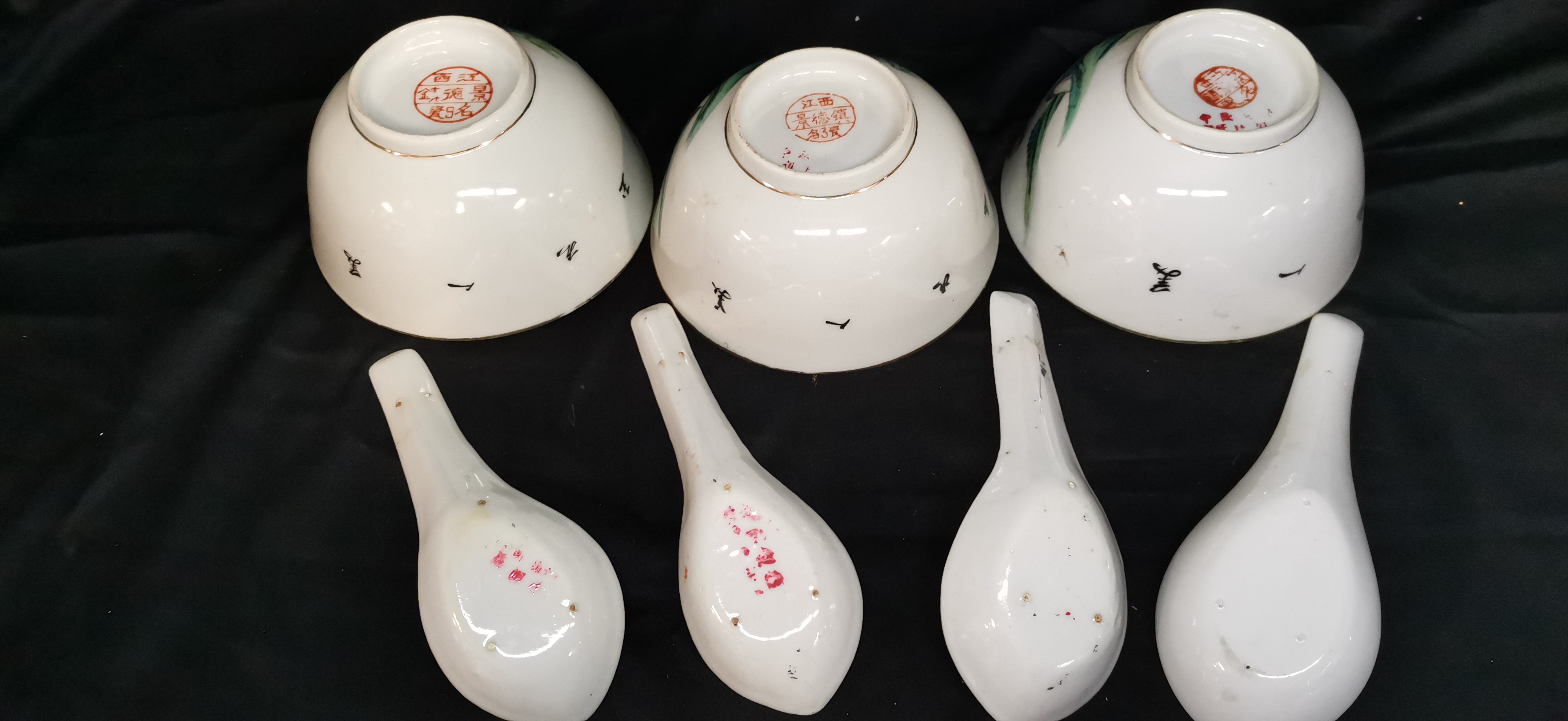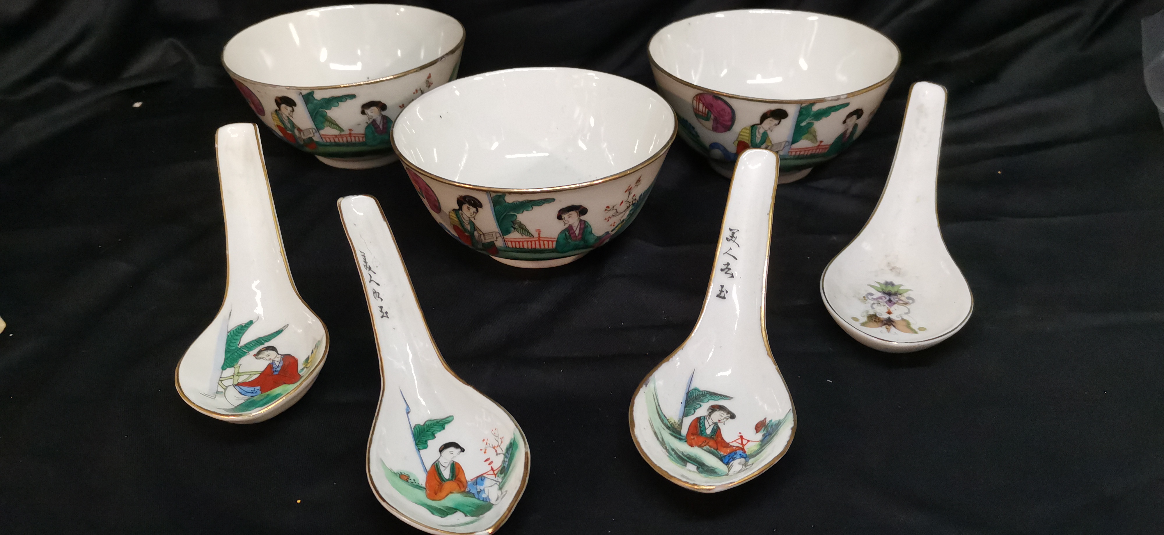 A collection of white ceramic bowls and spoons featuring hand-painted multi-coloured figurative scenes, gold-toned rims, black calligraphic text, and red circular maker’s marks to the bases.
