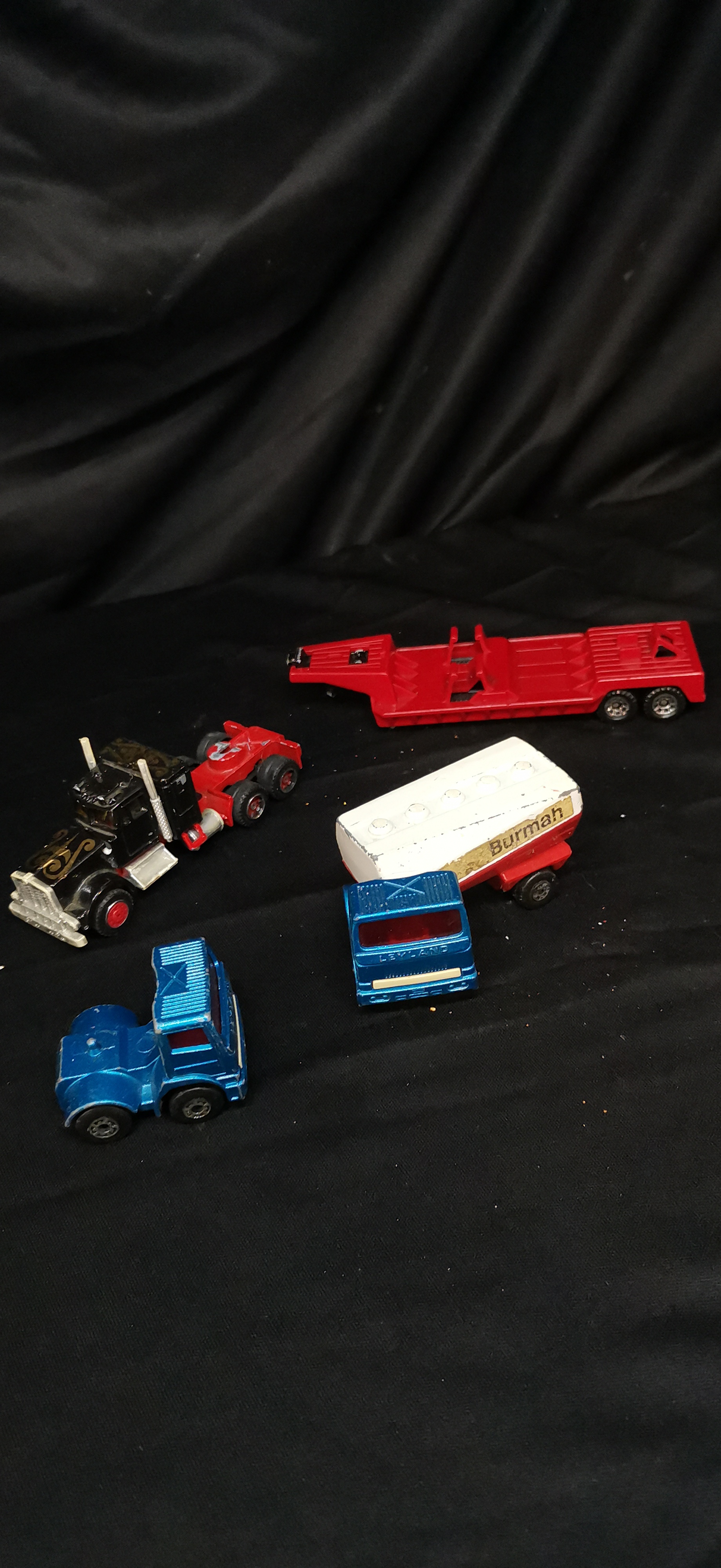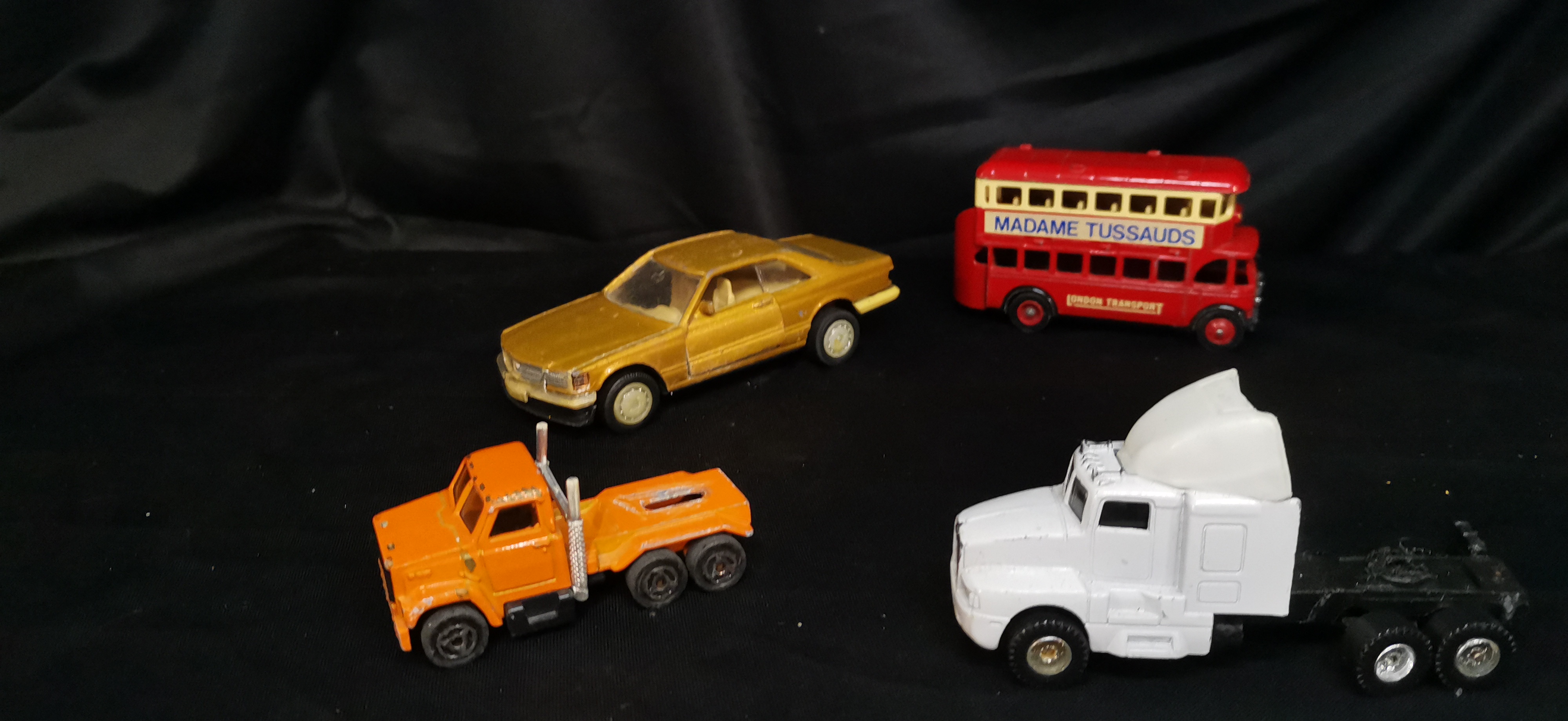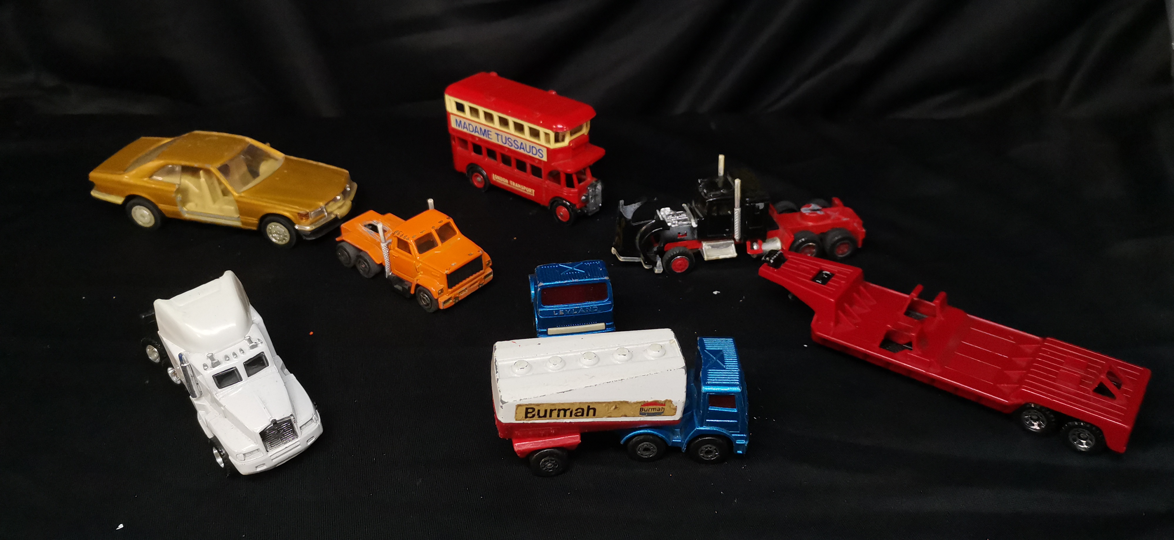 A collection of multi-coloured die-cast toy vehicles including a Madame Tussauds London Transport bus, a Burmah tanker, a Leyland truck cab, and various other lorries and a car.