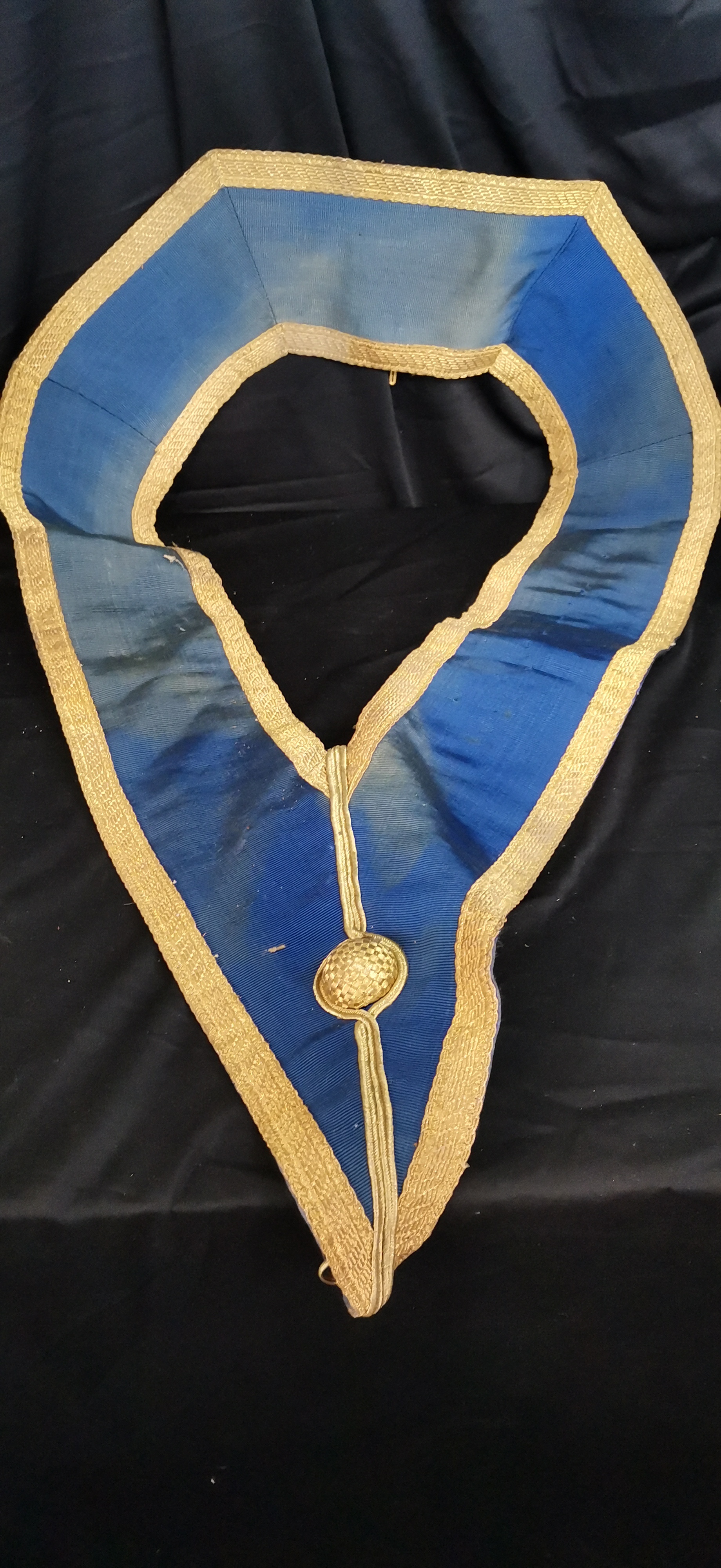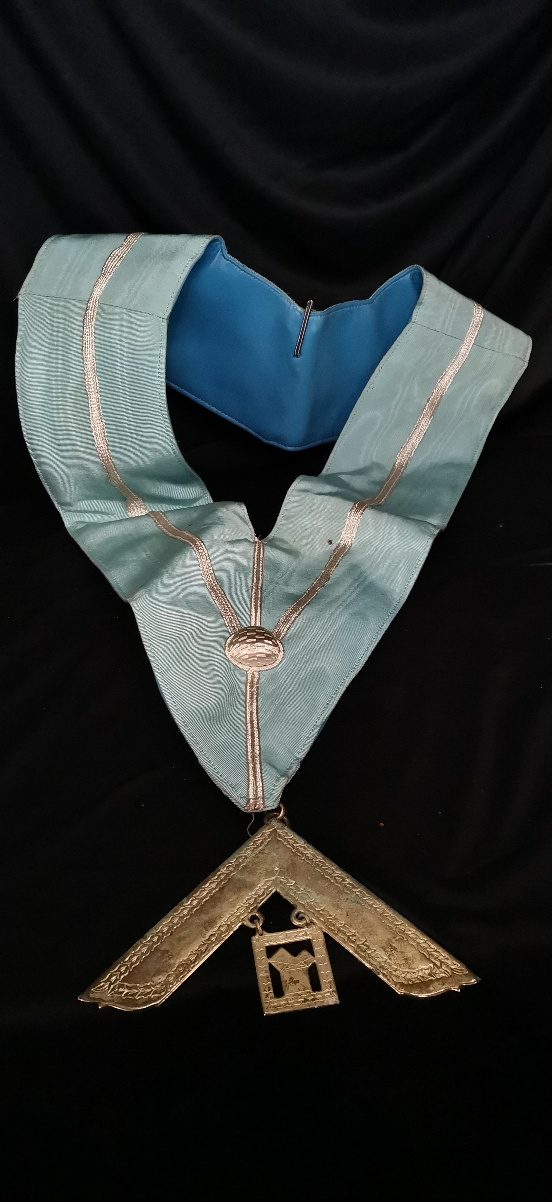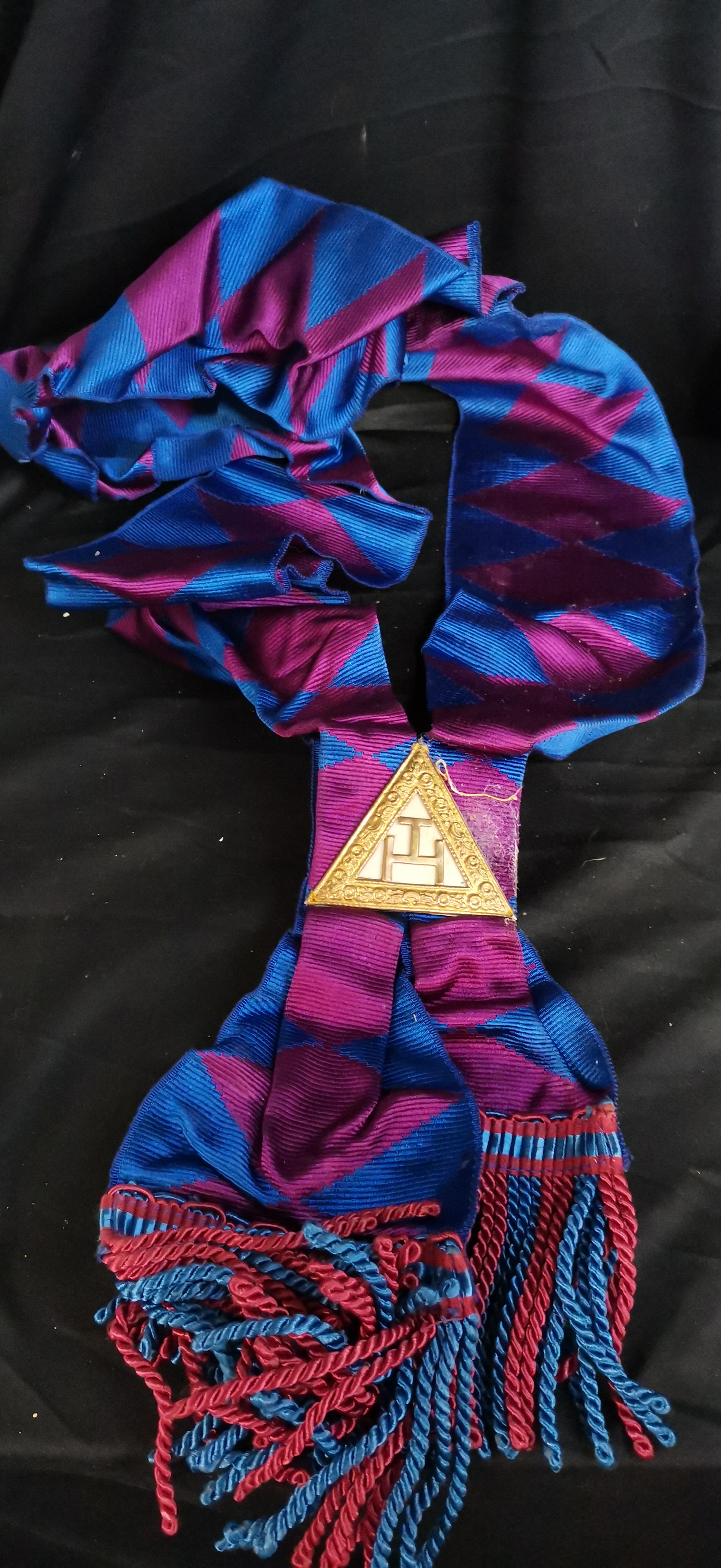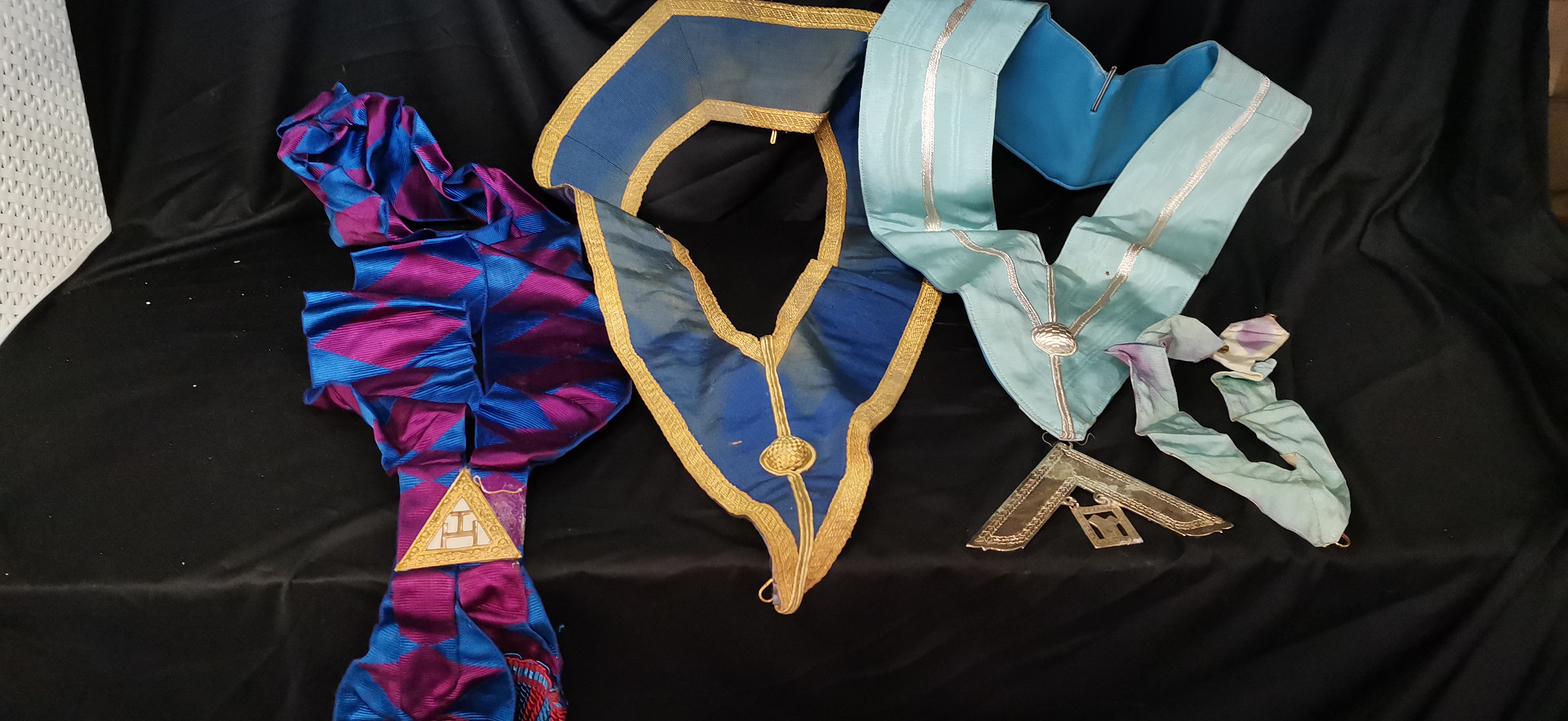 A collection of Masonic regalia including purple and blue diamond patterned sashes with metallic fringe and turquoise collarettes featuring silver-toned metal emblems.