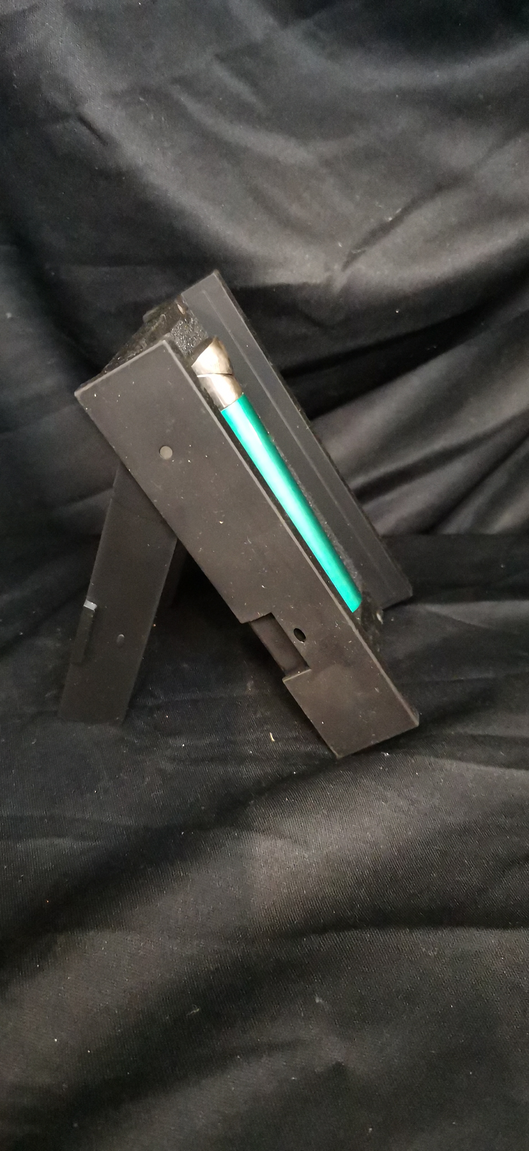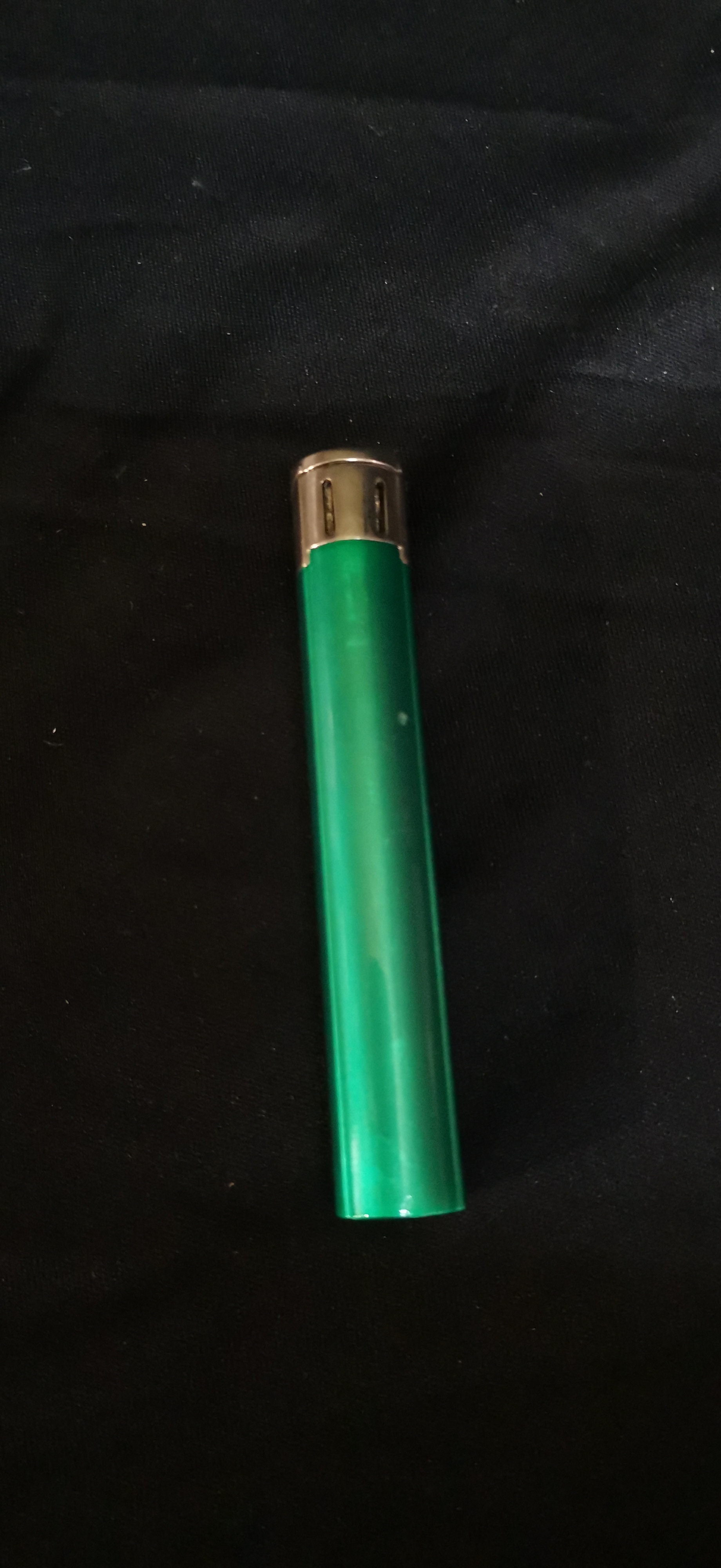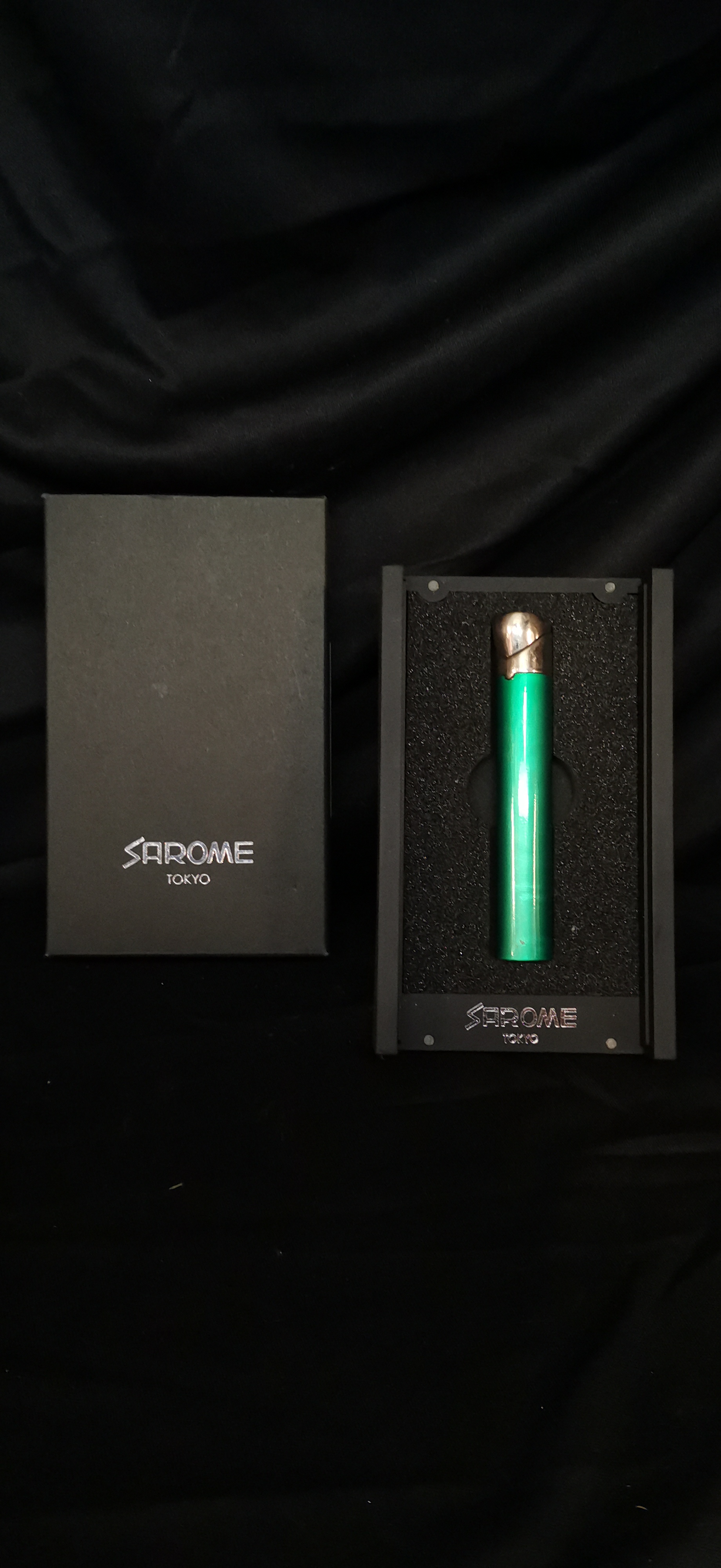 A green and silver-toned Sarome Tokyo slim pocket lighter presented in its original black branded display box and case.