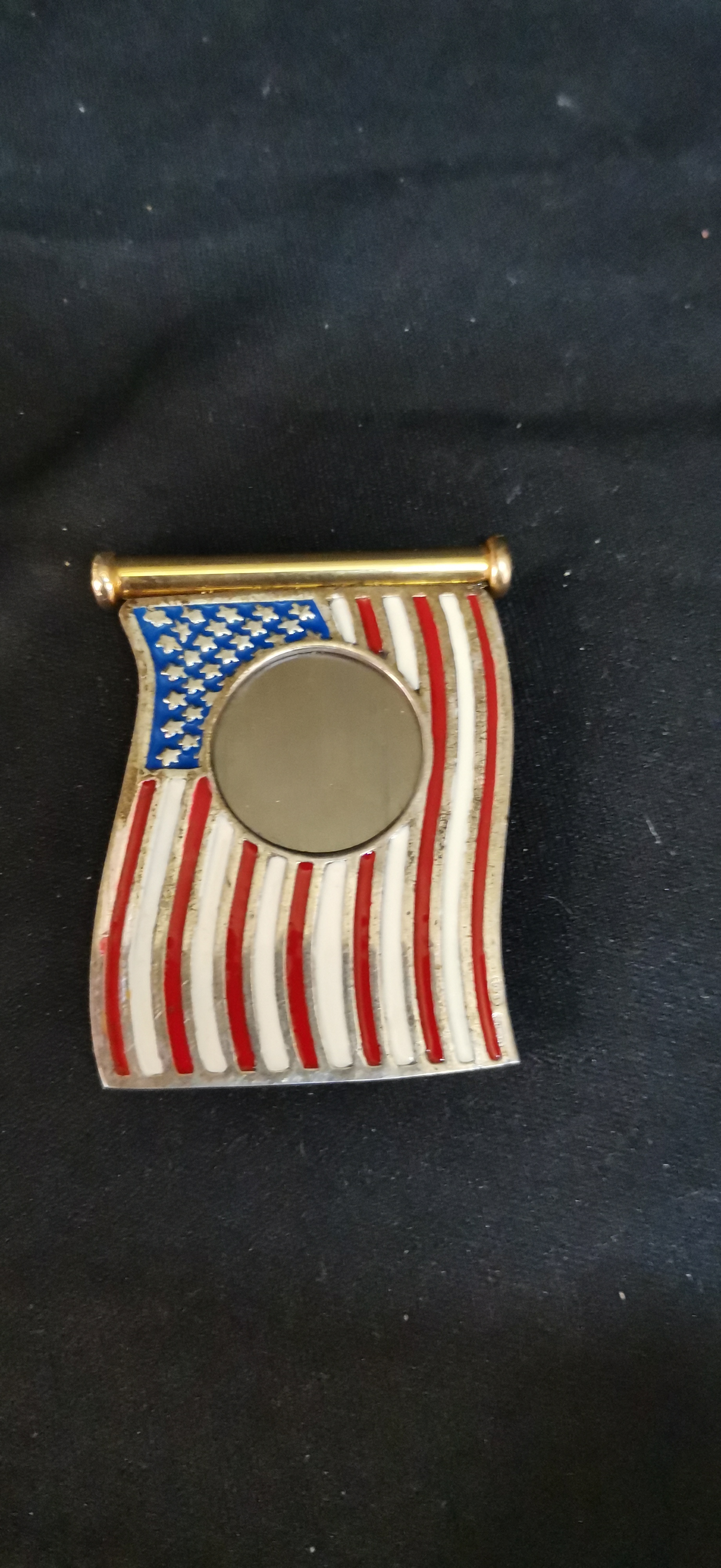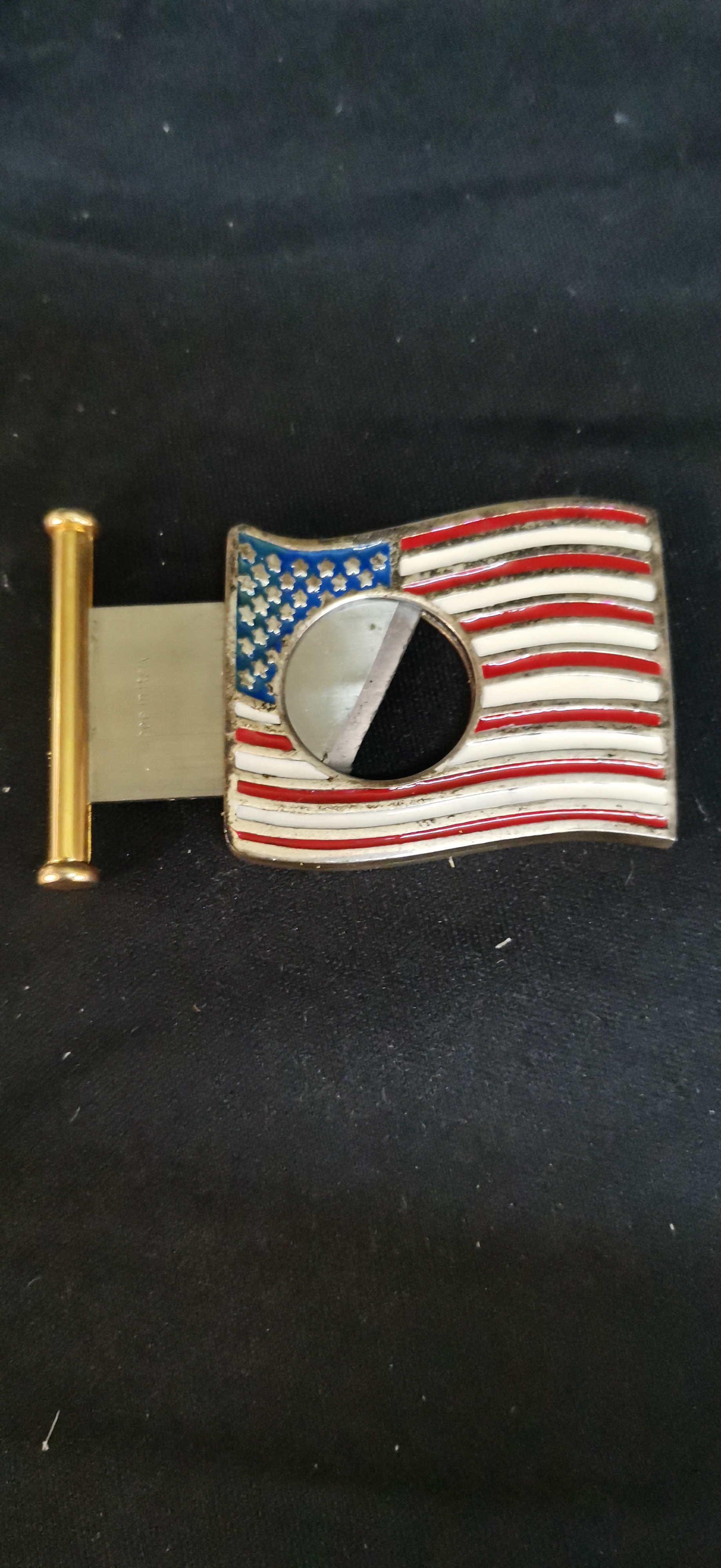 A Lubinski cigar cutter featuring an American flag design in red, white, and blue enamel with gold-tone accents, made in Italy and presented in its original branded green box.