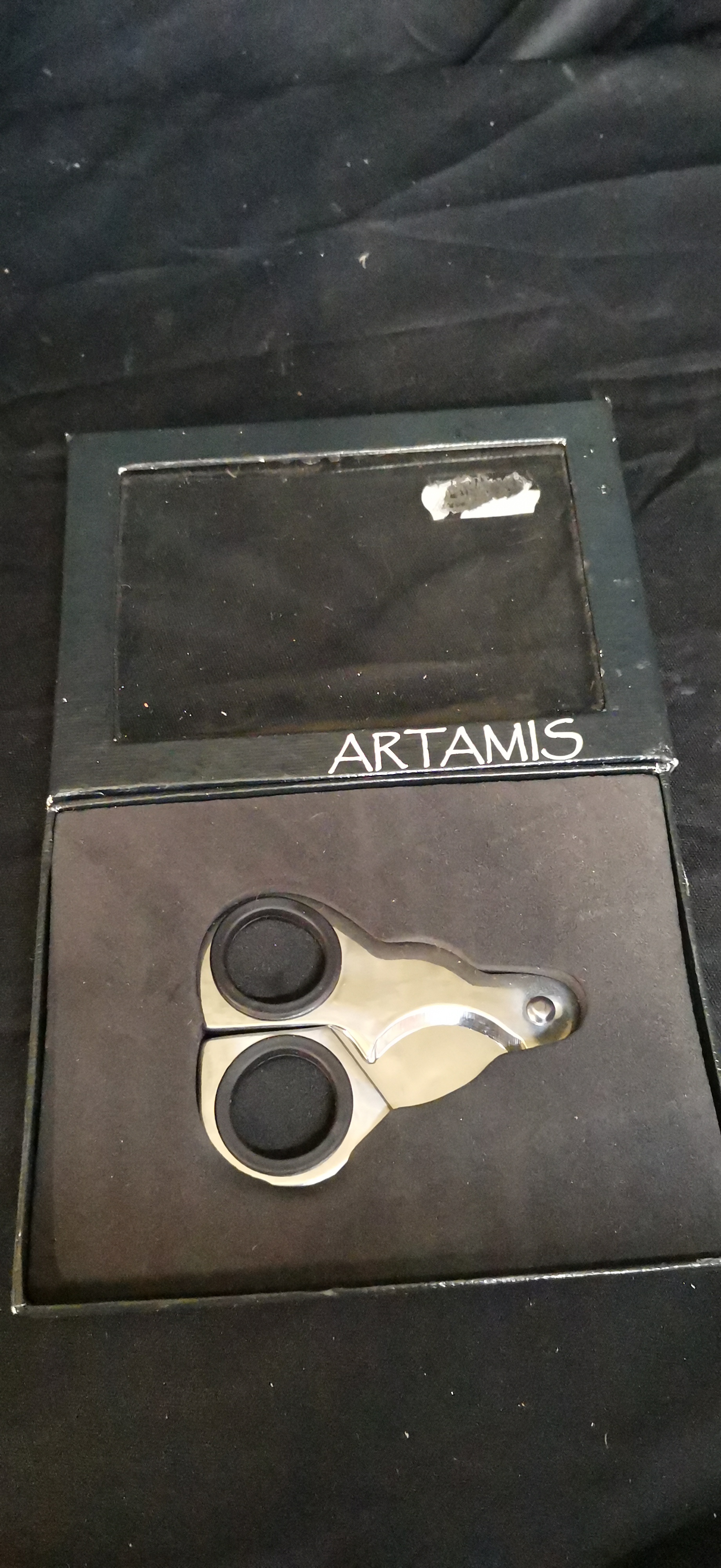 A silver-toned and black stainless steel scissor-style cigar cutter with rubber grips, presented in its original Artamis branded display box.