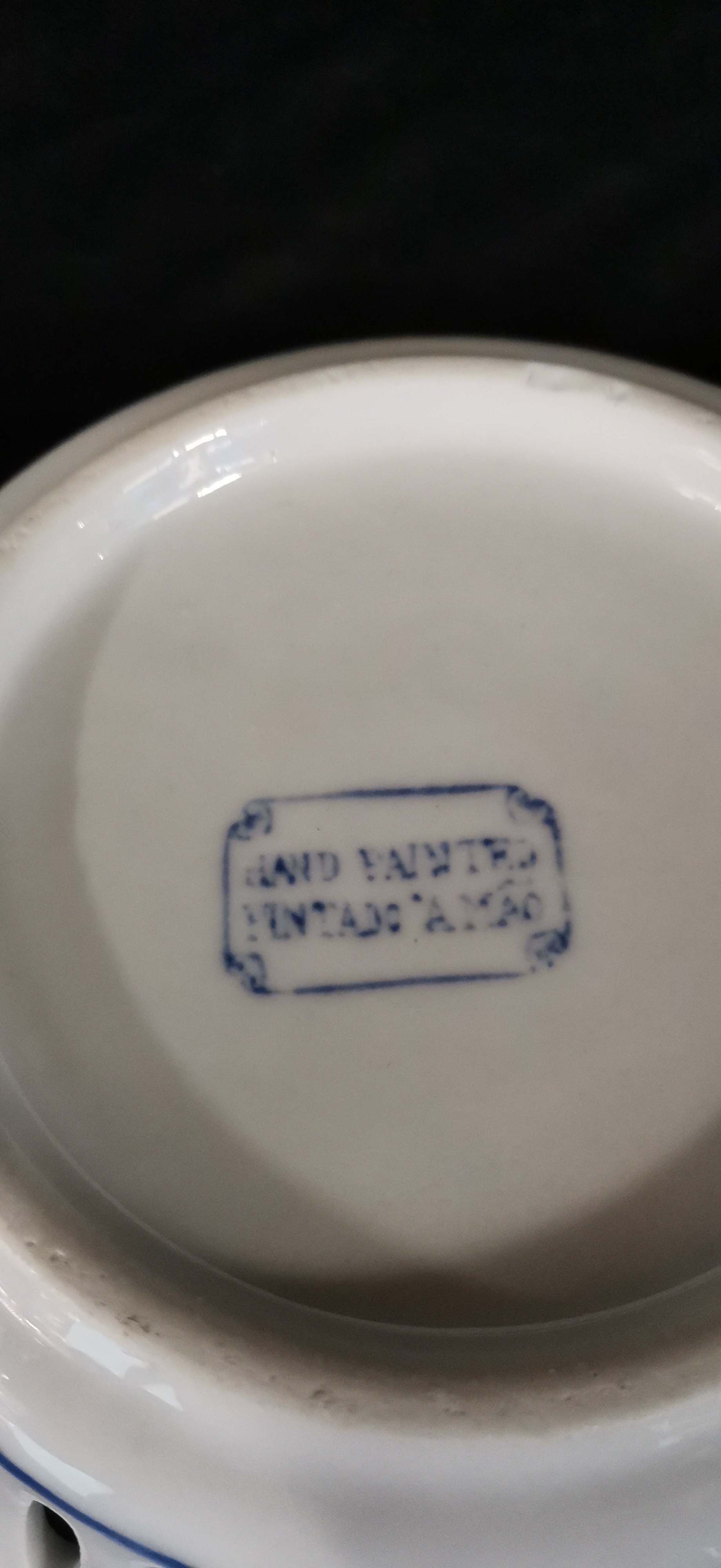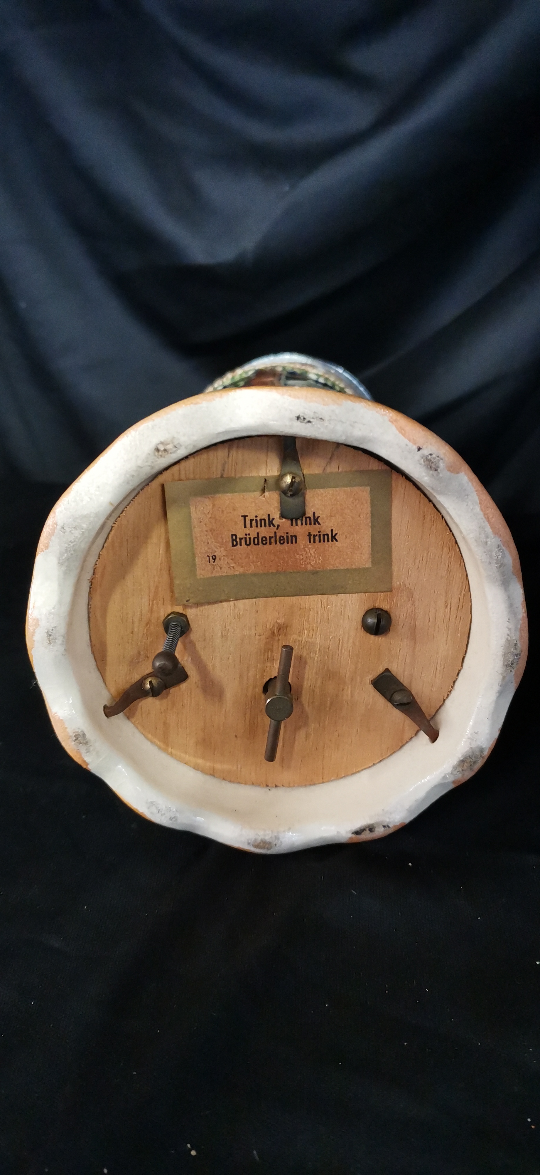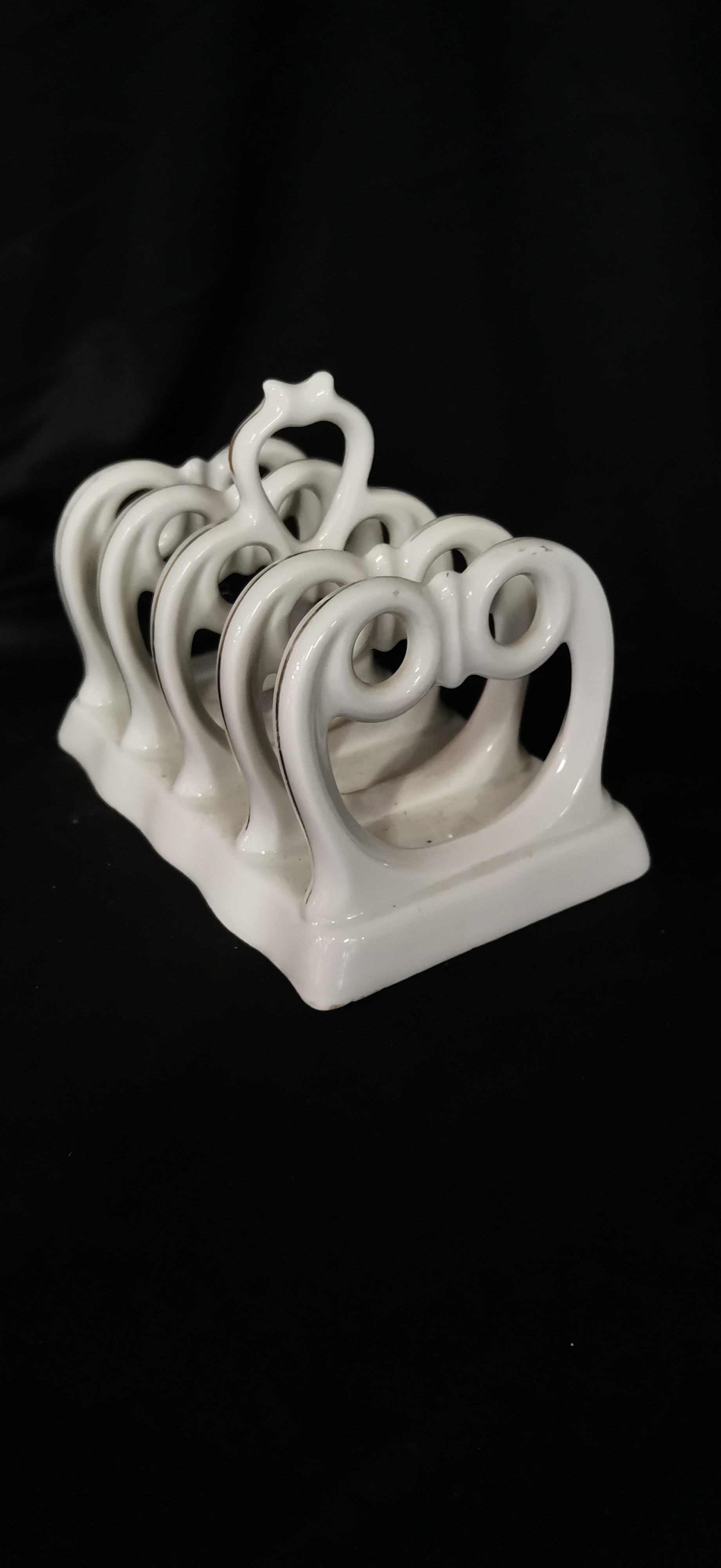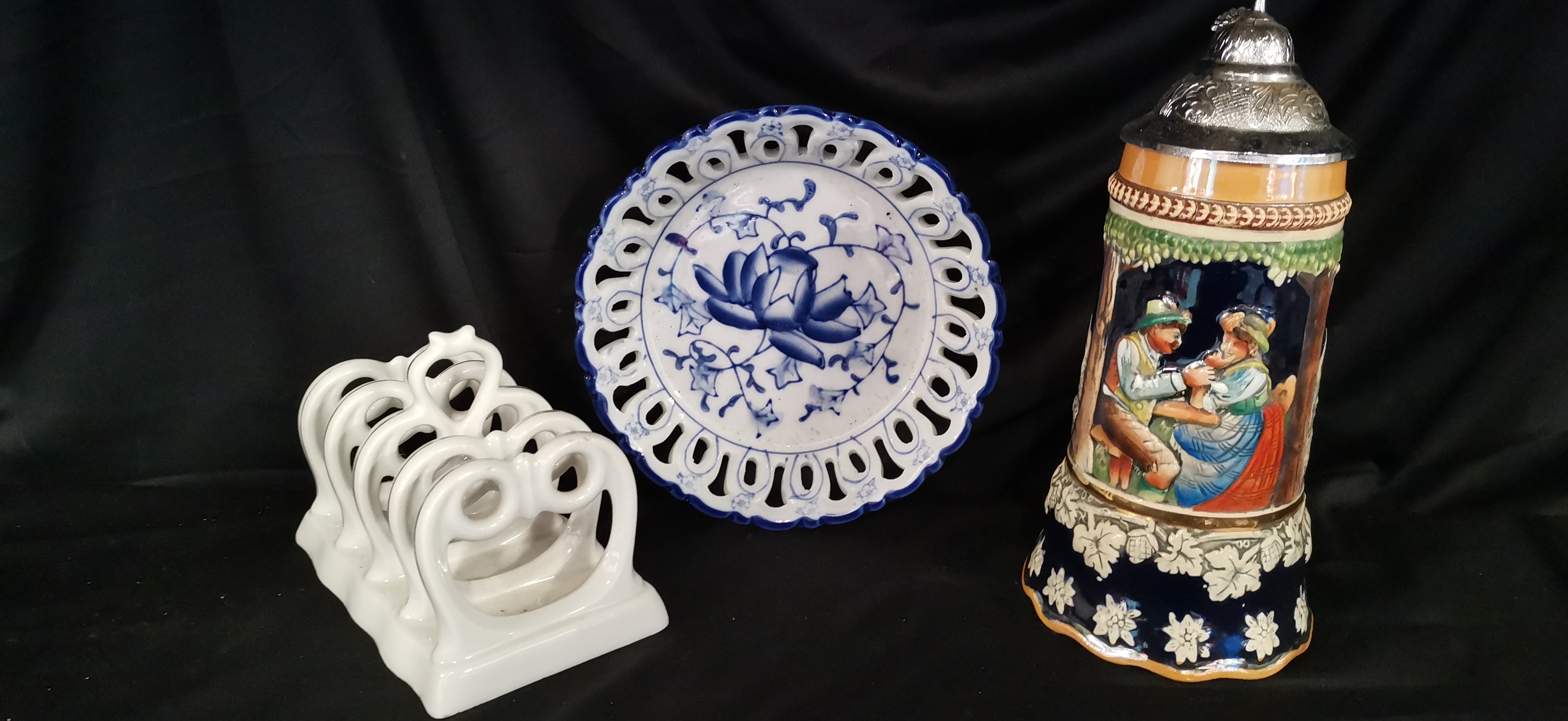 A white Victoria Czecho-Slovakia ceramic toast rack, a blue and white hand-painted reticulated plate marked Pintado a Mao, and a multi-coloured musical beer stein featuring a Trink trink Bruderlein trink label.