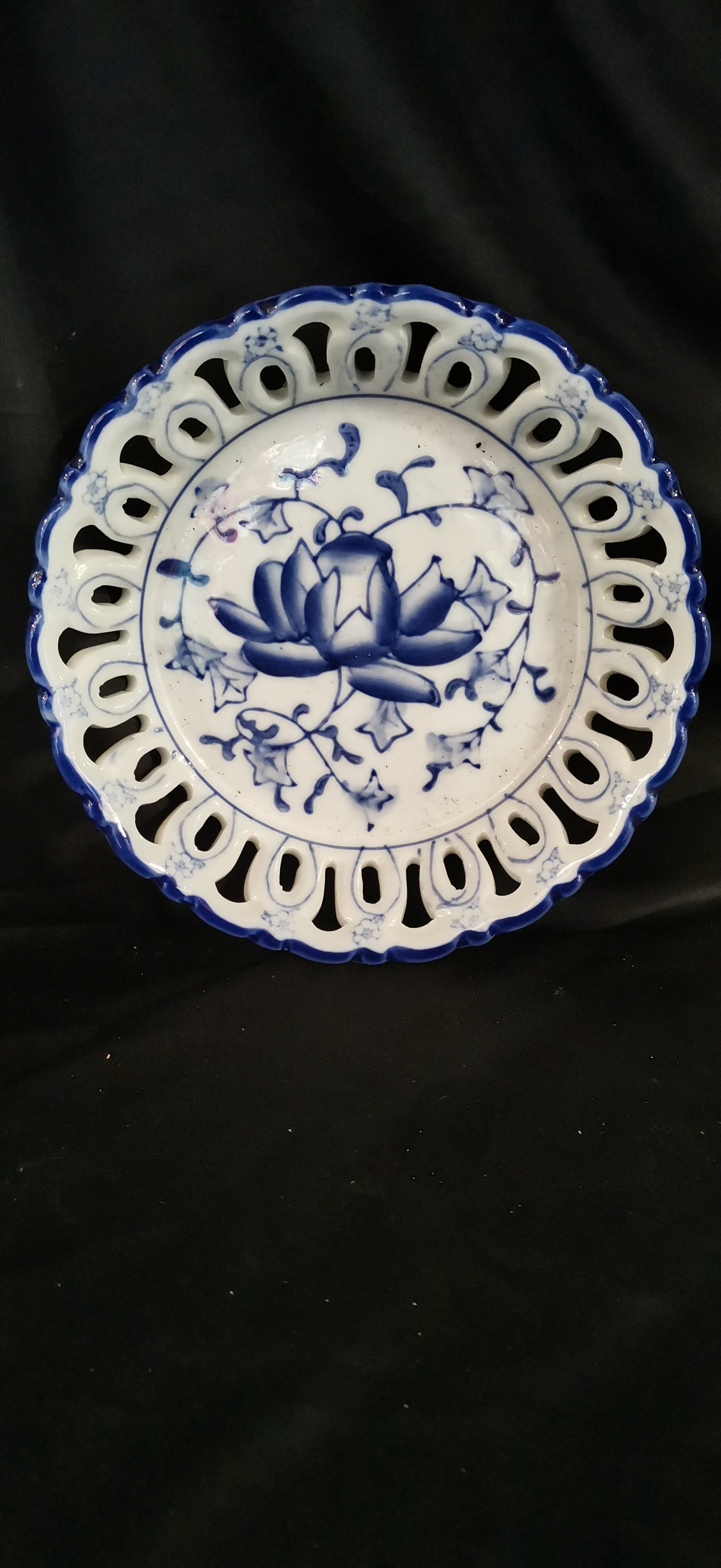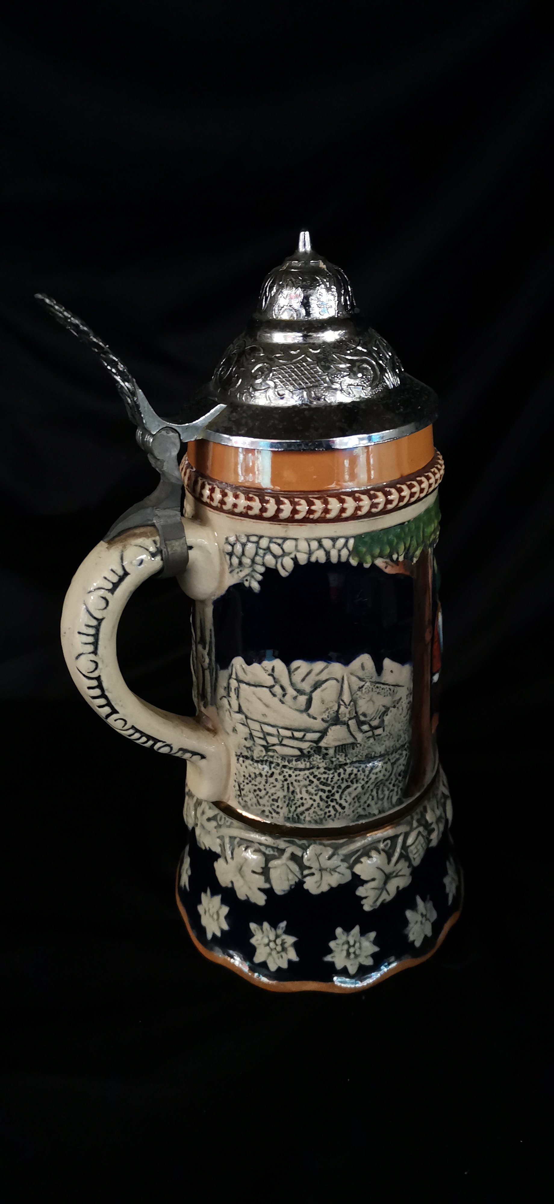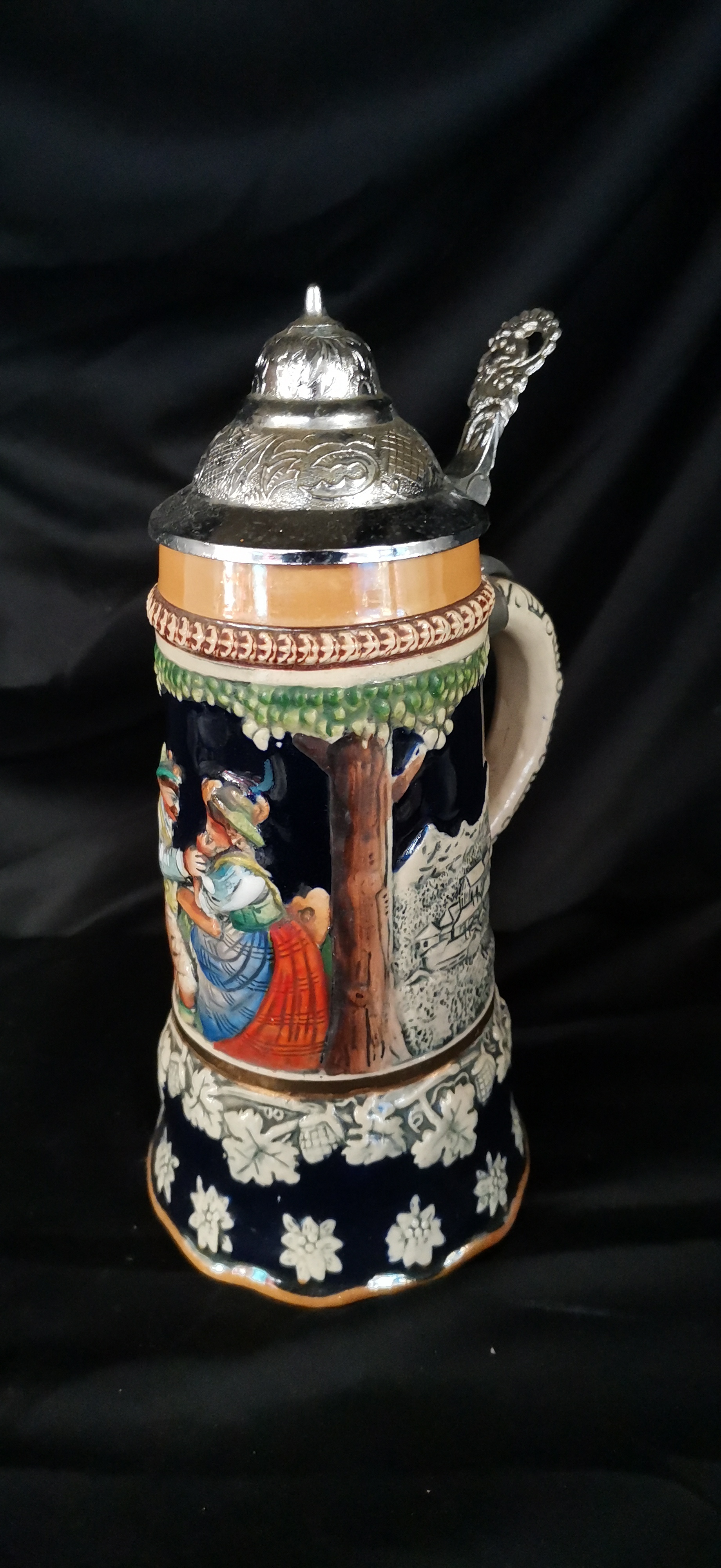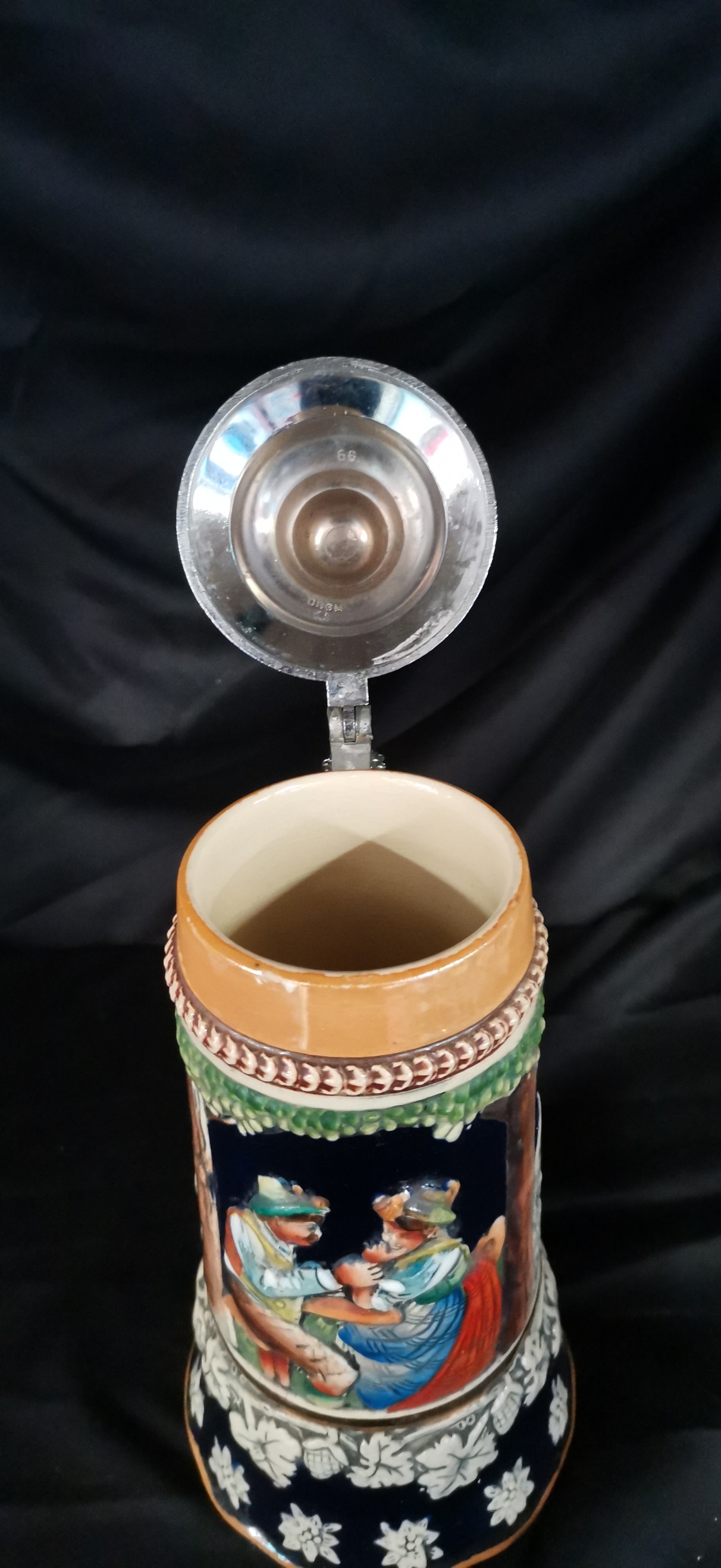 A white Victoria Czecho-Slovakia ceramic toast rack, a blue and white hand-painted reticulated plate marked Pintado a Mao, and a multi-coloured musical beer stein featuring a Trink trink Bruderlein trink label.