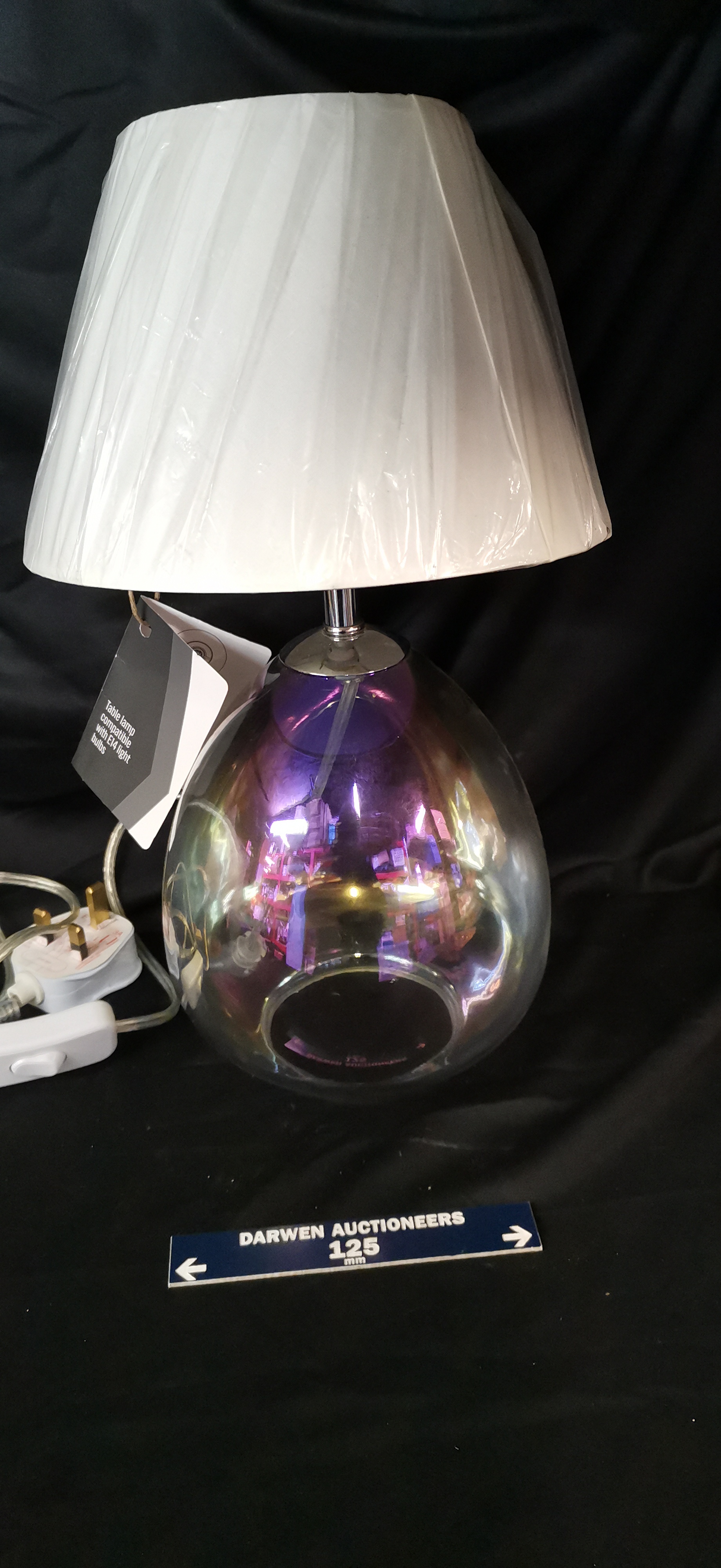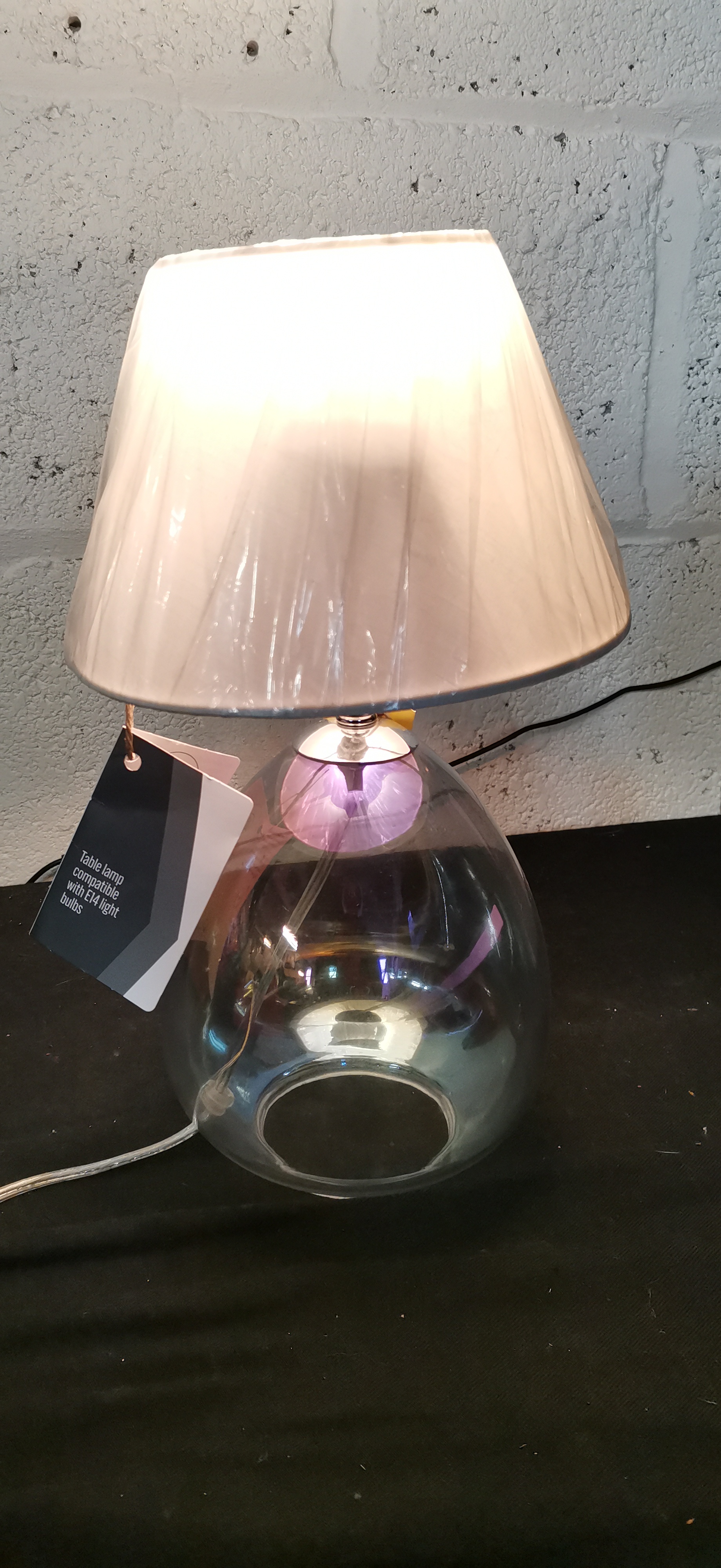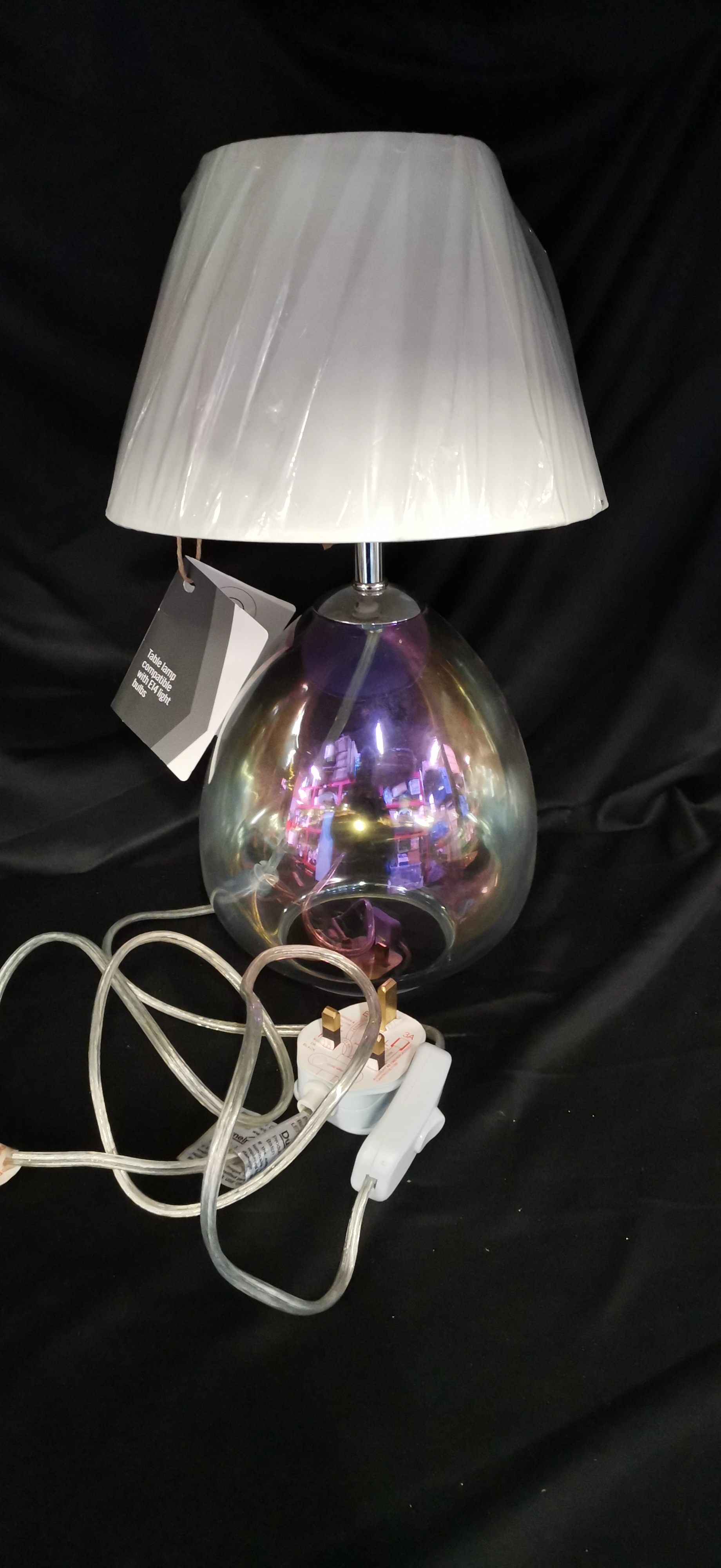 A table lamp featuring an iridescent teardrop-shaped glass base and a pleated white shade, compatible with E14 light bulbs.