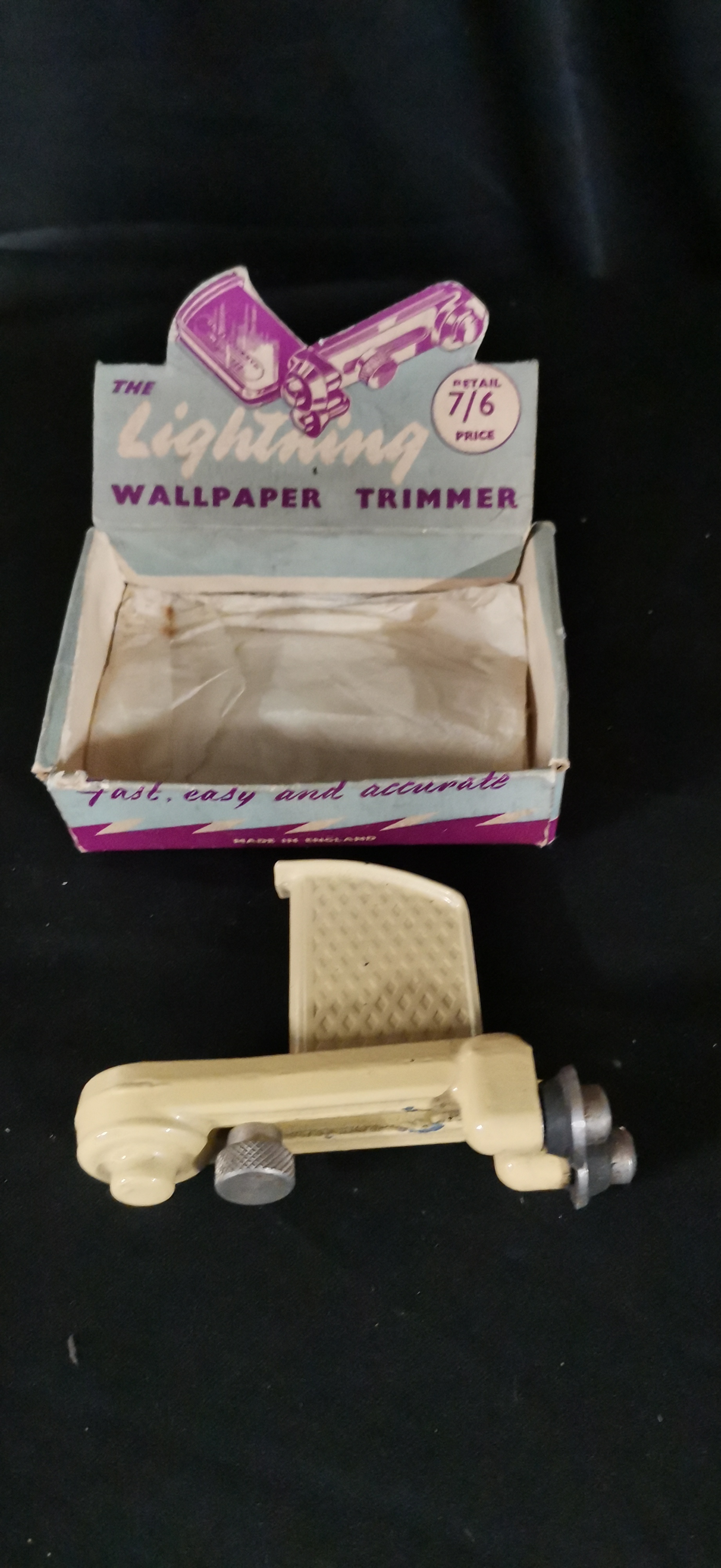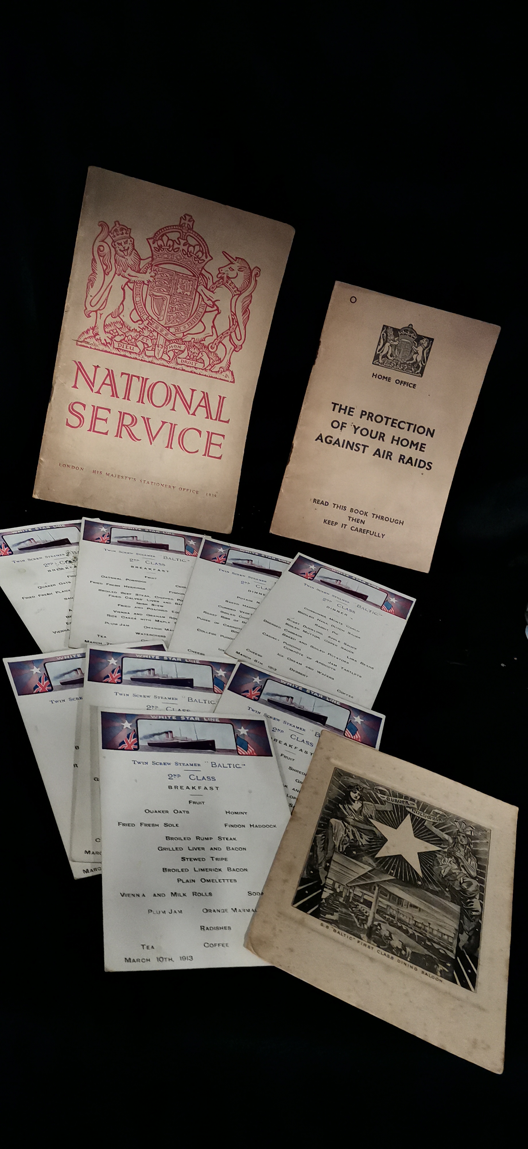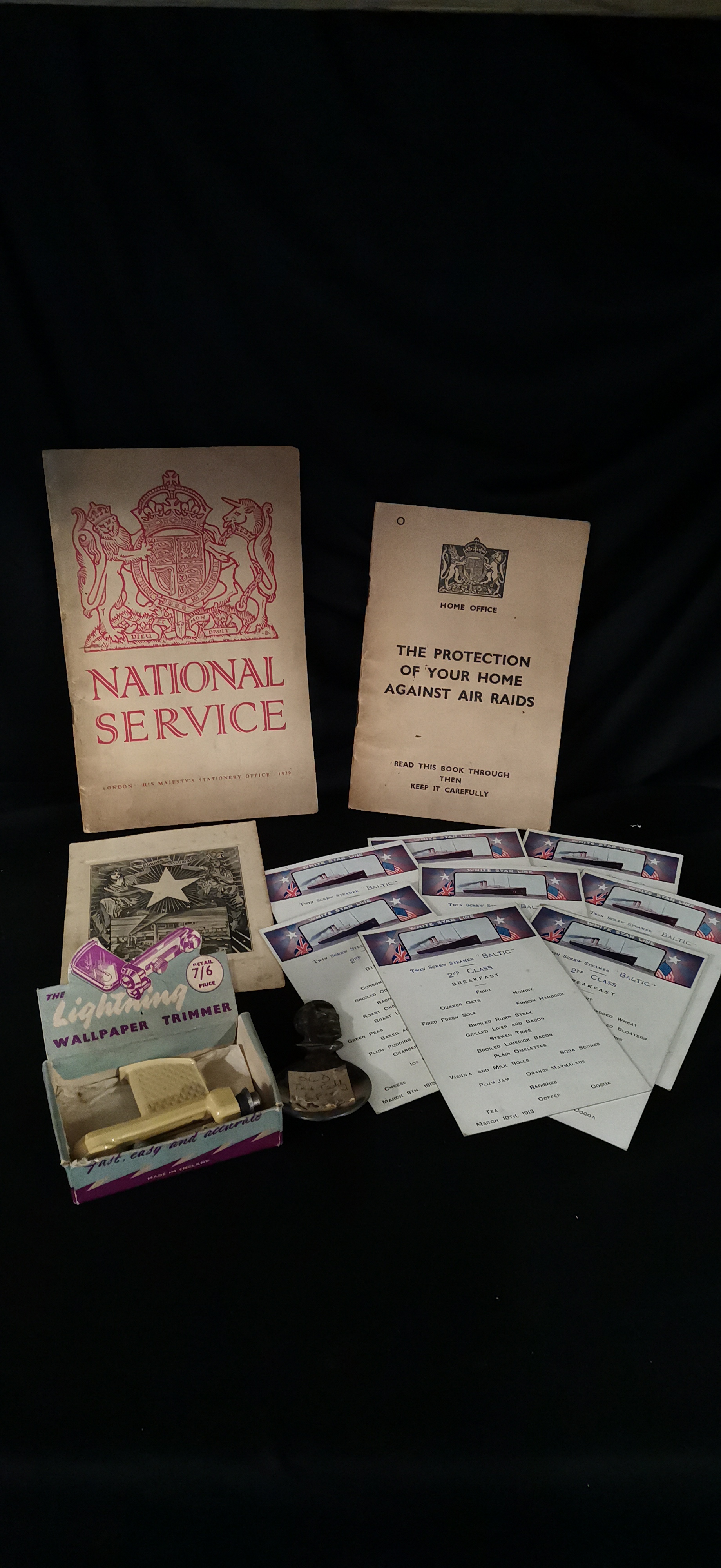 A collection of vintage items including a 1939 National Service booklet, a Home Office air raid protection guide, several 1913 White Star Line Baltic menus, and a boxed Lightning Wallpaper Trimmer.