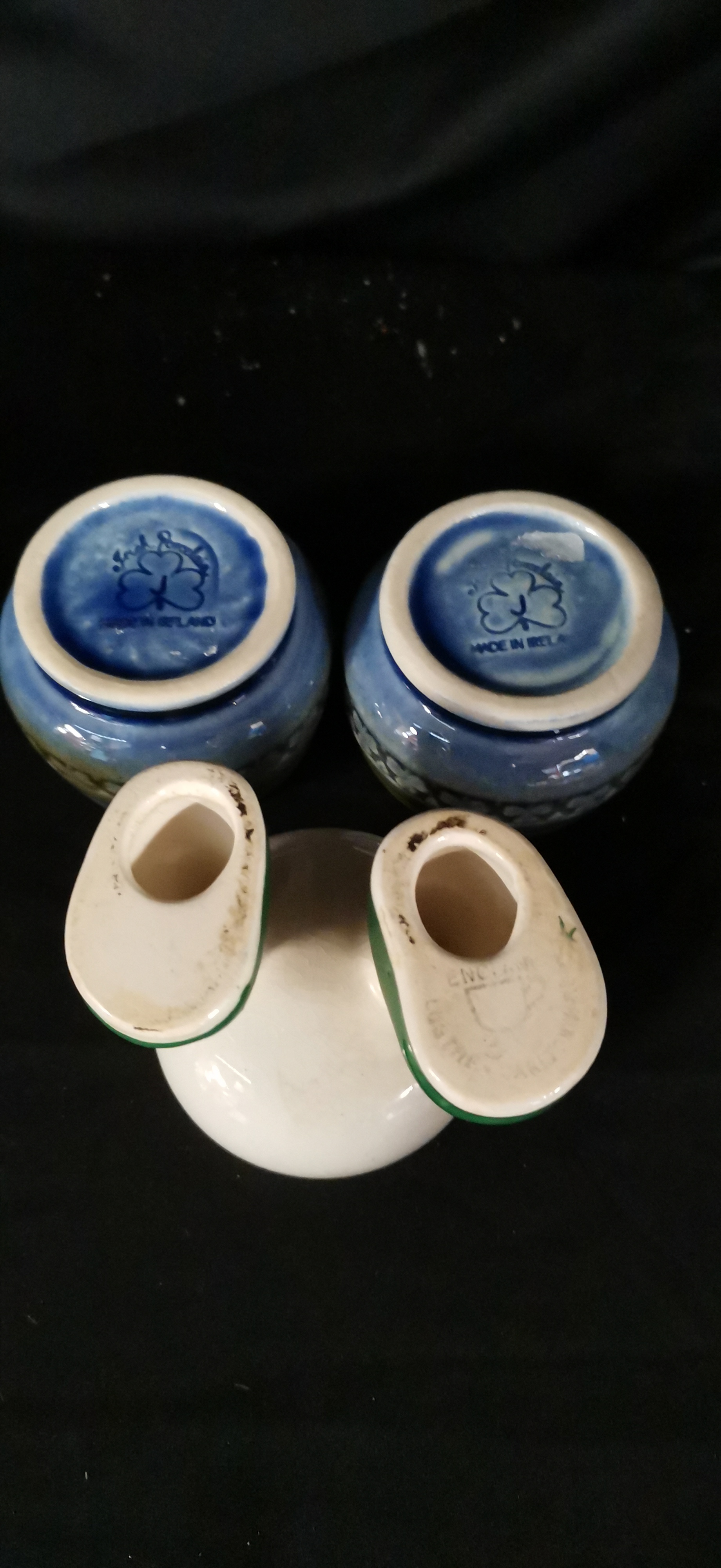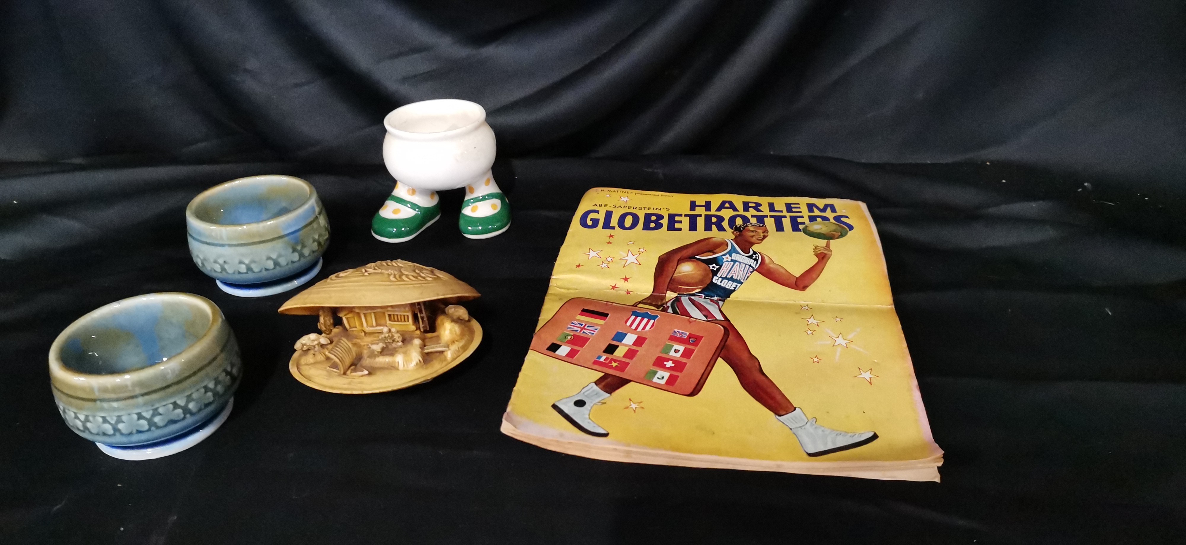 A collection of items including two Irish shamrock bowls, a Carlton Ware Walking Ware egg cup, a shell diorama, and a Harlem Globetrotters souvenir program.