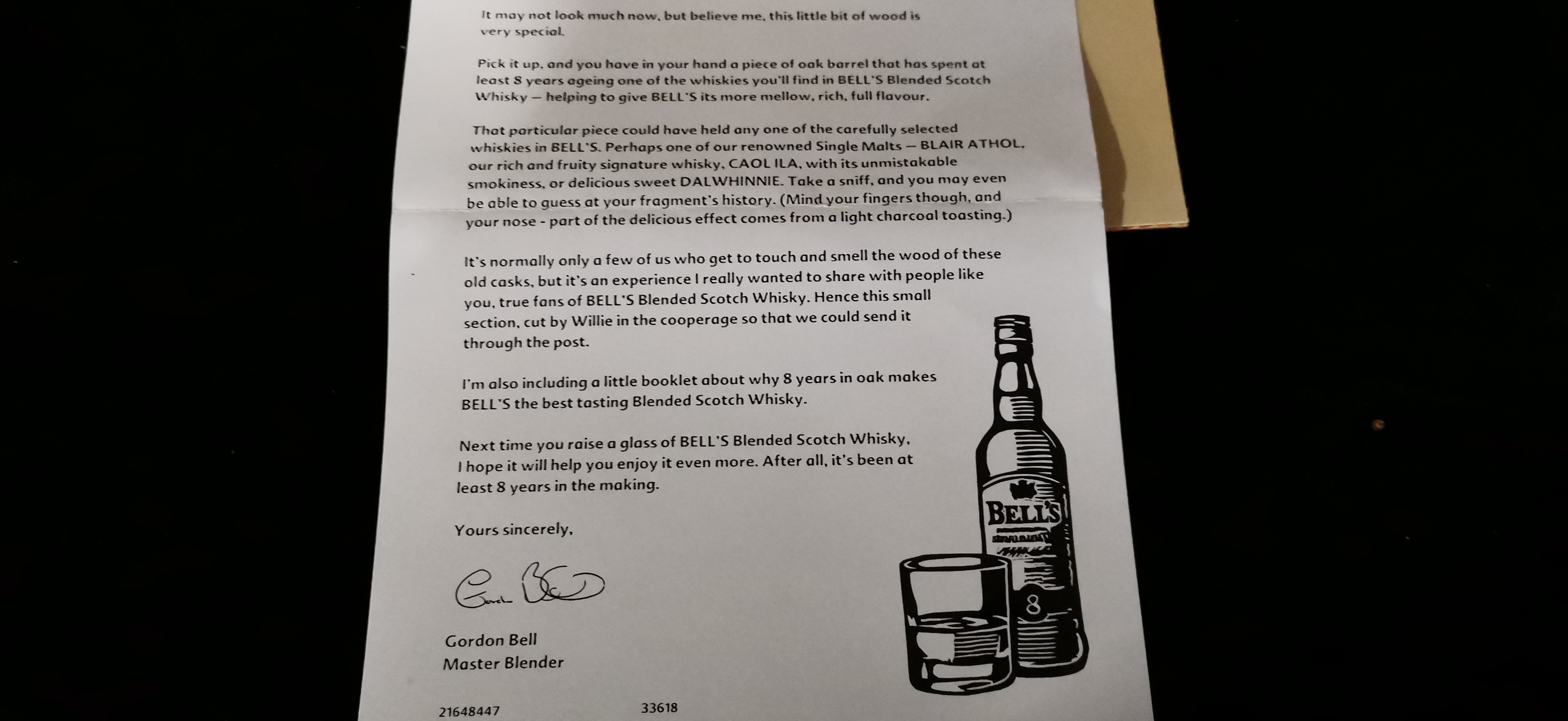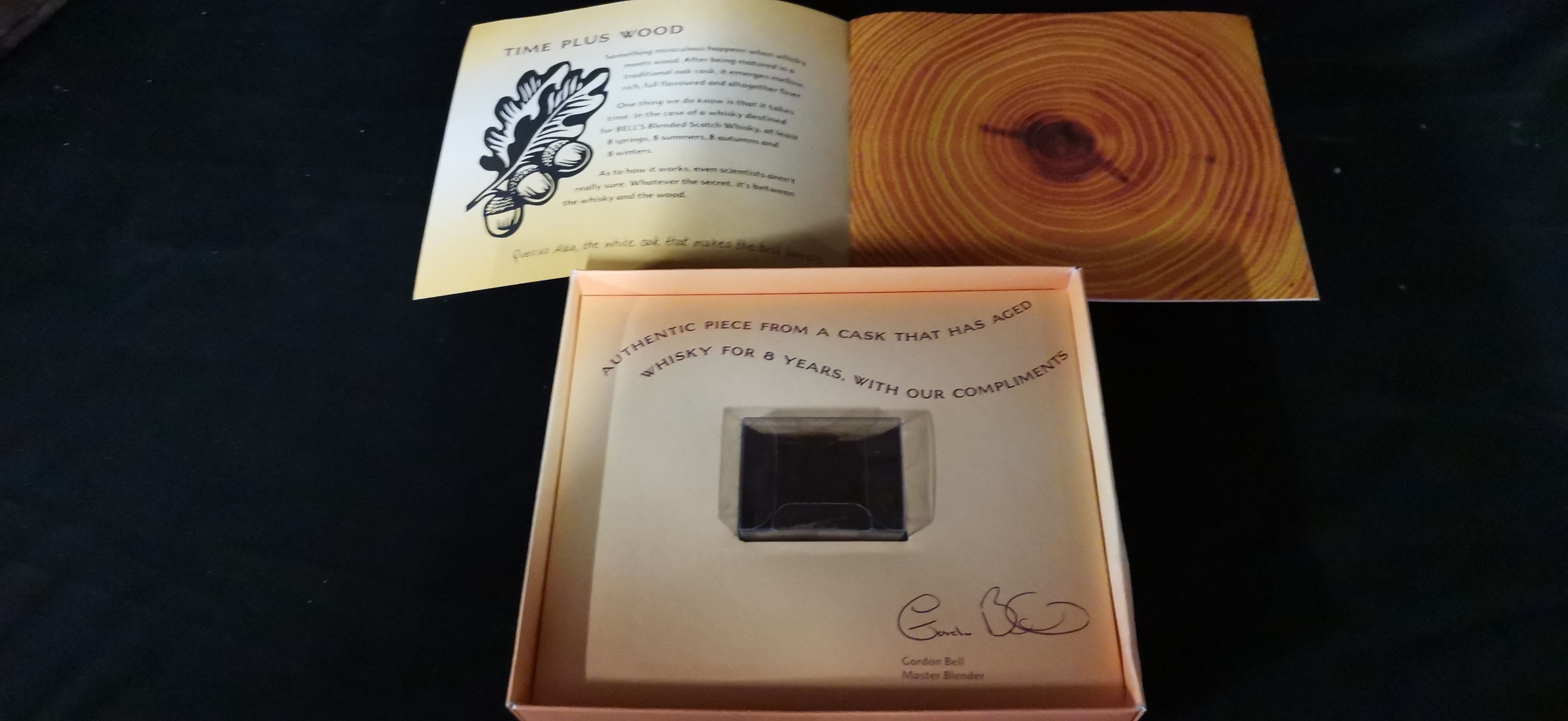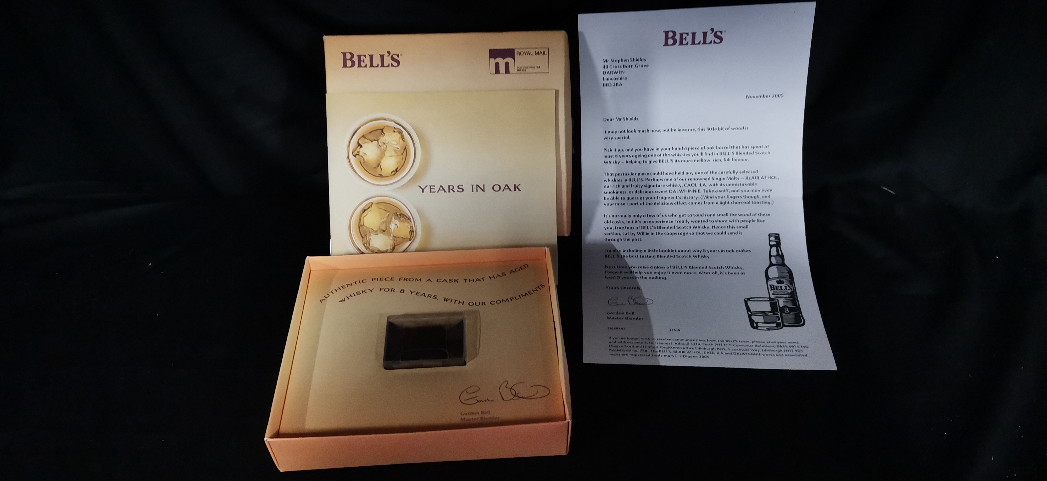 A Bell’s Blended Scotch Whisky presentation set comprising a Years in Oak booklet, a letter from Master Blender Gordon Bell dated 2005, and a boxed piece of charred oak cask.