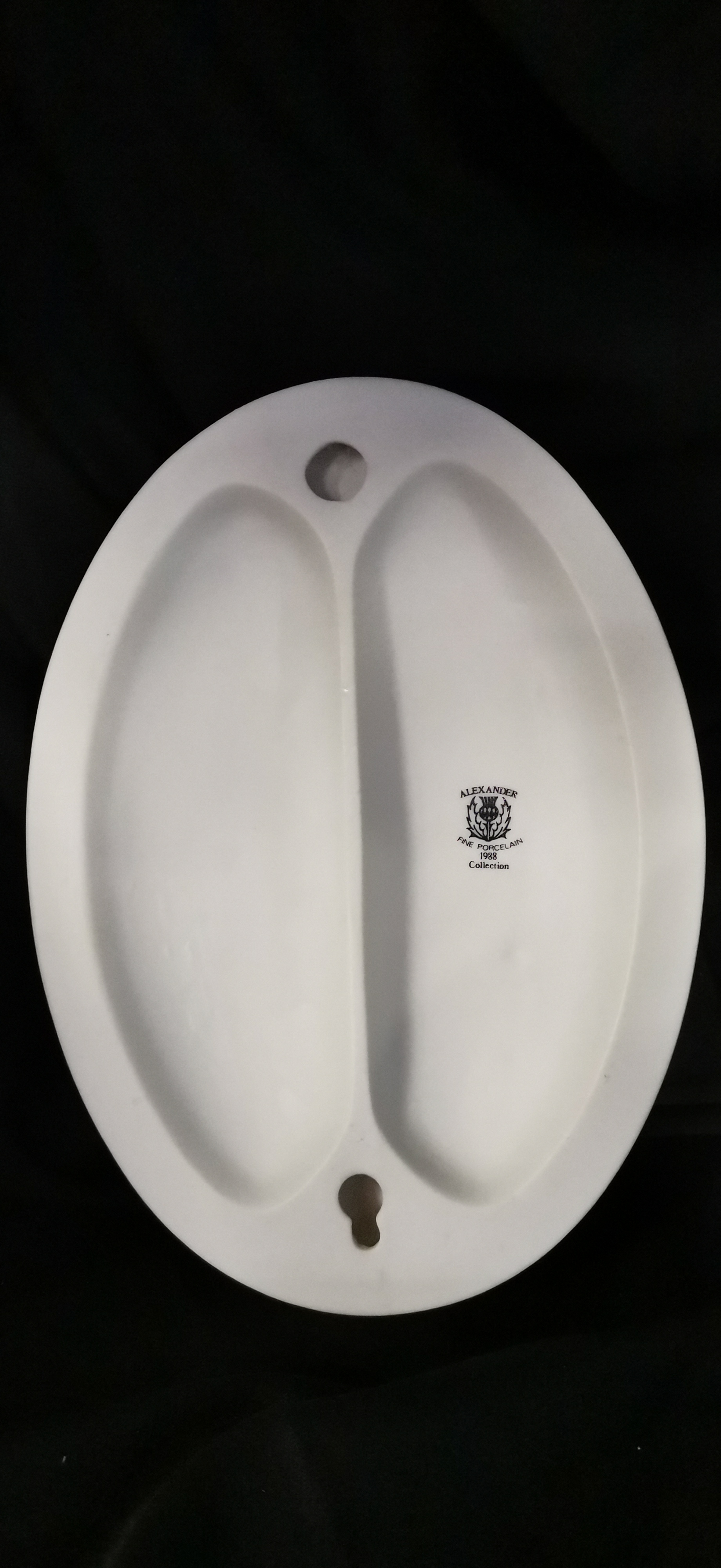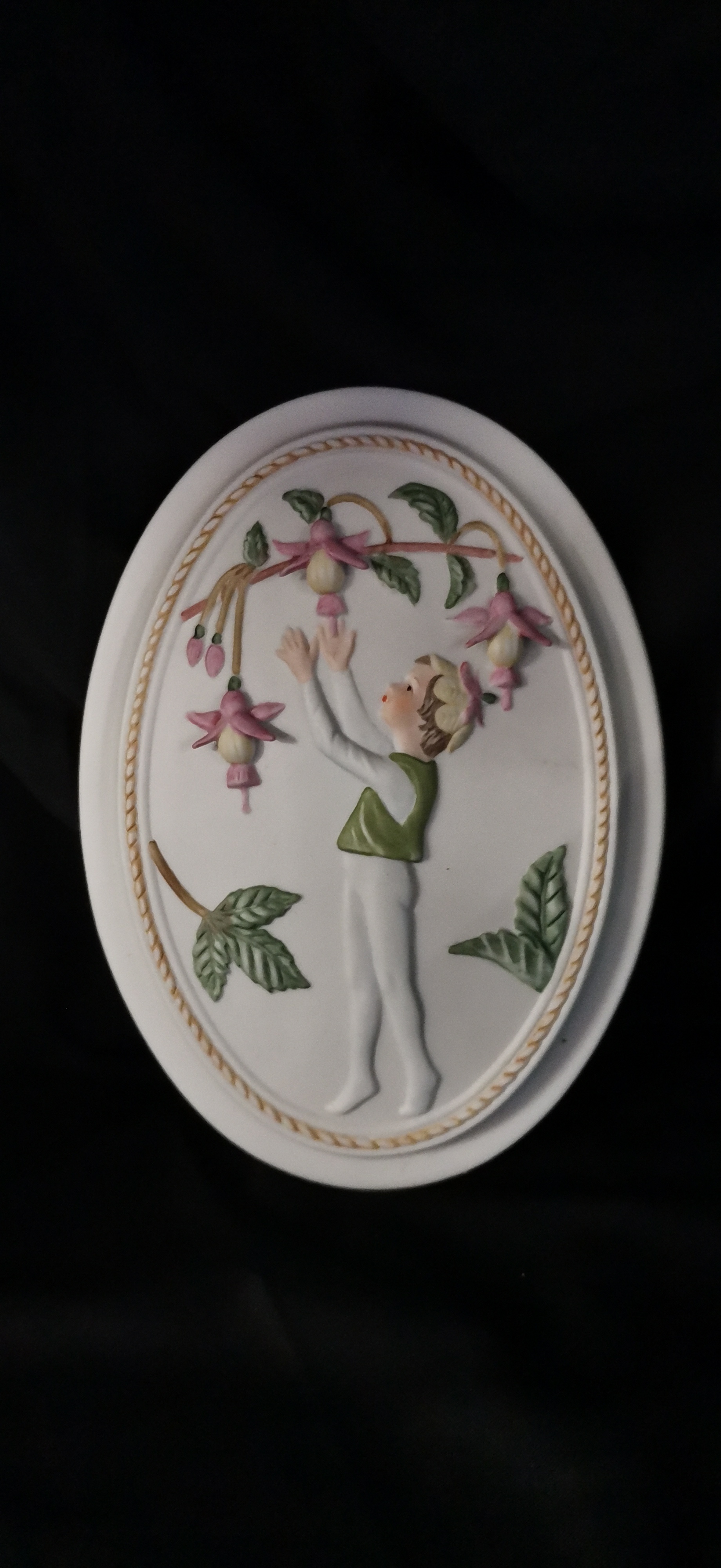 A white oval porcelain bas-relief wall plaque depicting a child reaching for pink fuchsia flowers, marked Alexander Fine Porcelain 1988 Collection to the reverse.