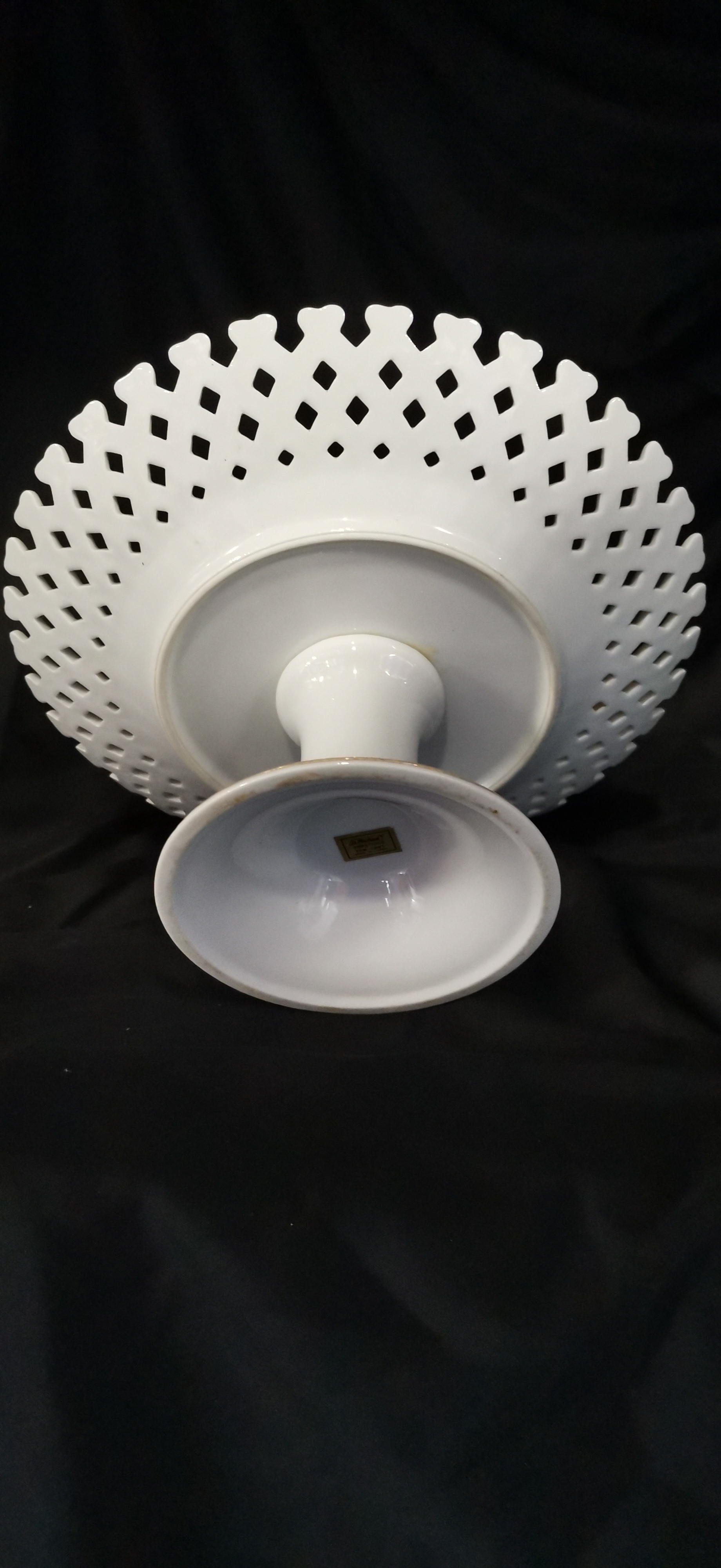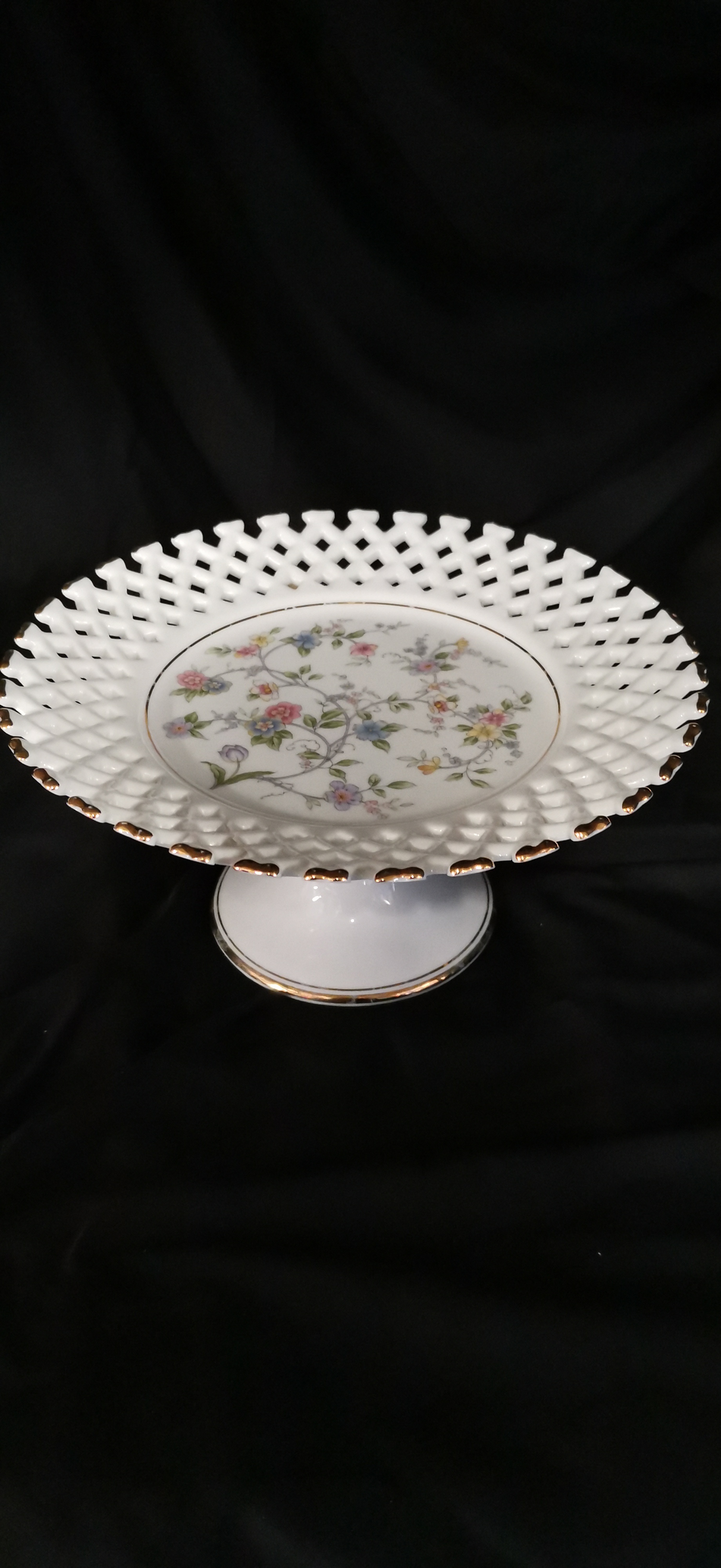 A white porcelain pedestal compote featuring a gold-trimmed reticulated rim and a multi-coloured floral centre with a maker’s label to the base.