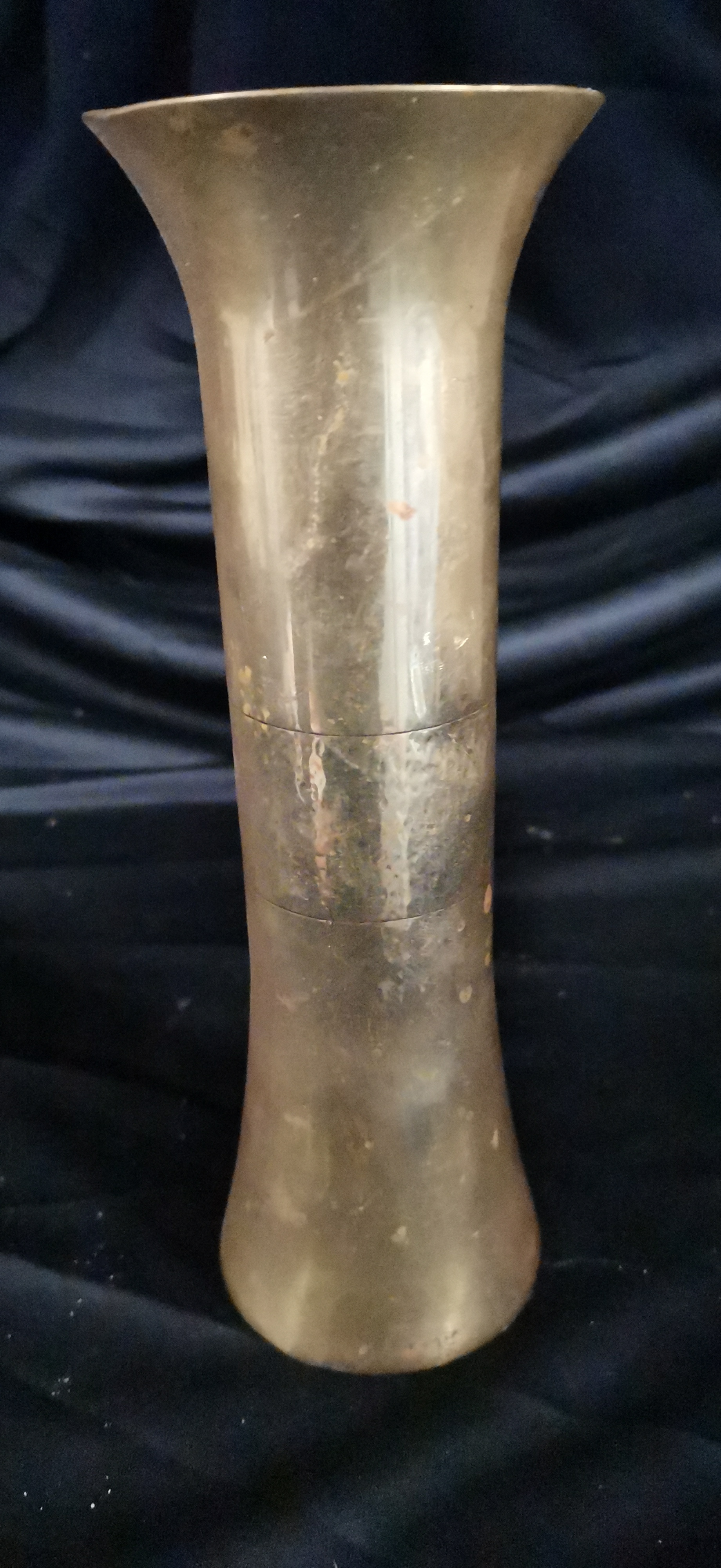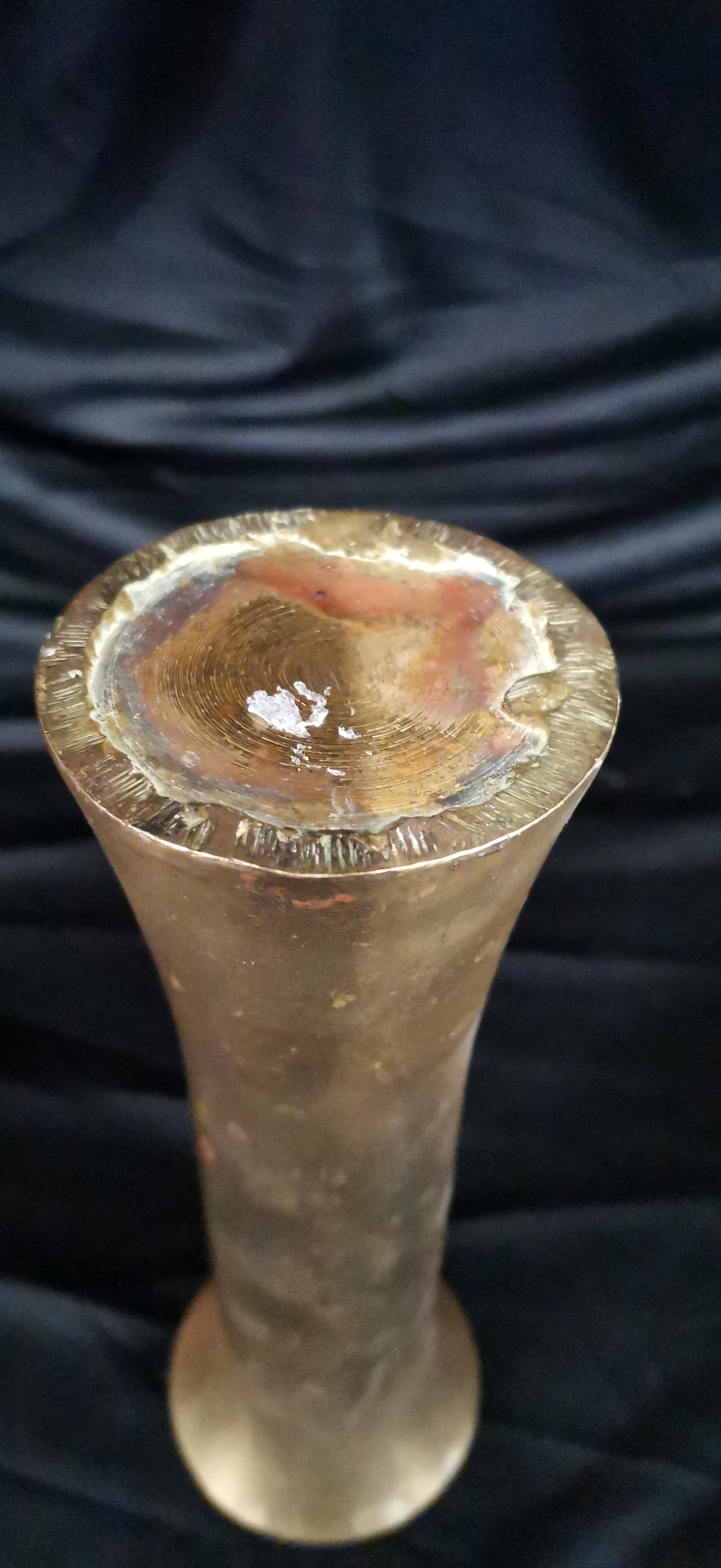 A tall, flared brass-coloured metal vase featuring a tarnished finish and a solid top with circular machining marks.