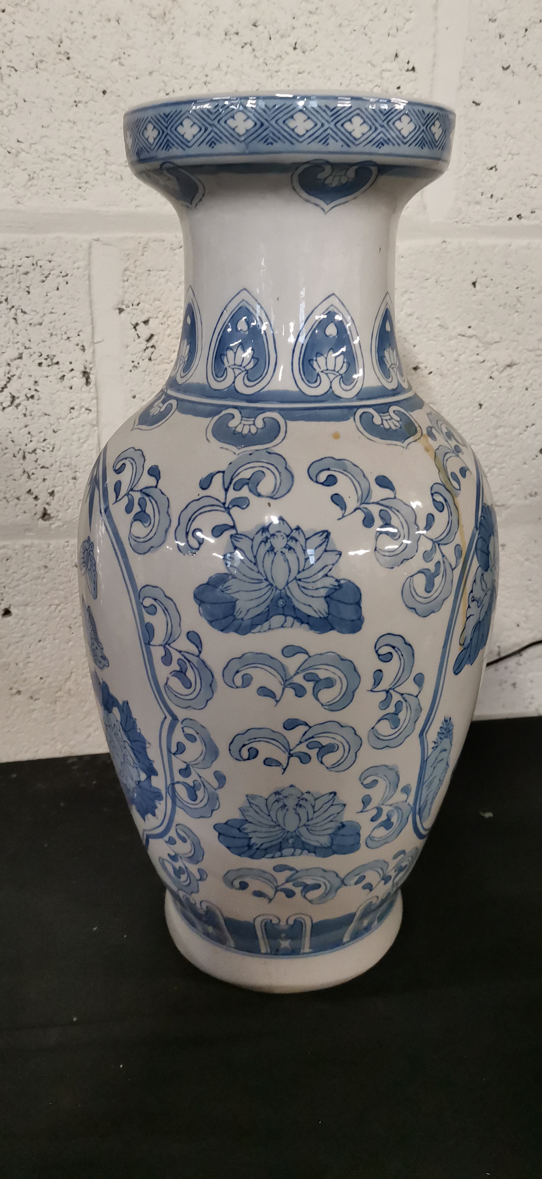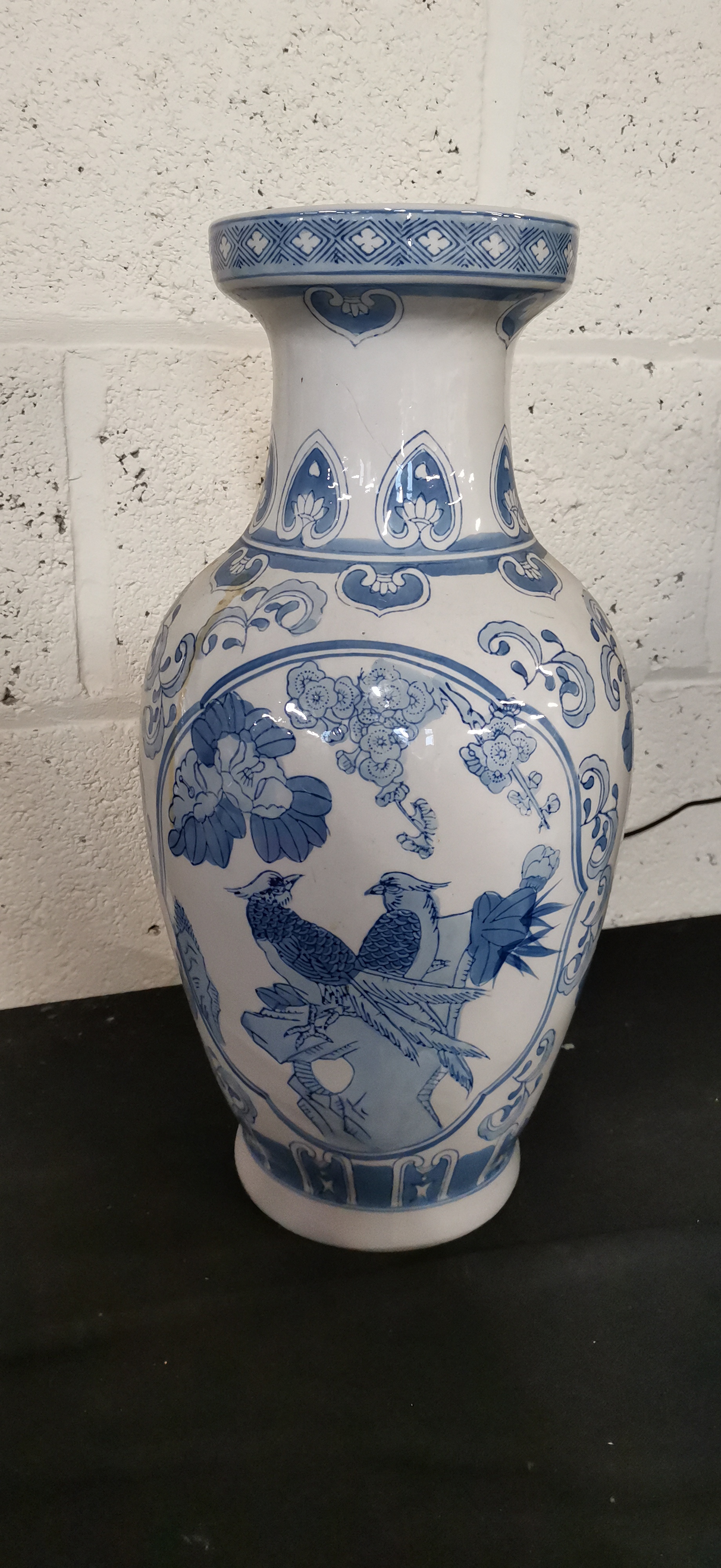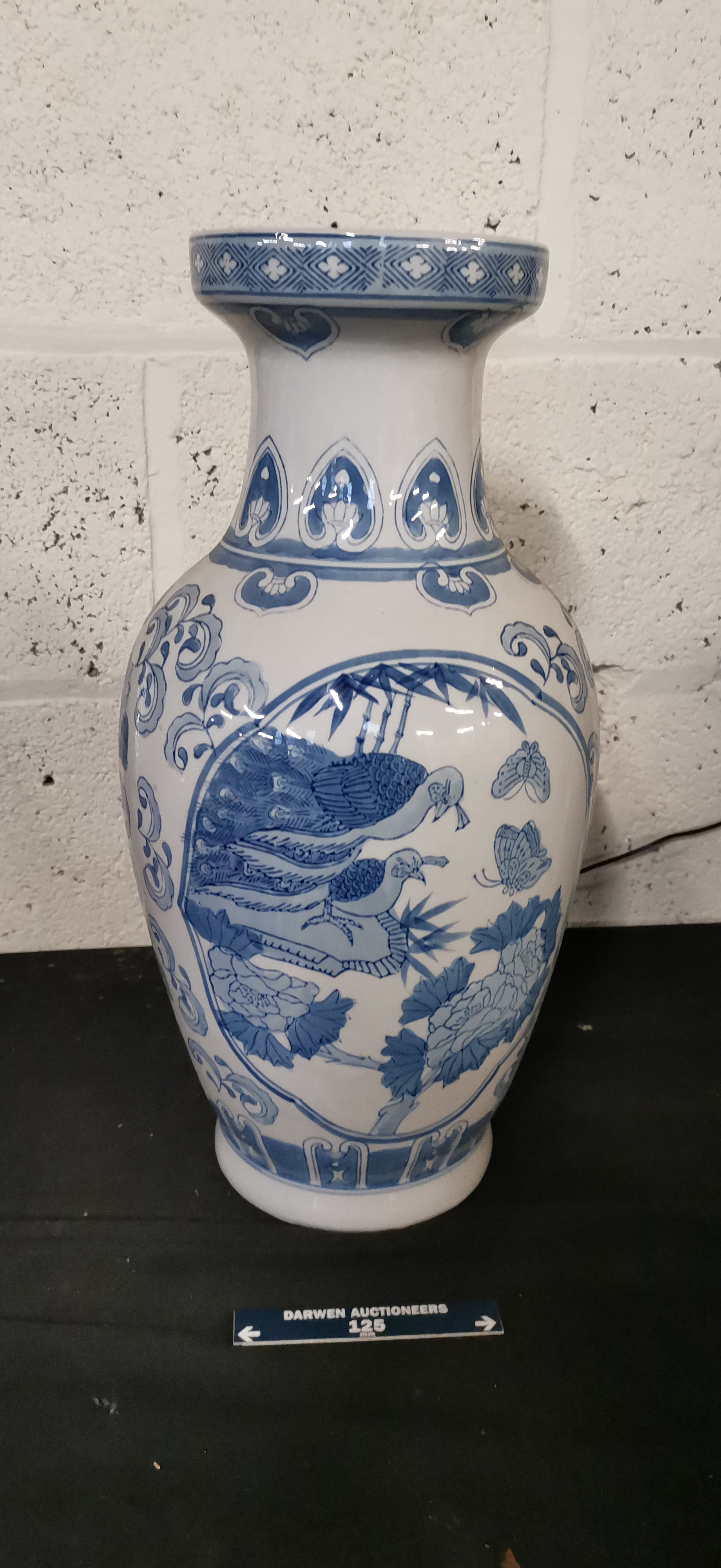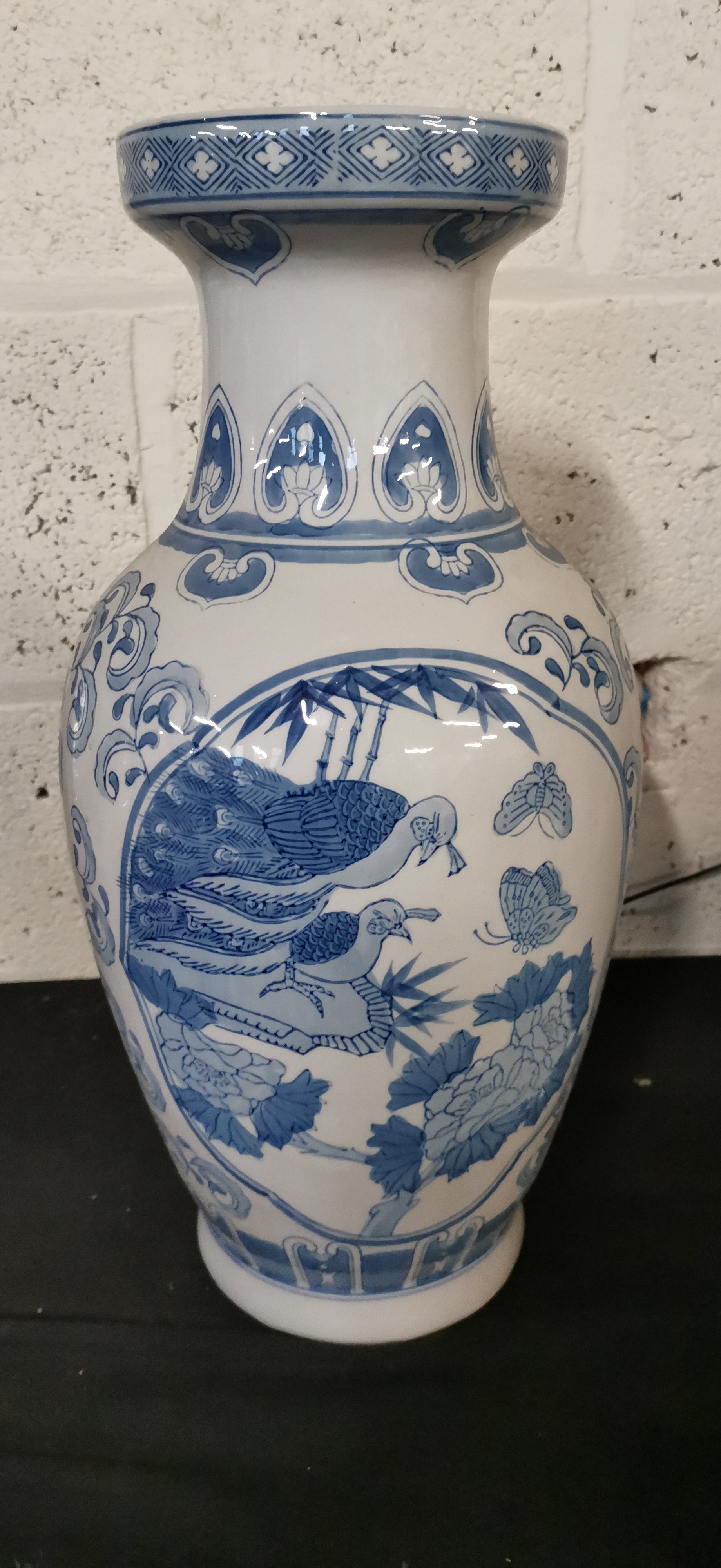 A blue and white ceramic vase decorated with intricate avian and floral motifs including peacocks, butterflies, and peonies, measuring approximately 37 cm in height.