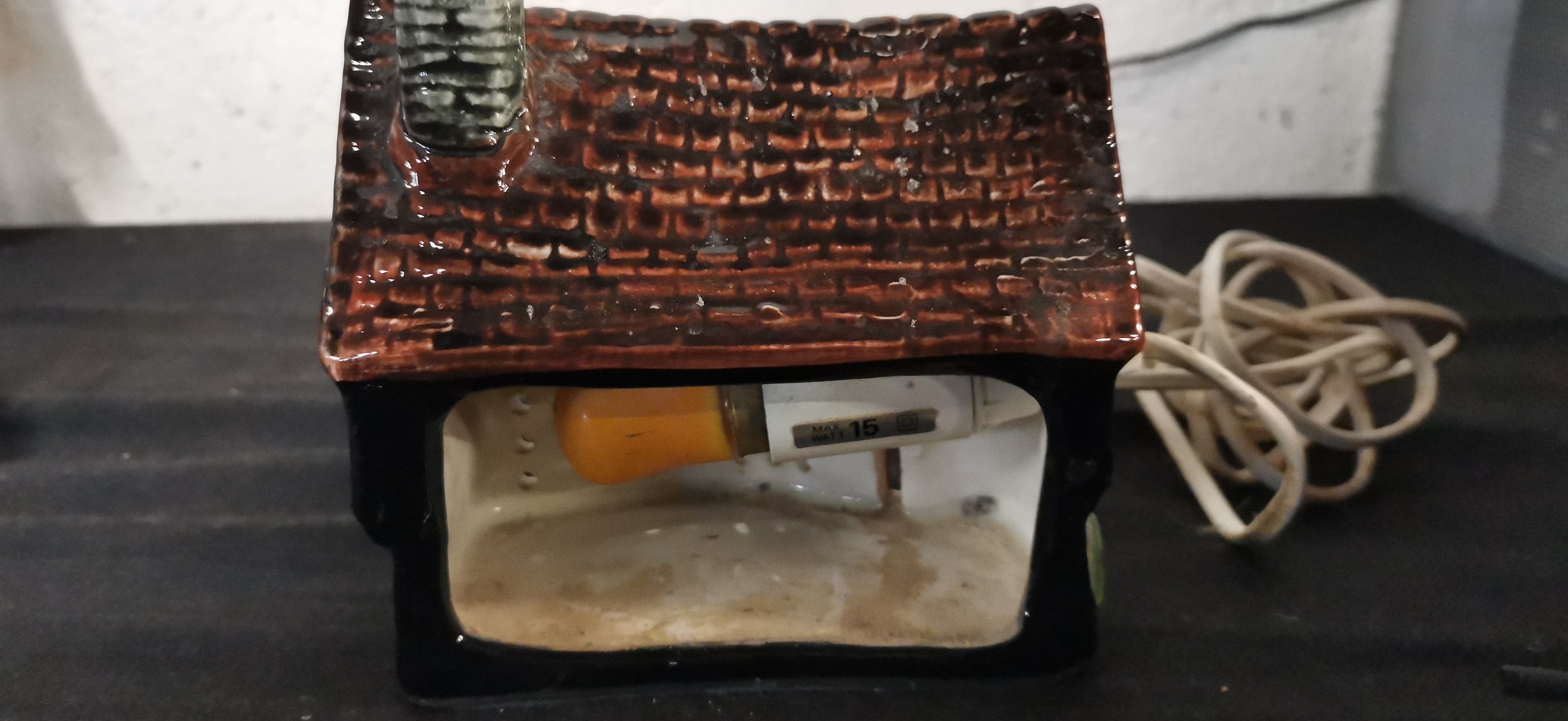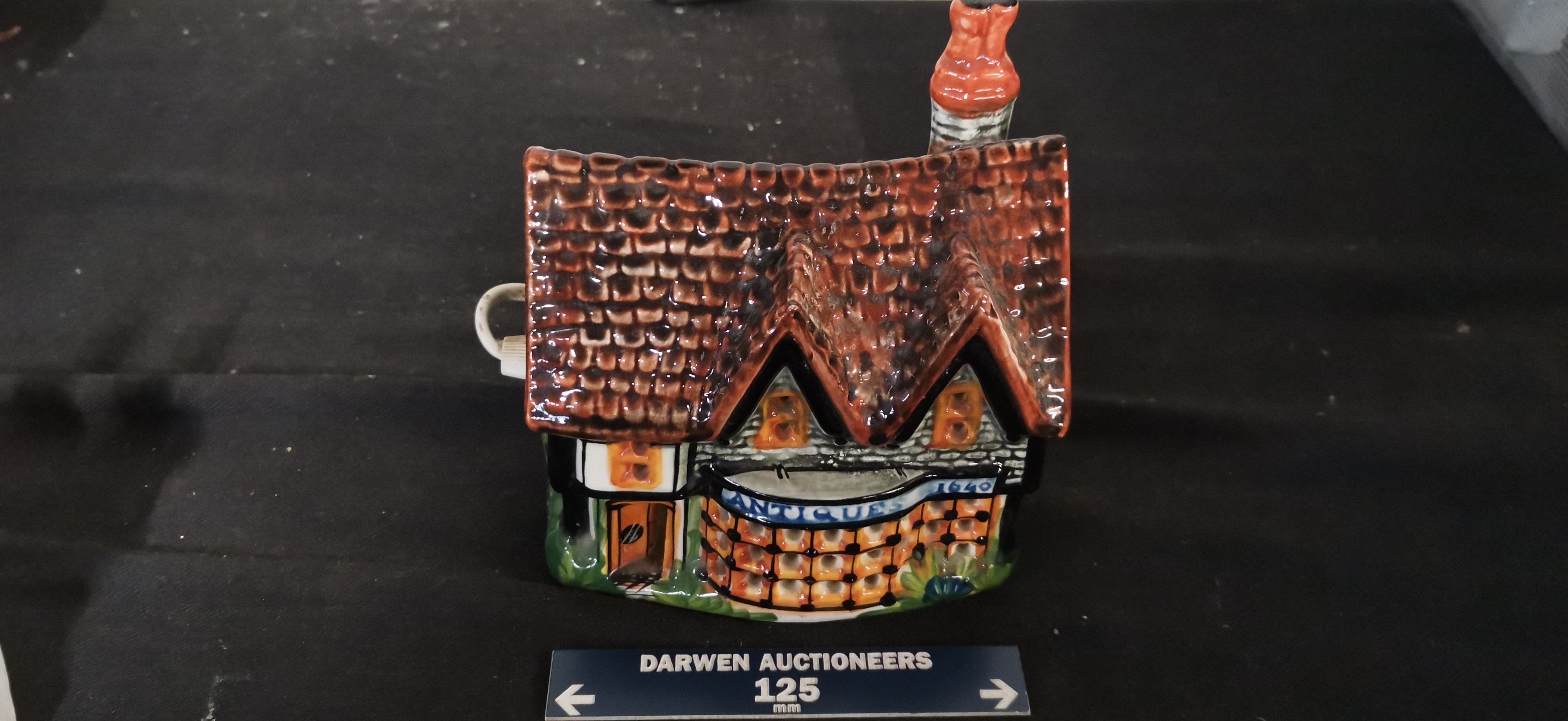 A ceramic house-shaped night light depicting an antique shop with a reddish-brown shingled roof and ANTIQUES 1640 signage, measuring approximately 125mm in width.