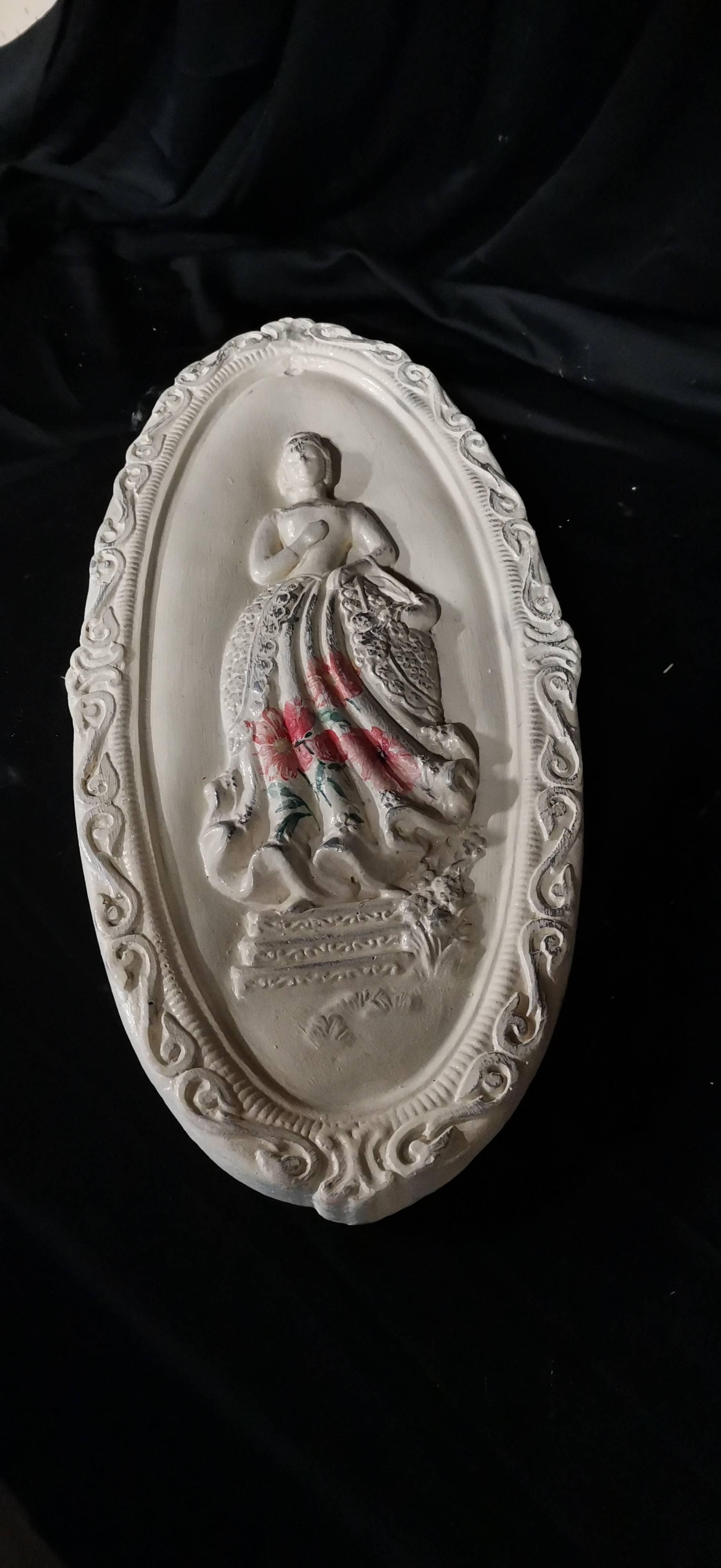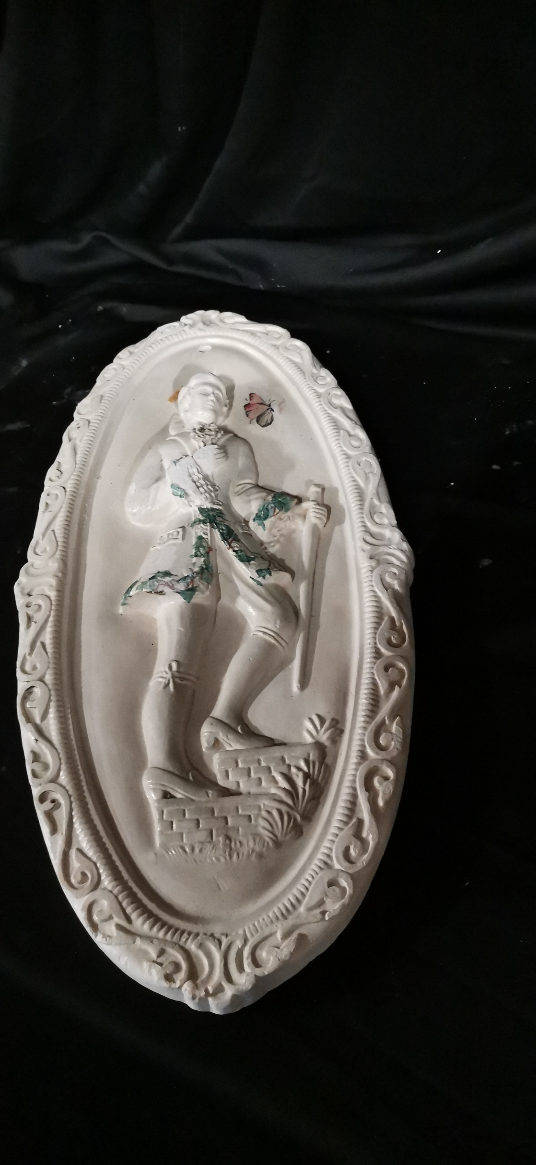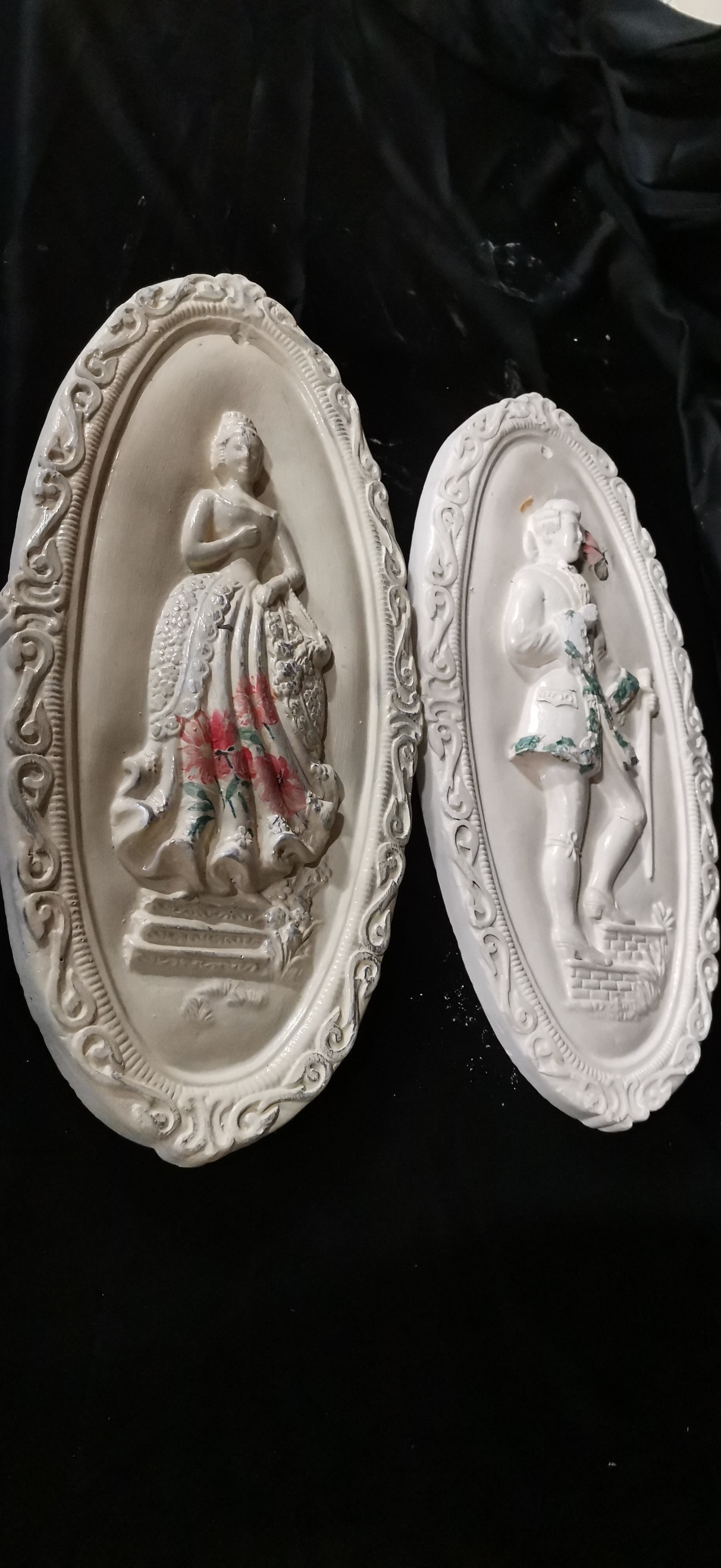 A pair of off-white oval-shaped decorative wall plaques featuring bas-relief figures of a man and woman in period dress with green and red accents.