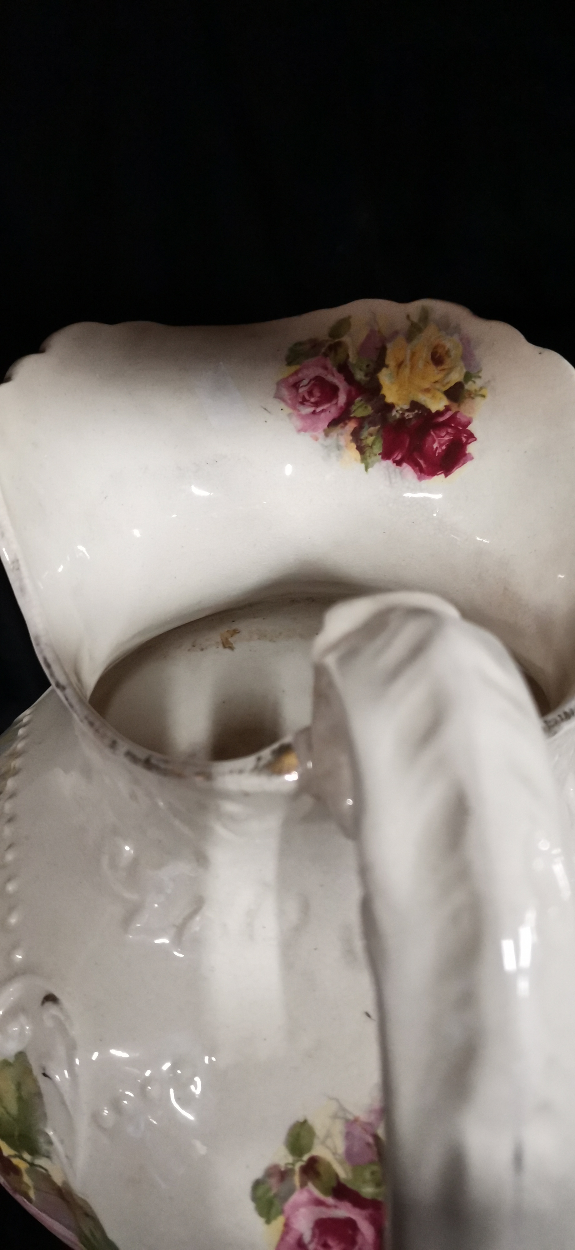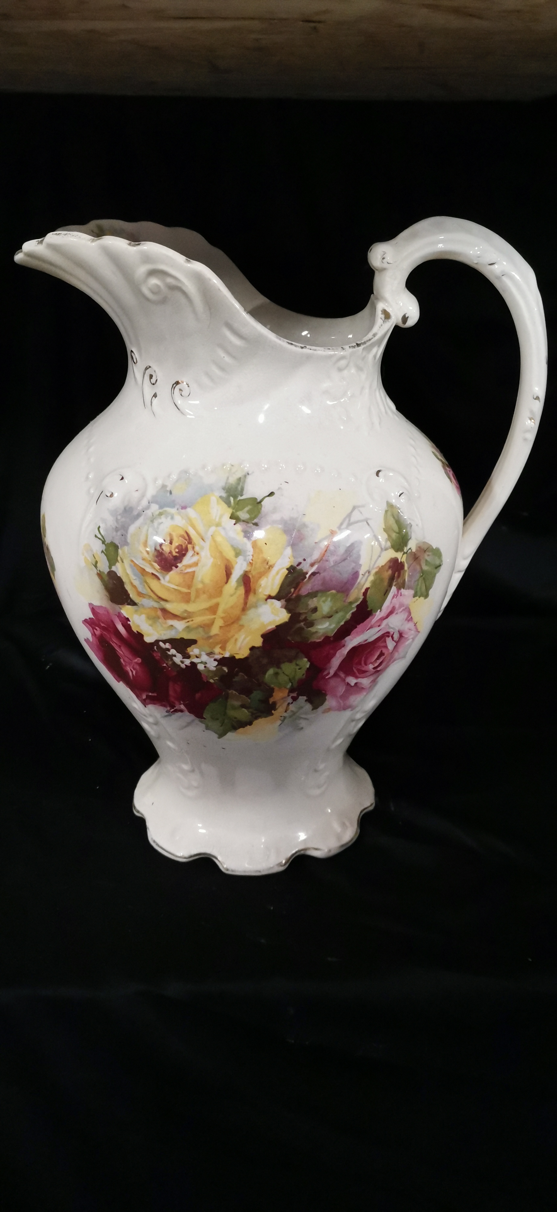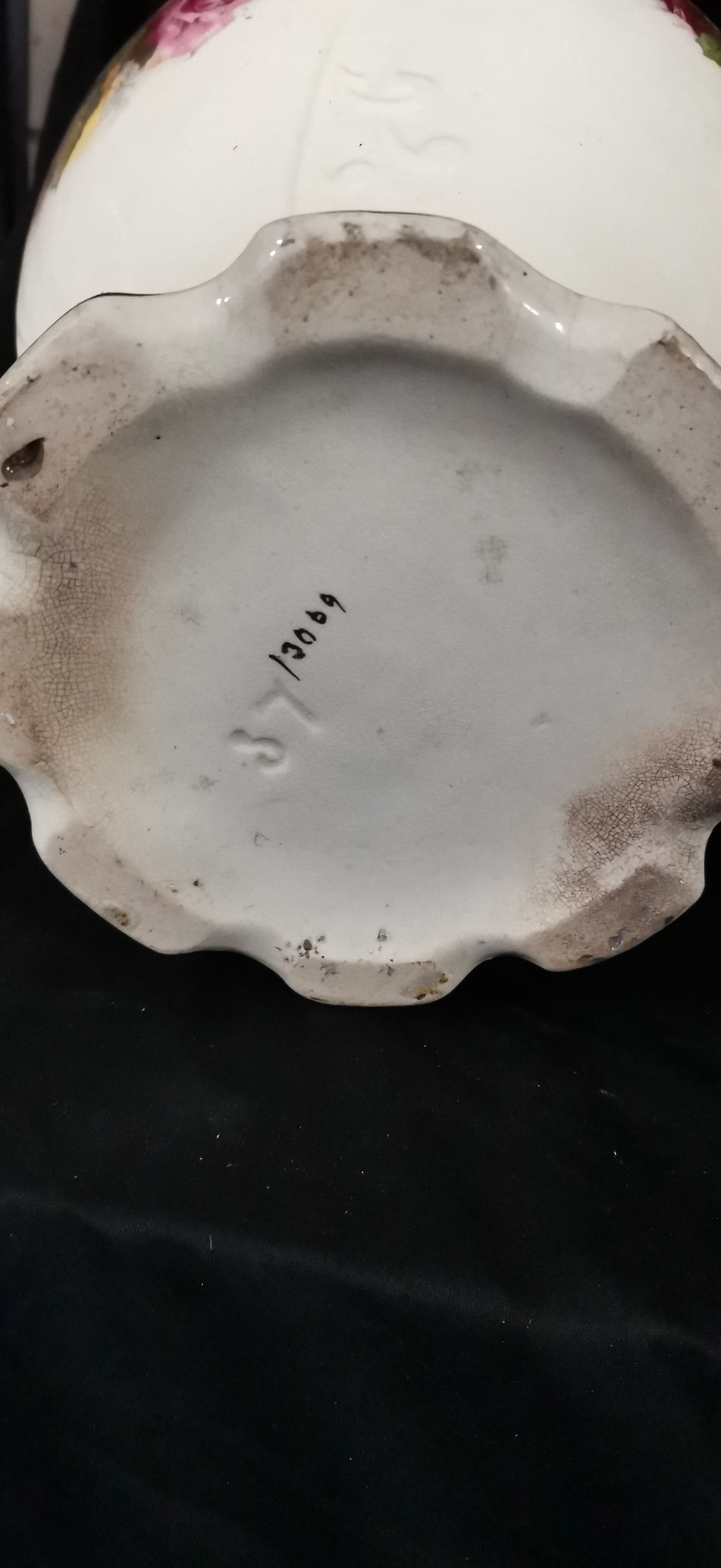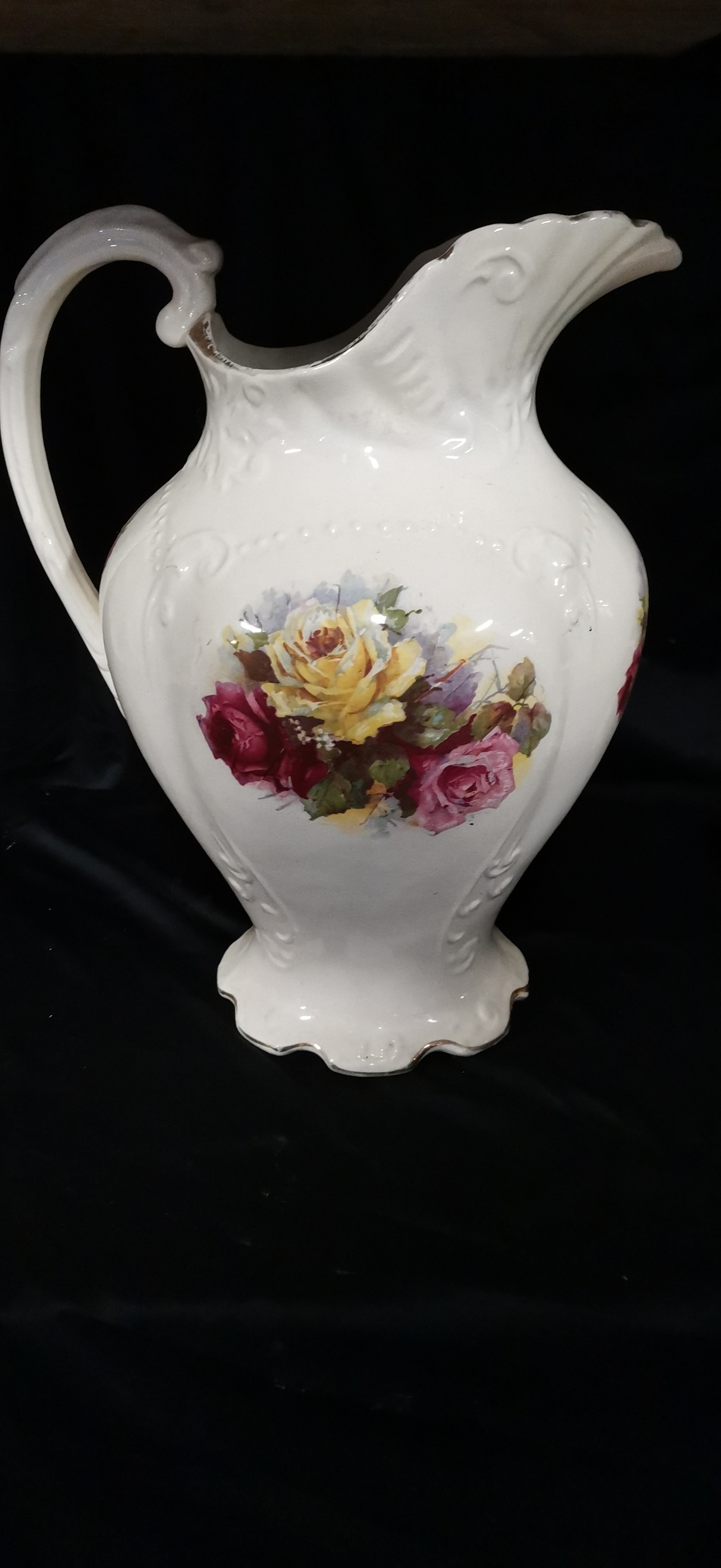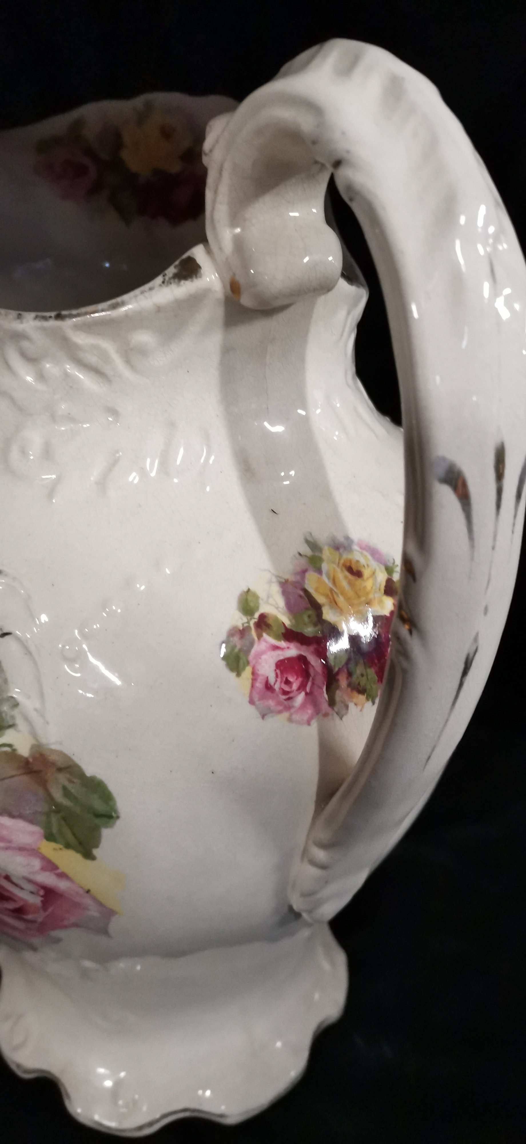 A large white ceramic wash pitcher featuring multicoloured rose motifs, gold-toned accents, and an embossed number 37 on the base.