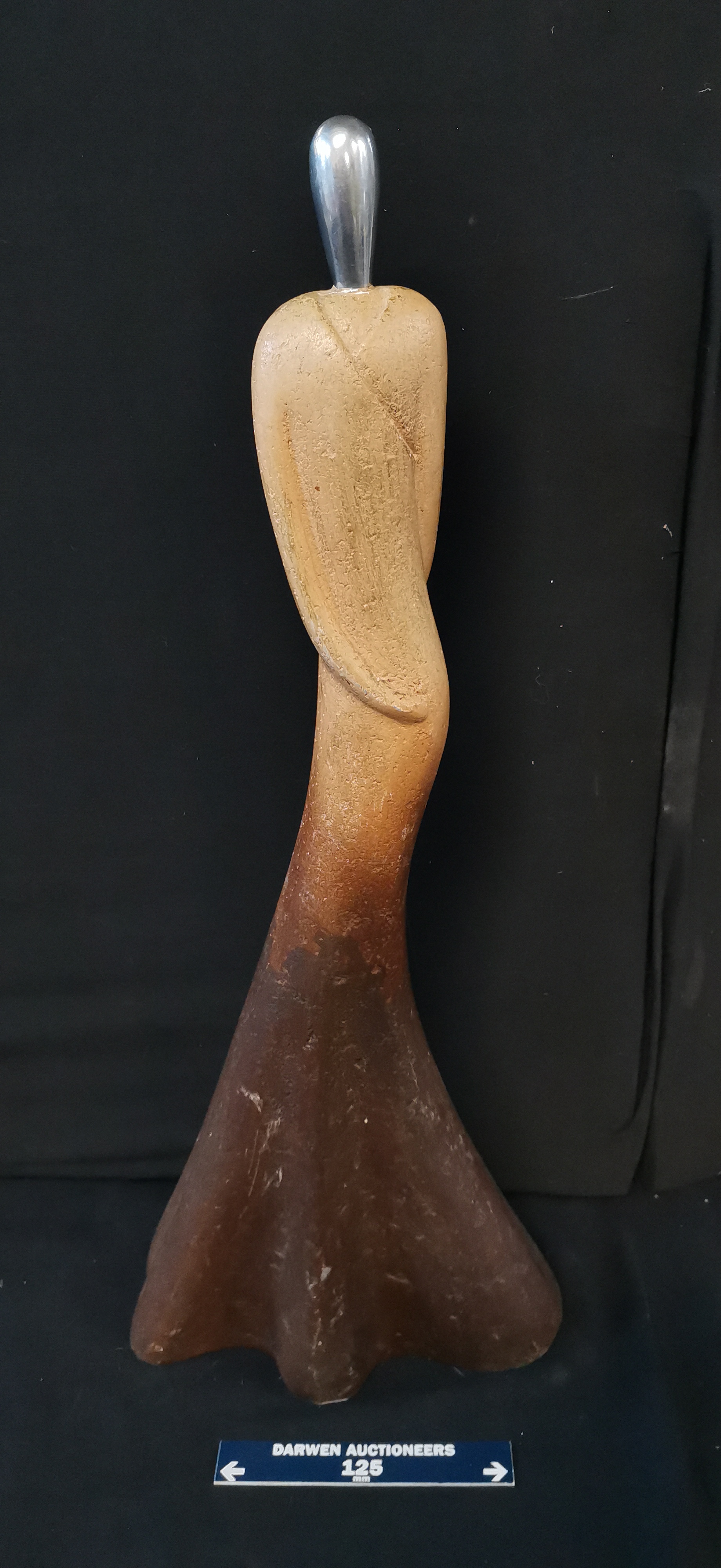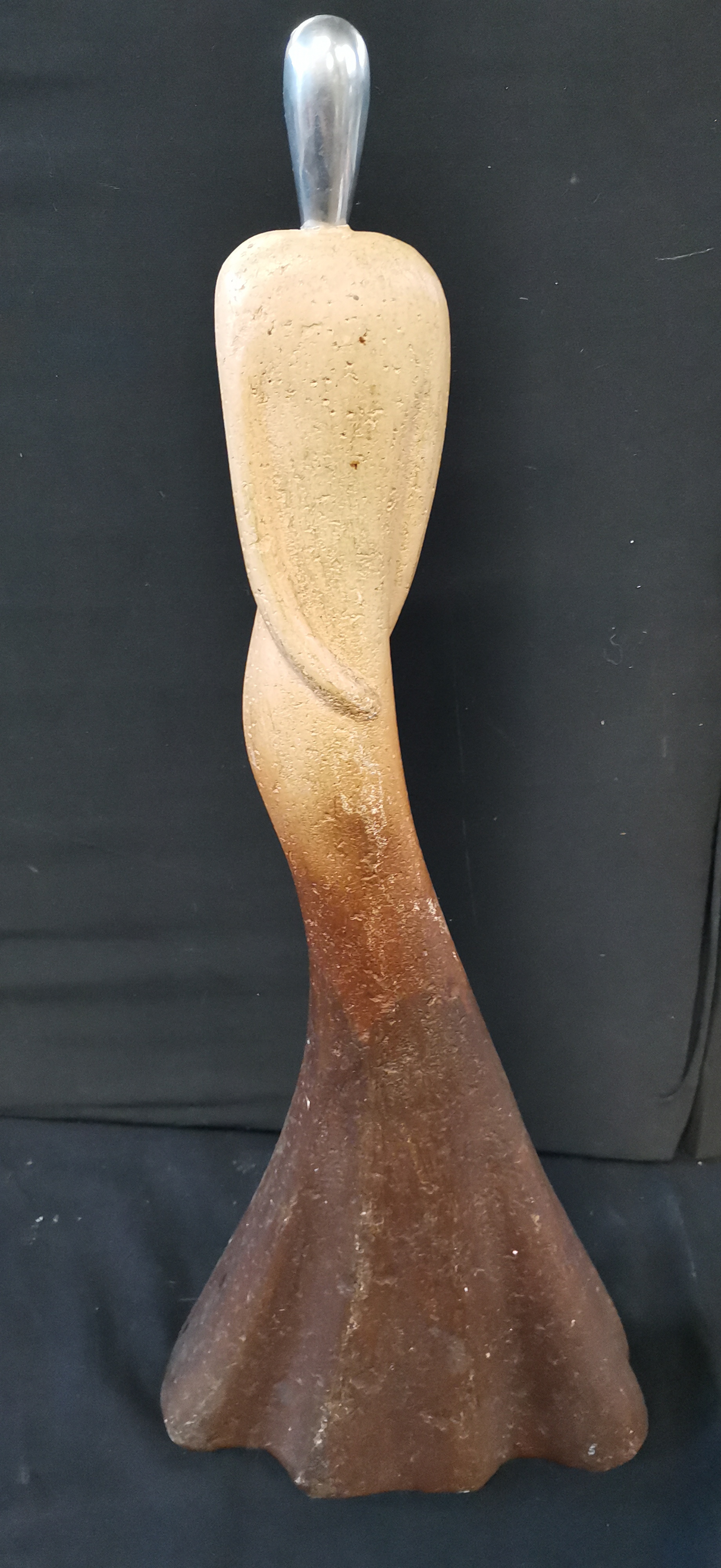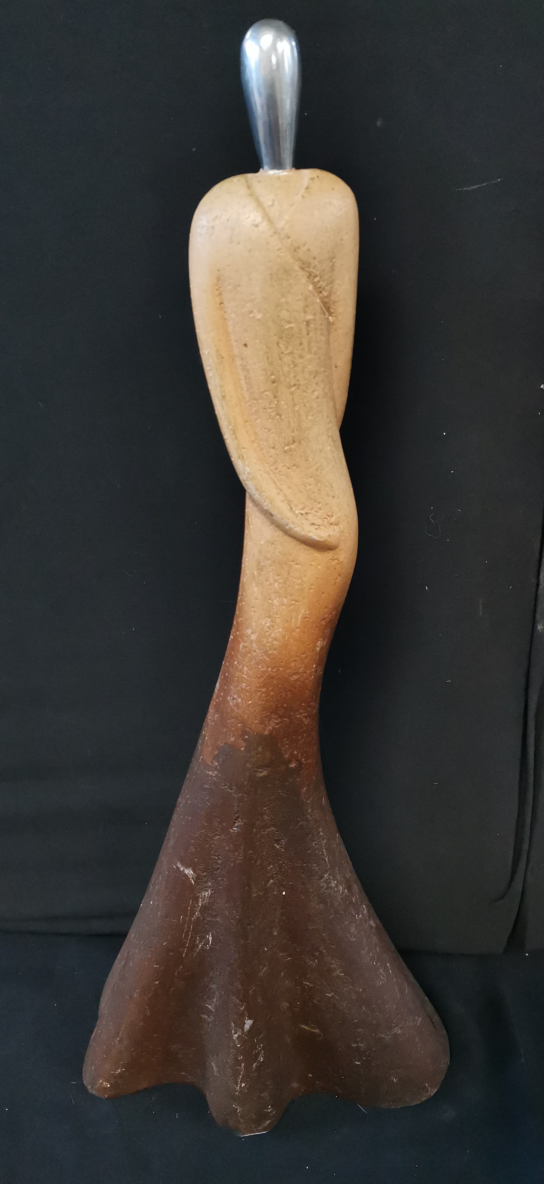 An abstract stylised sculpture featuring a tan to dark brown gradient body with a silver-toned metallic top, measuring approximately 500mm in height.