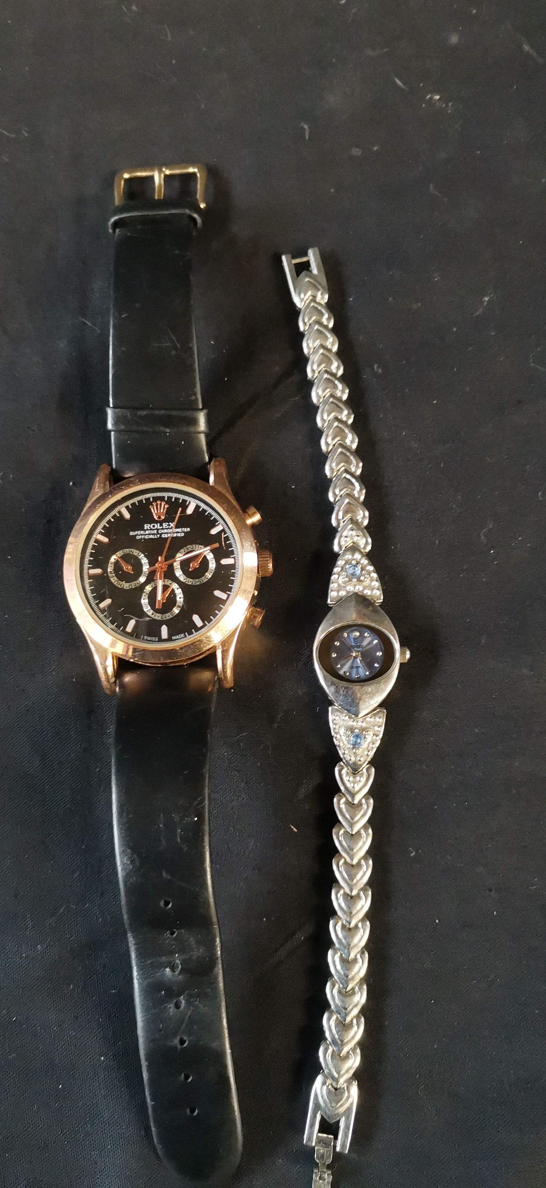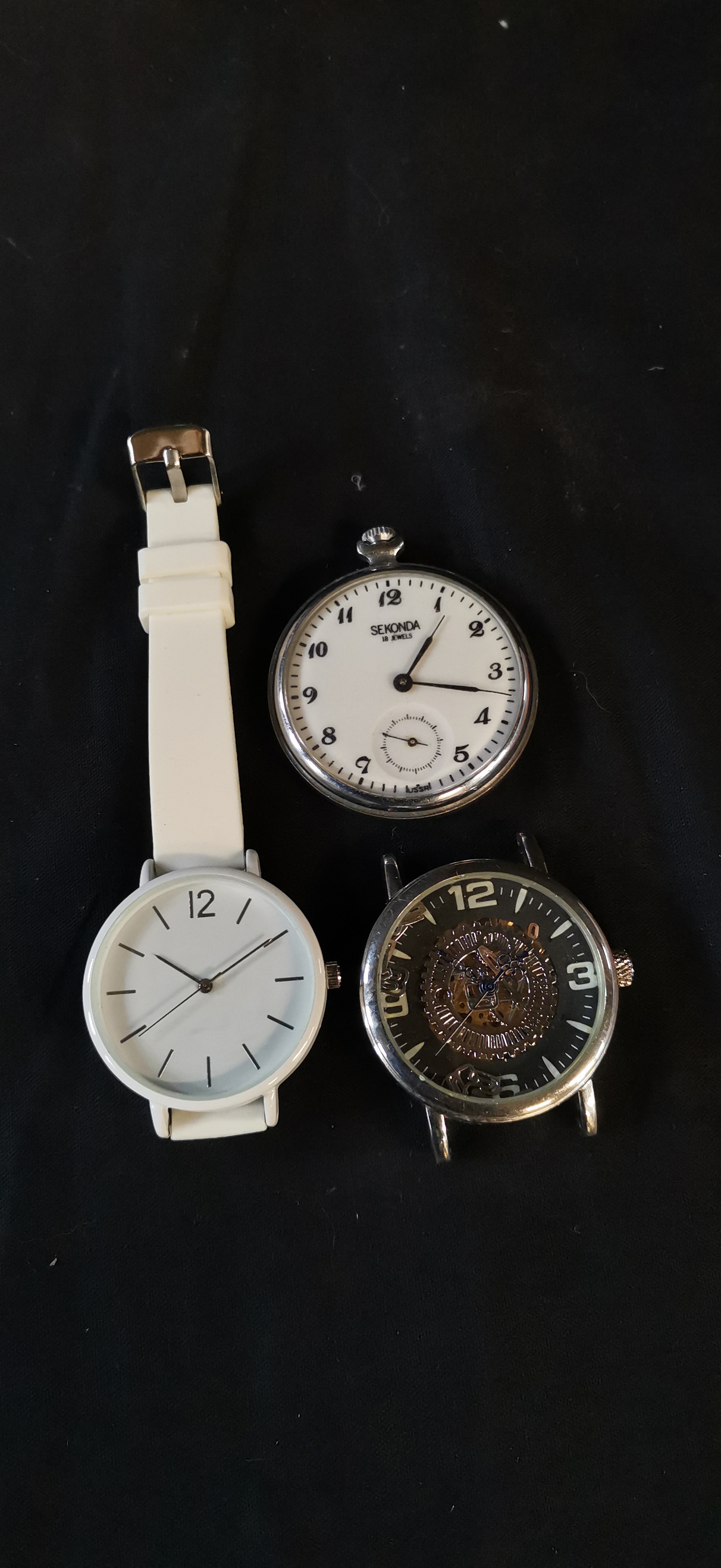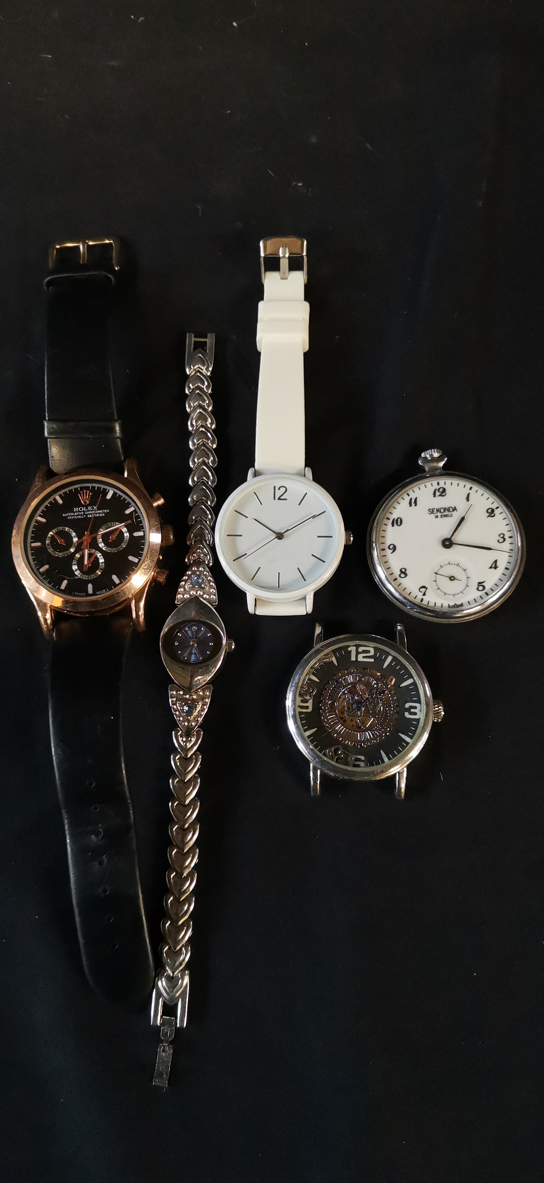 A collection of wristwatches and a pocket watch in assorted colours including rose-gold, silver, black, and white, with markings for Rolex and Sekonda 18 Jewels.