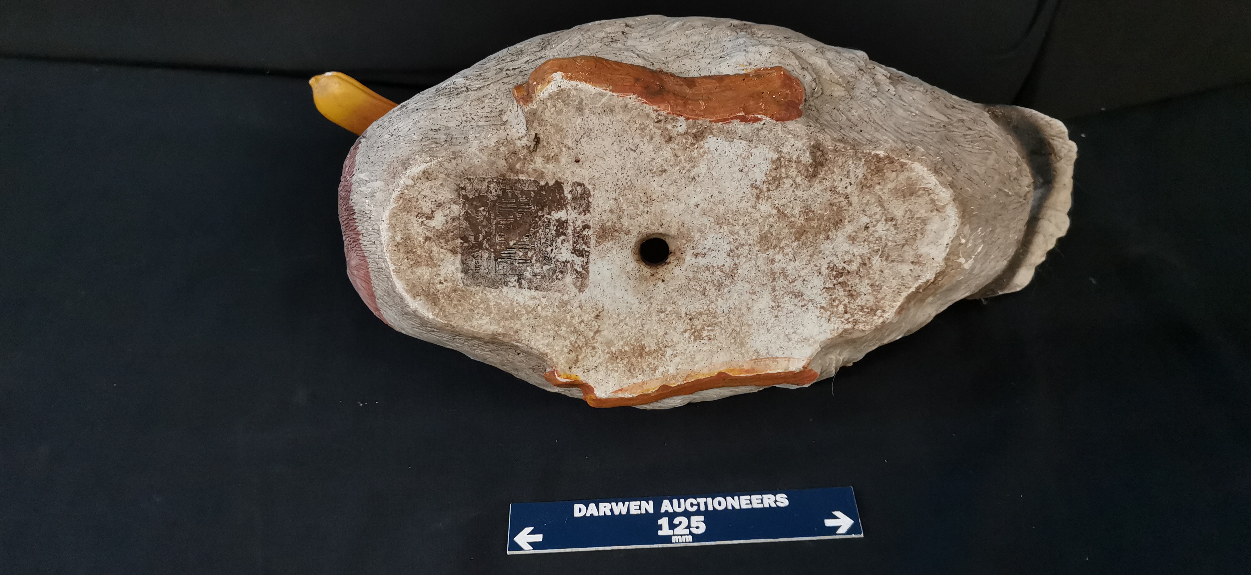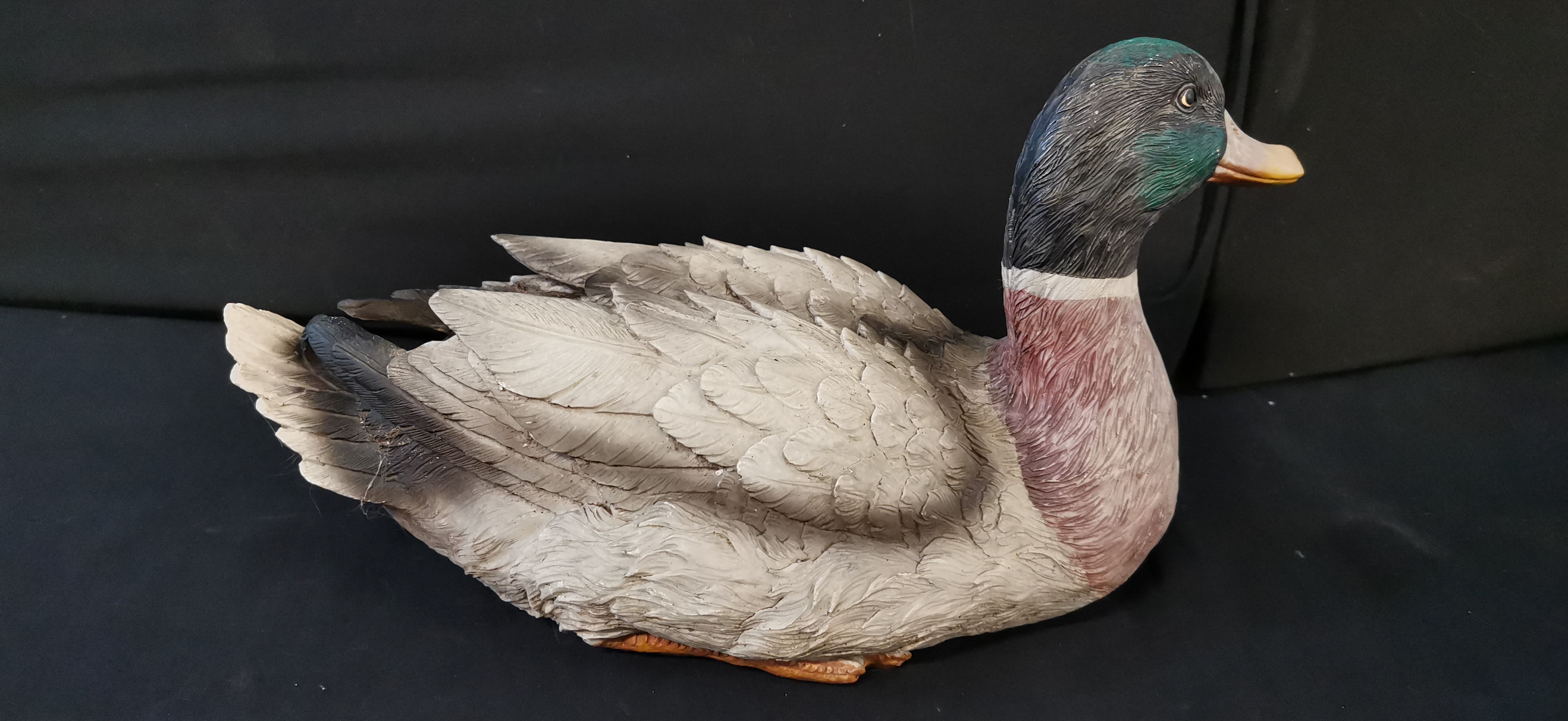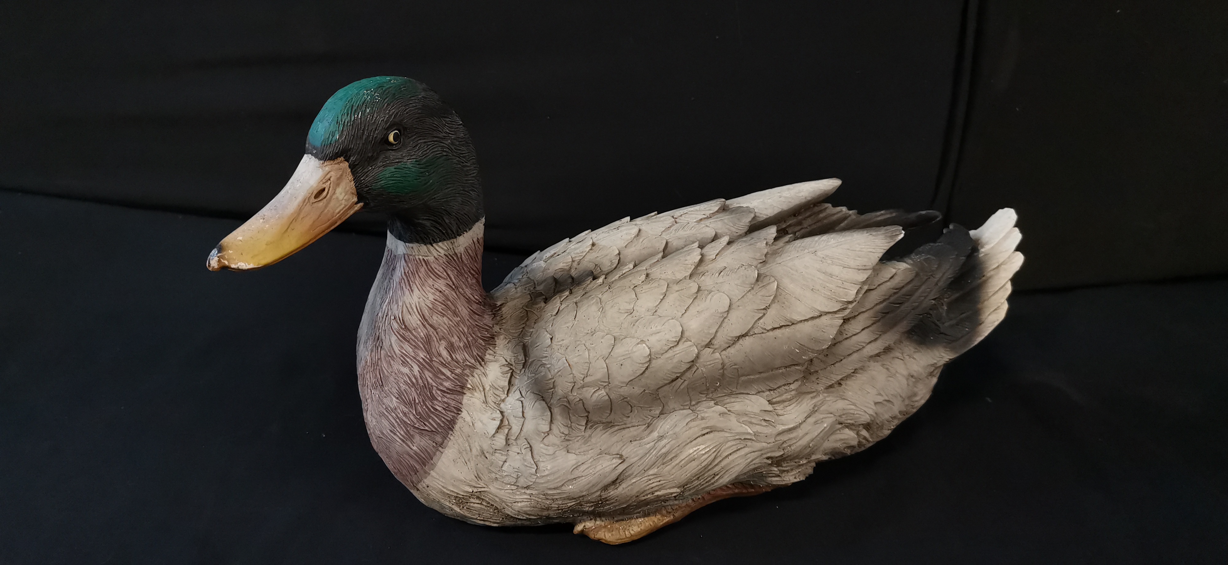 A mallard duck figurine featuring a green head, yellow beak, and textured grey and white plumage, measuring approximately 350mm in length.