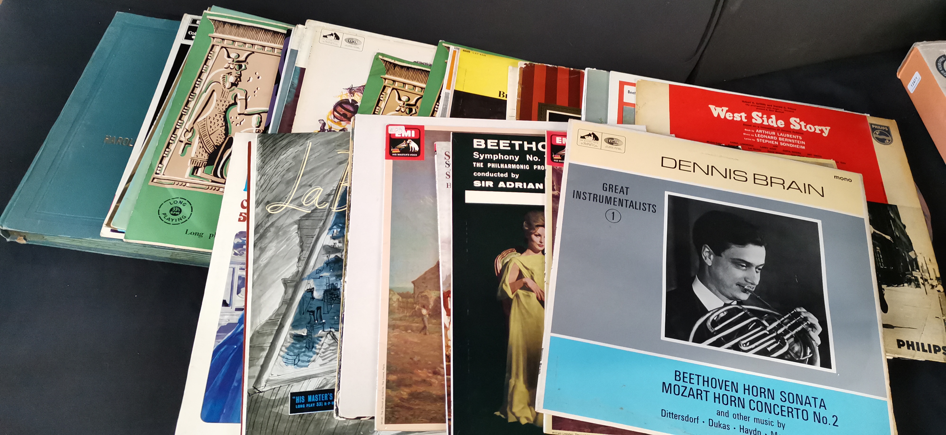 A collection of 36 multicoloured vinyl records featuring titles such as Dennis Brain’s Great Instrumentalists and West Side Story with labels from EMI, His Master’s Voice, Columbia, and Philips.