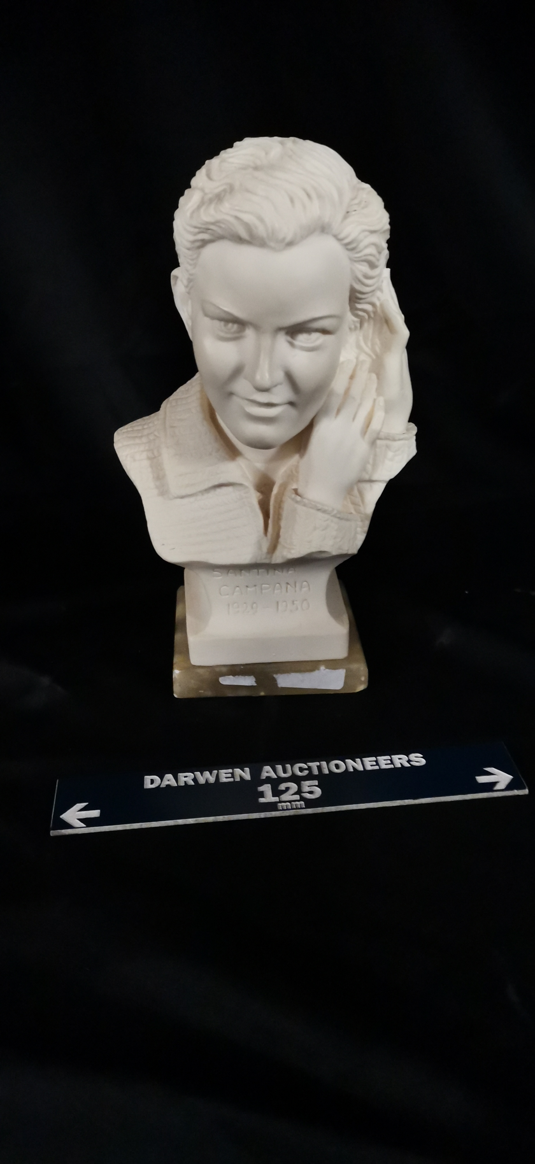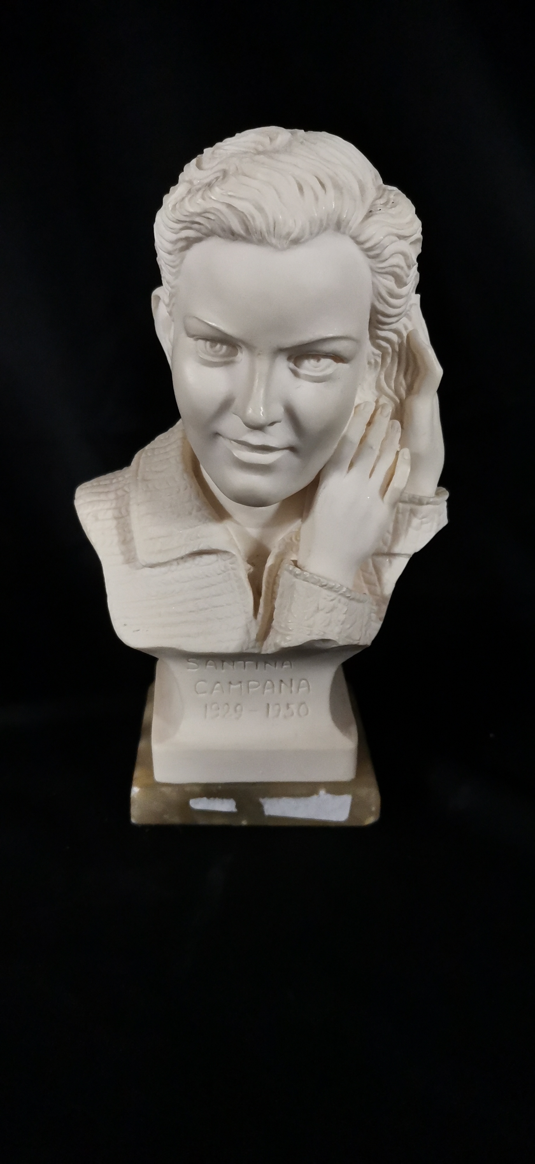 An off-white sculpted bust of Santina Campana by Arnaldo Giannelli, mounted on a stone base, measuring approximately 185mm in height.