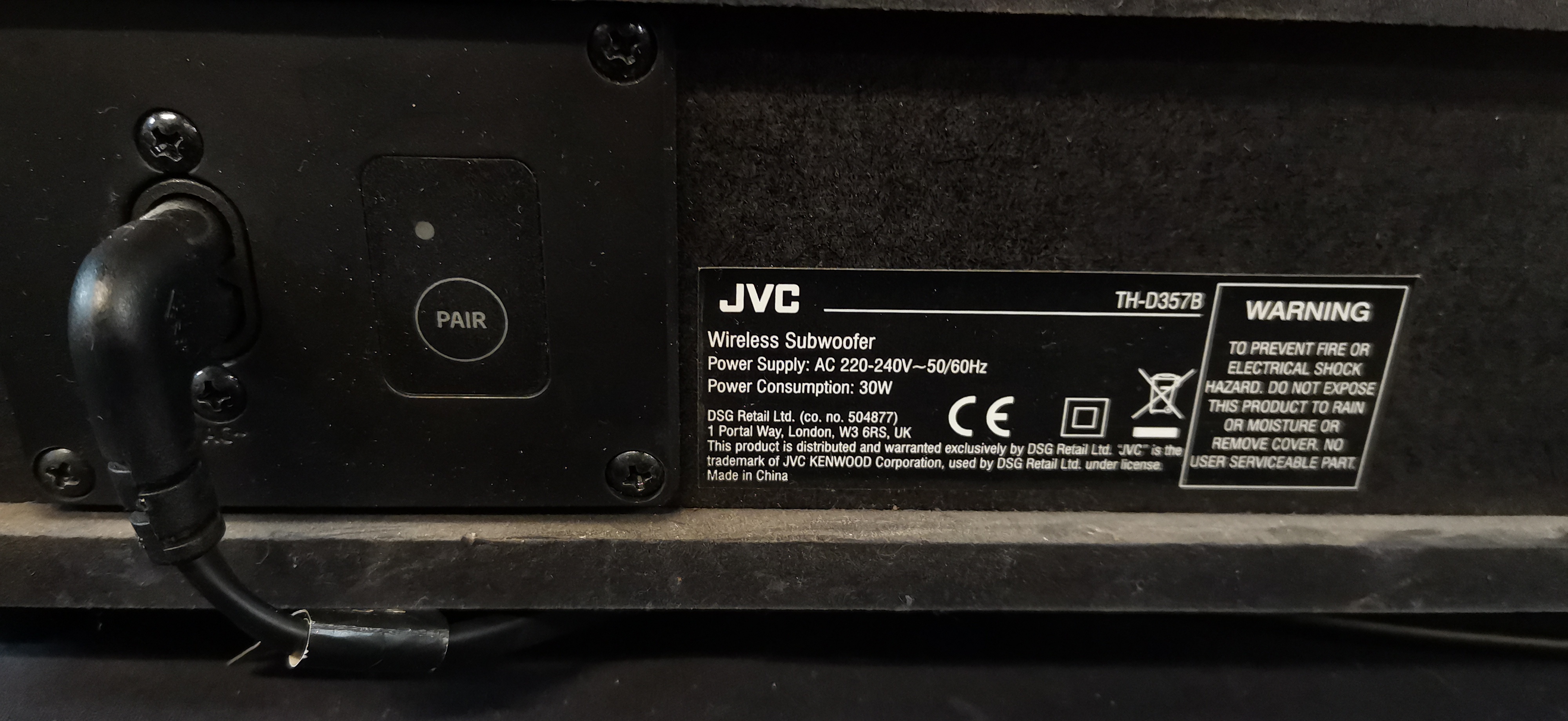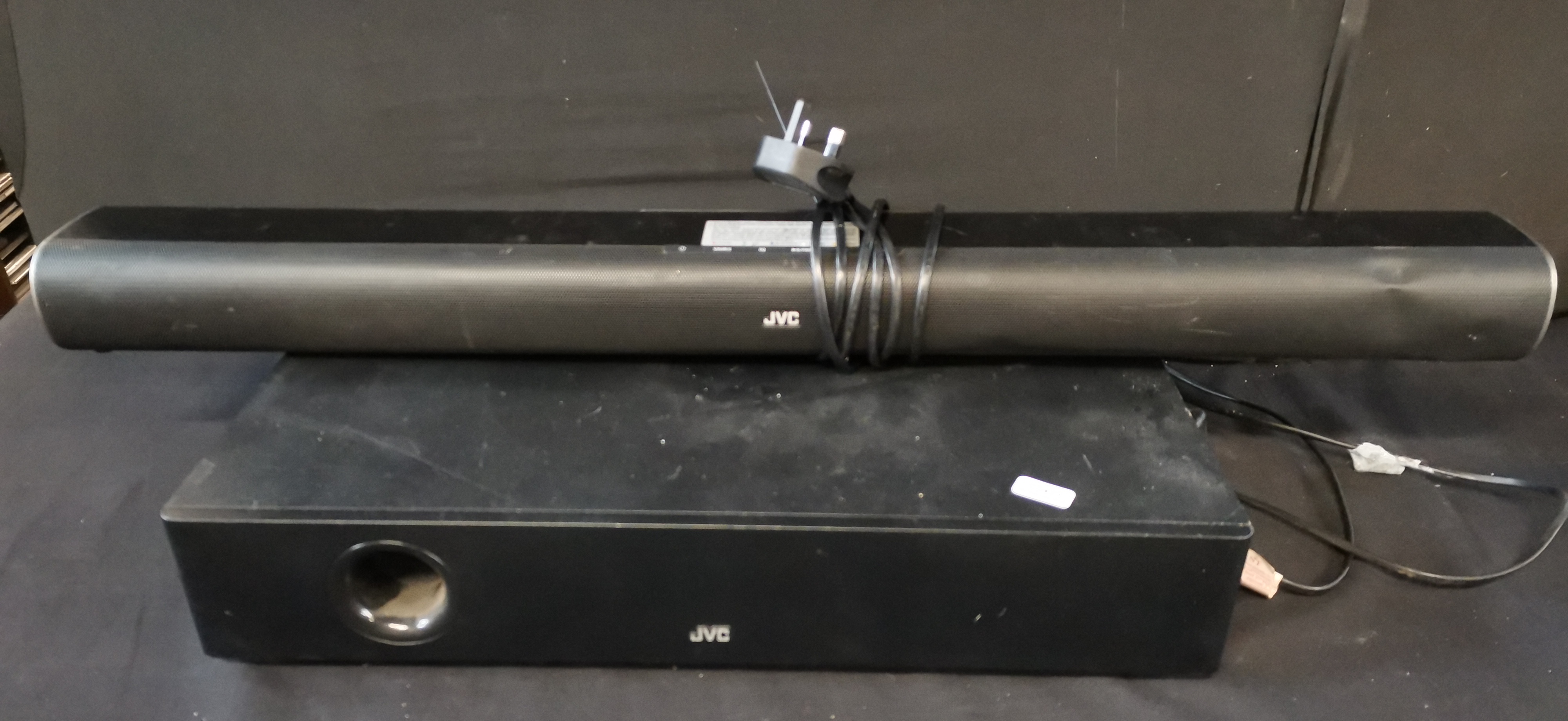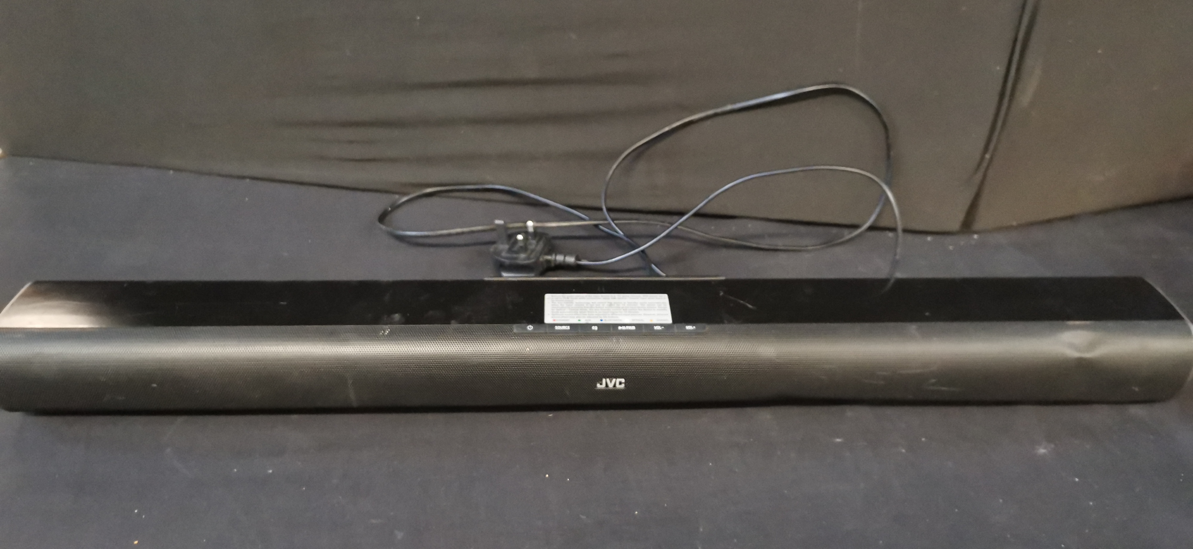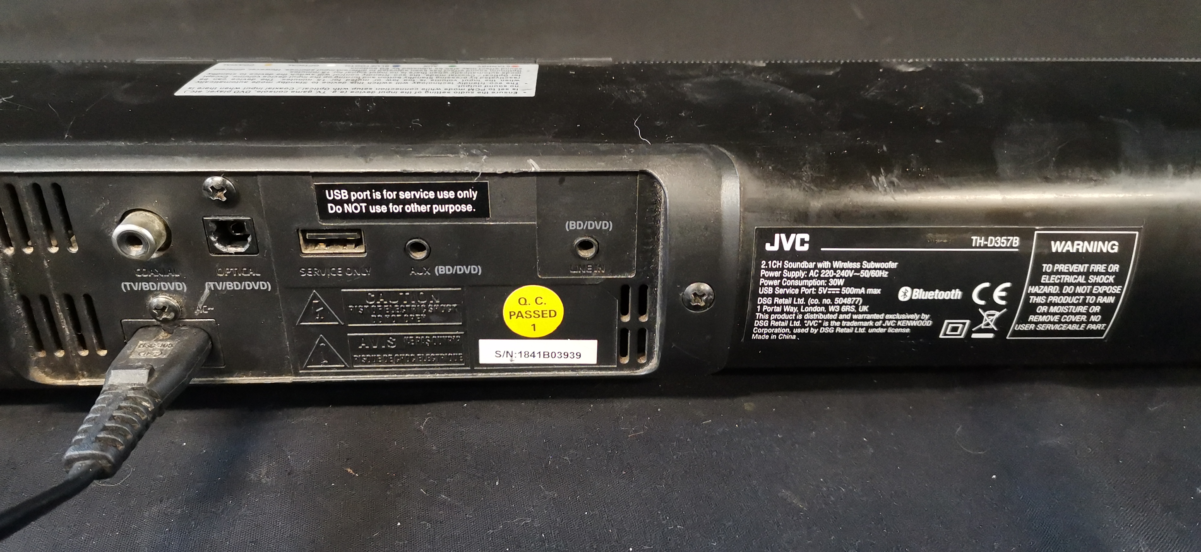 A black JVC model TH-D357B 2.1CH soundbar featuring Bluetooth connectivity, top-mounted controls, and multiple input ports including optical and coaxial.