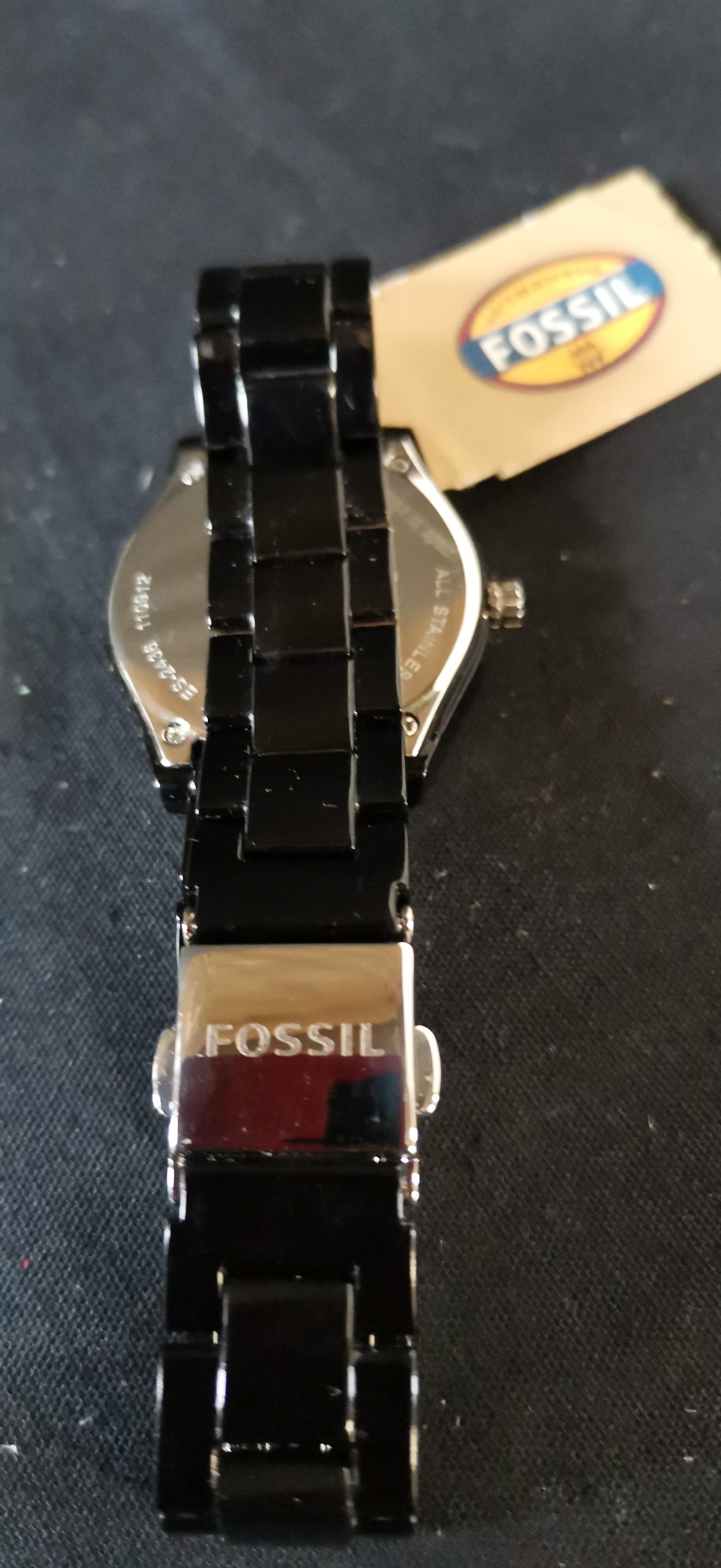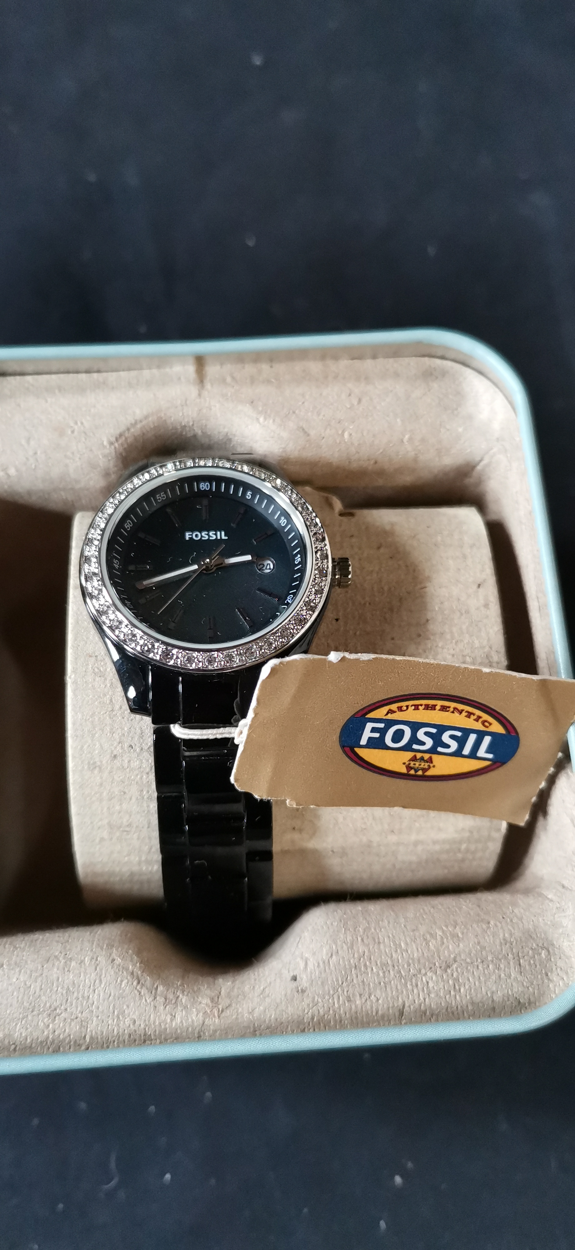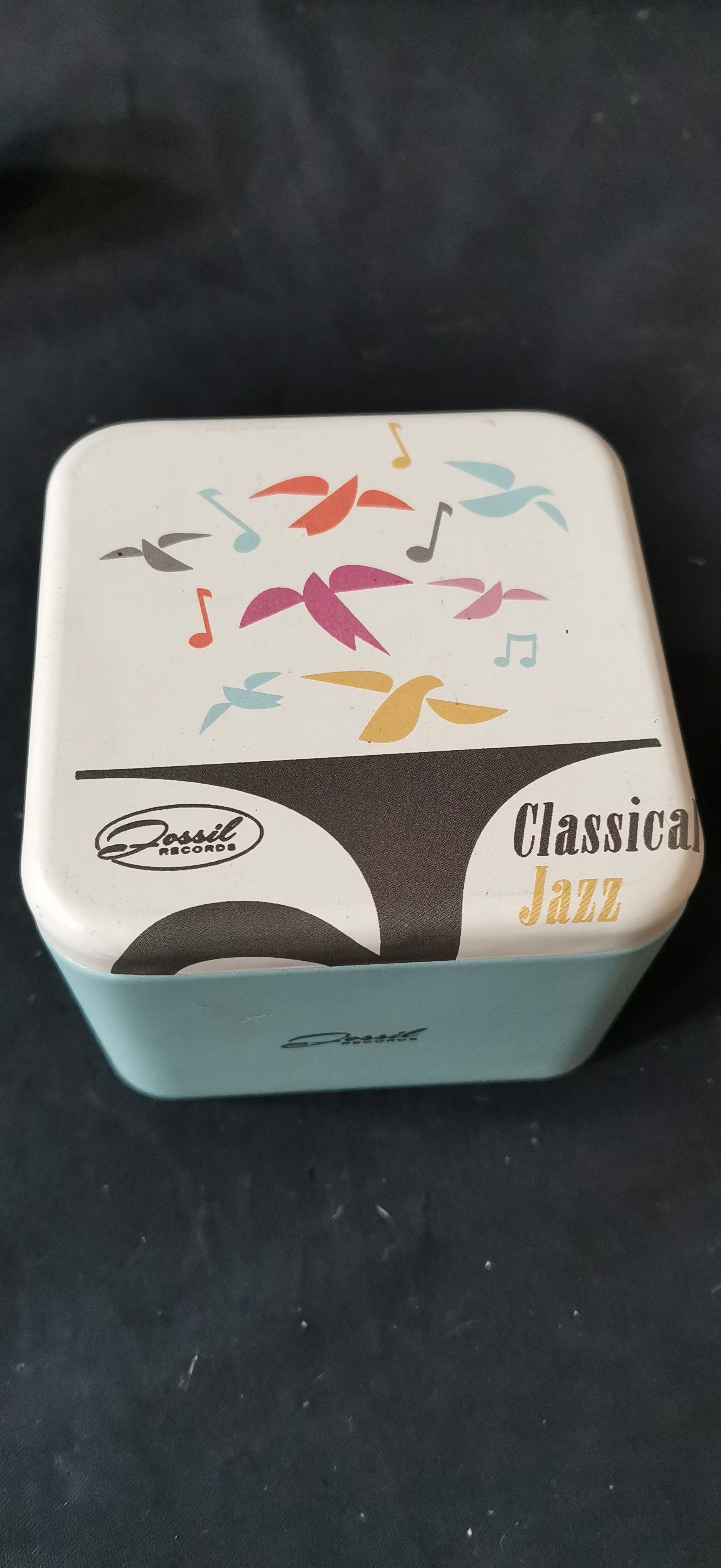 A Fossil ladies’ model ES-2436 wristwatch featuring a black stainless steel band, crystal-accented bezel, and date window, accompanied by a Classical Jazz themed collector’s tin.