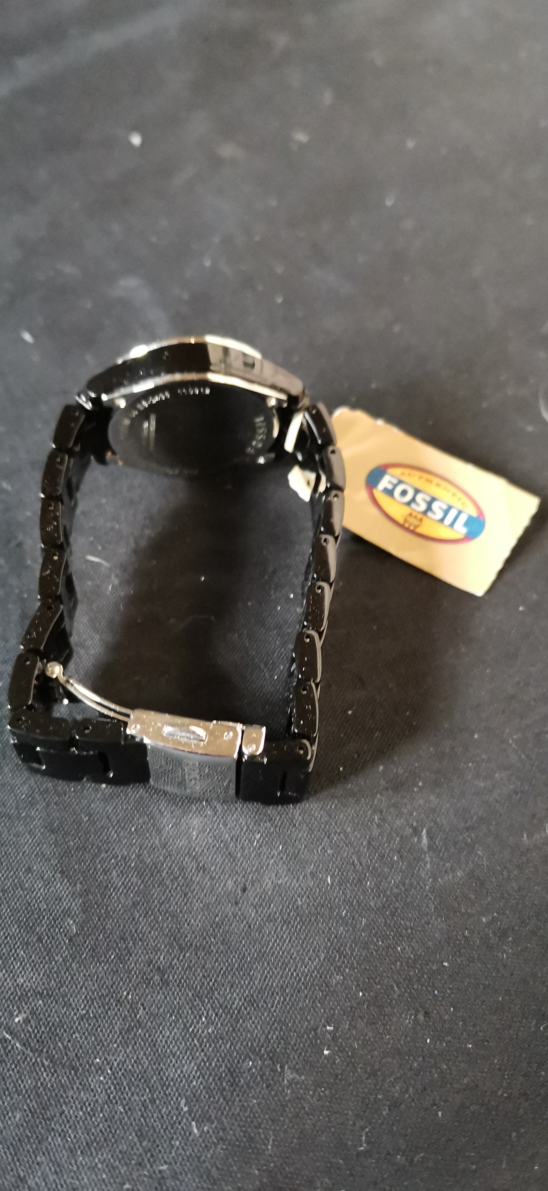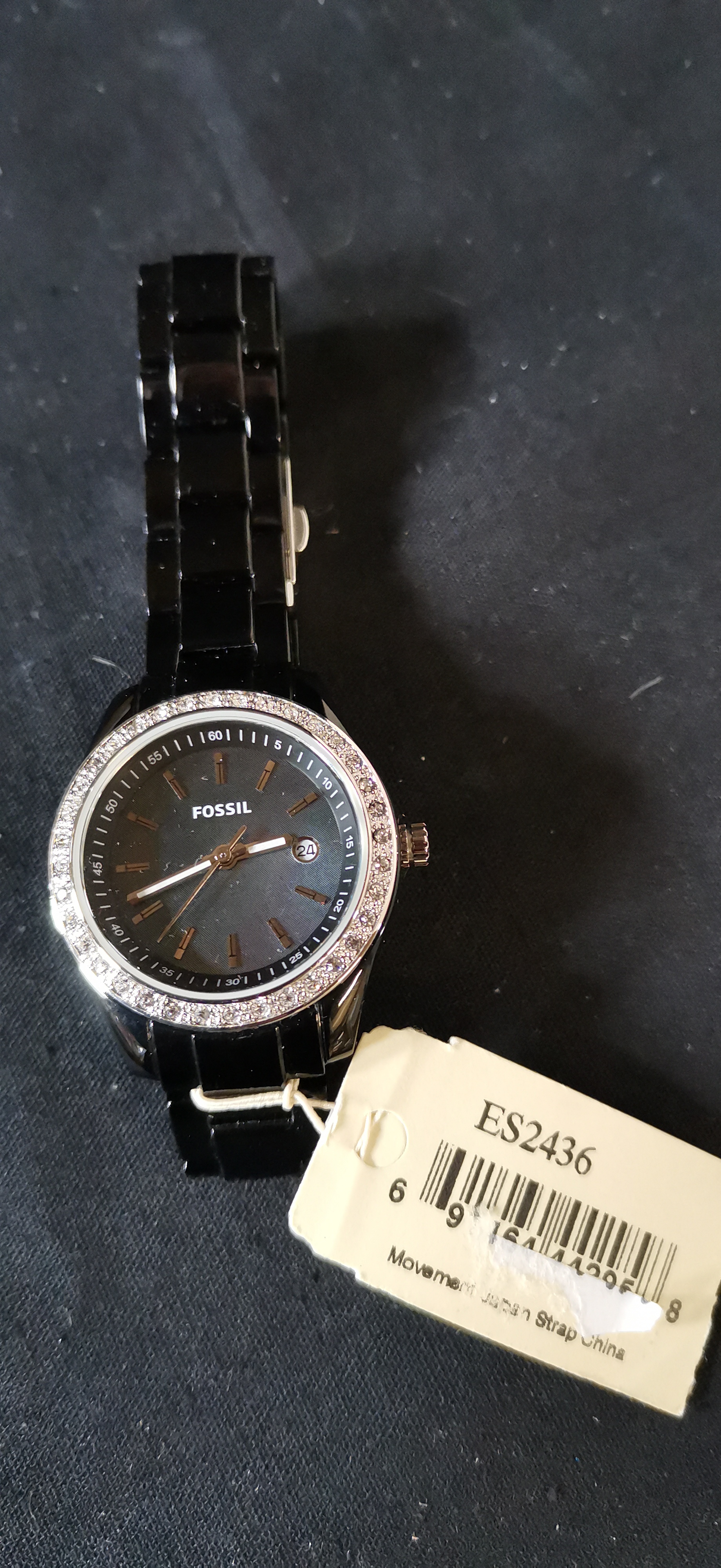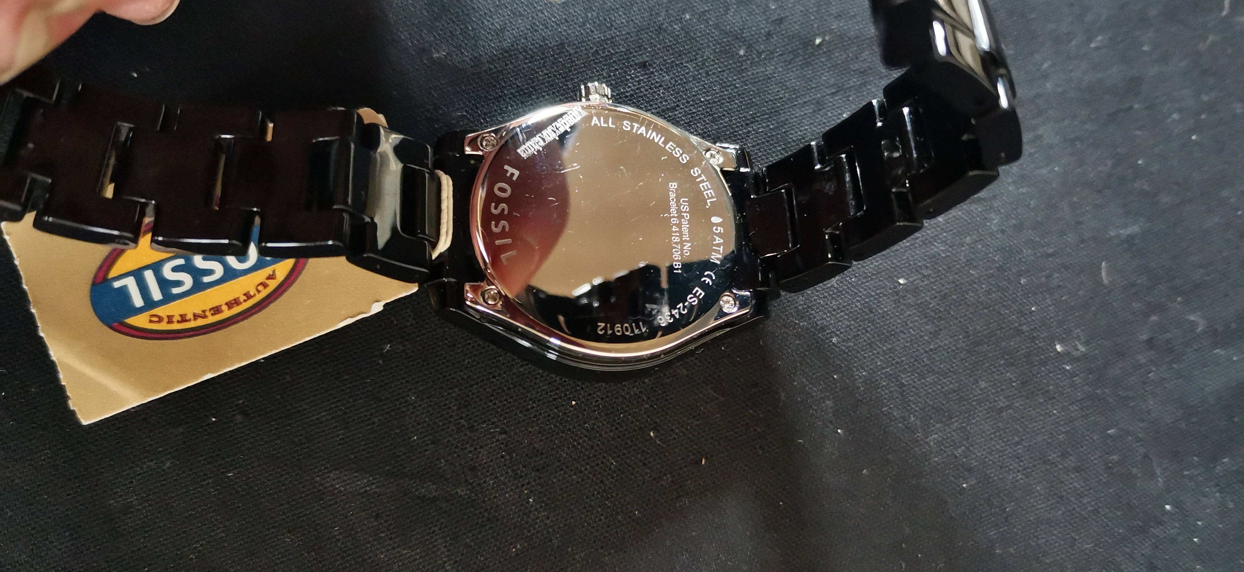 A Fossil ladies’ model ES-2436 wristwatch featuring a black stainless steel band, crystal-accented bezel, and date window, accompanied by a Classical Jazz themed collector’s tin.