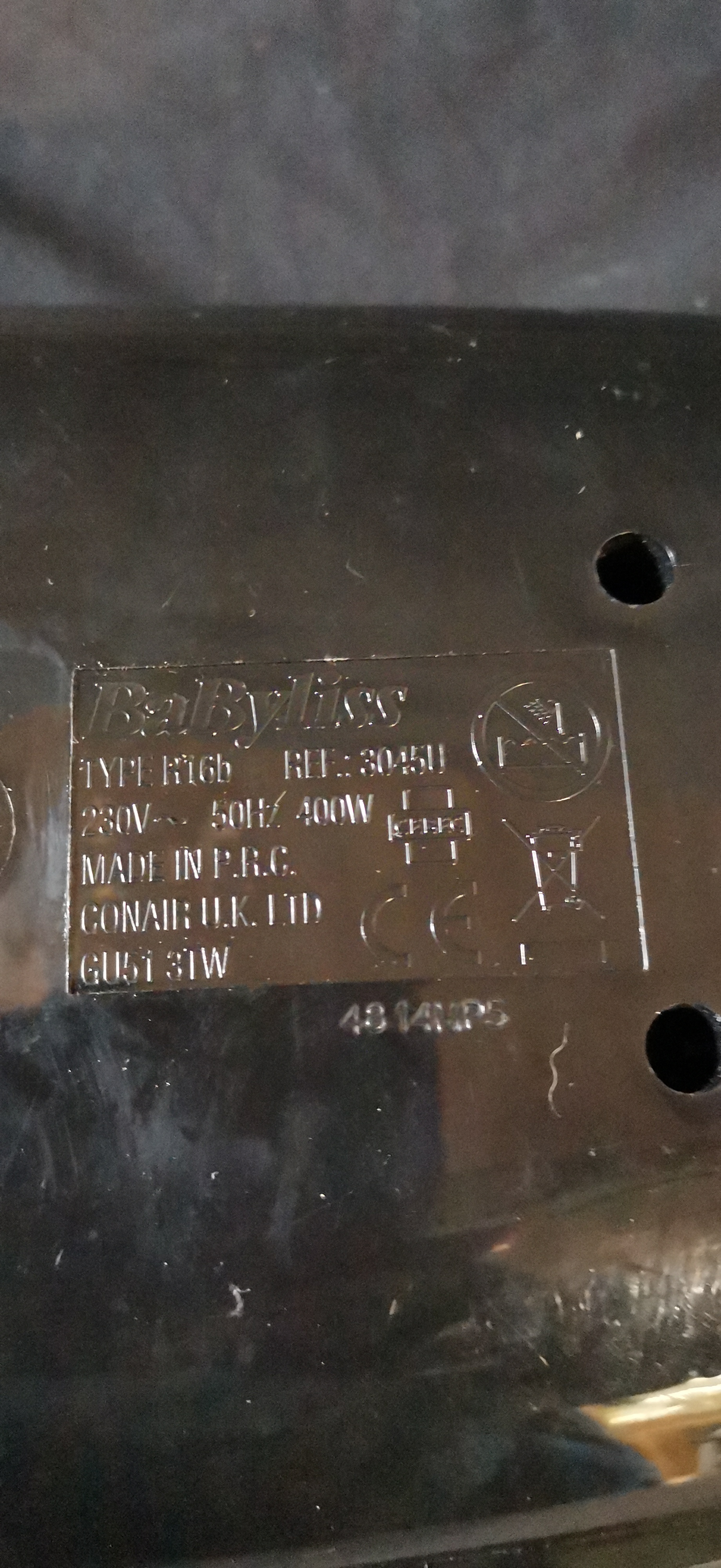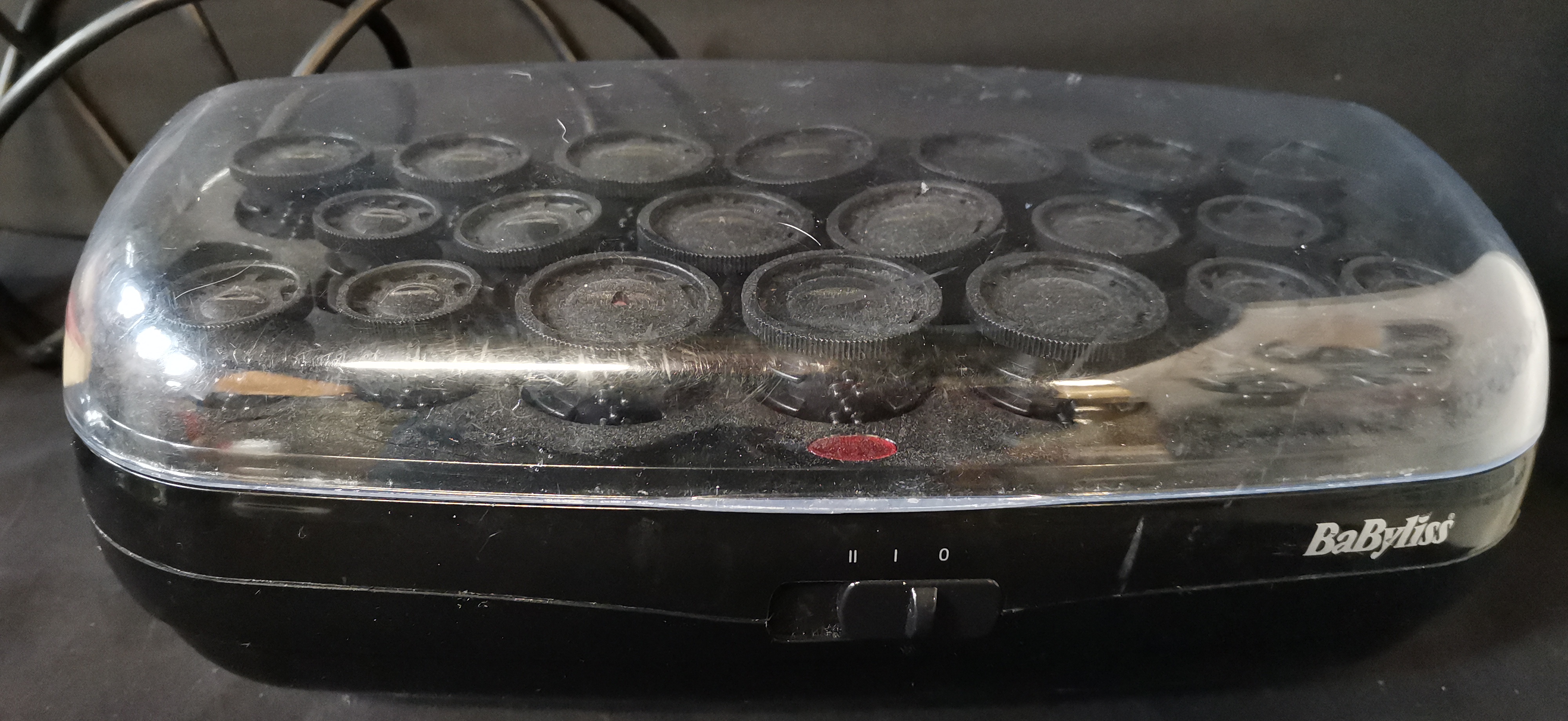 A collection of black BaByliss thermo-ceramic heated hair rollers housed in a black base with a clear lid, marked Type R16b and Ref 3045U.