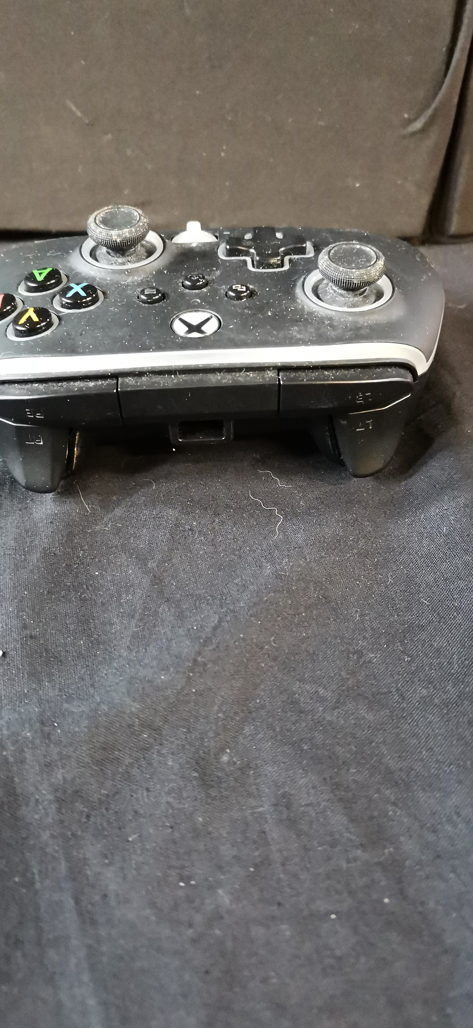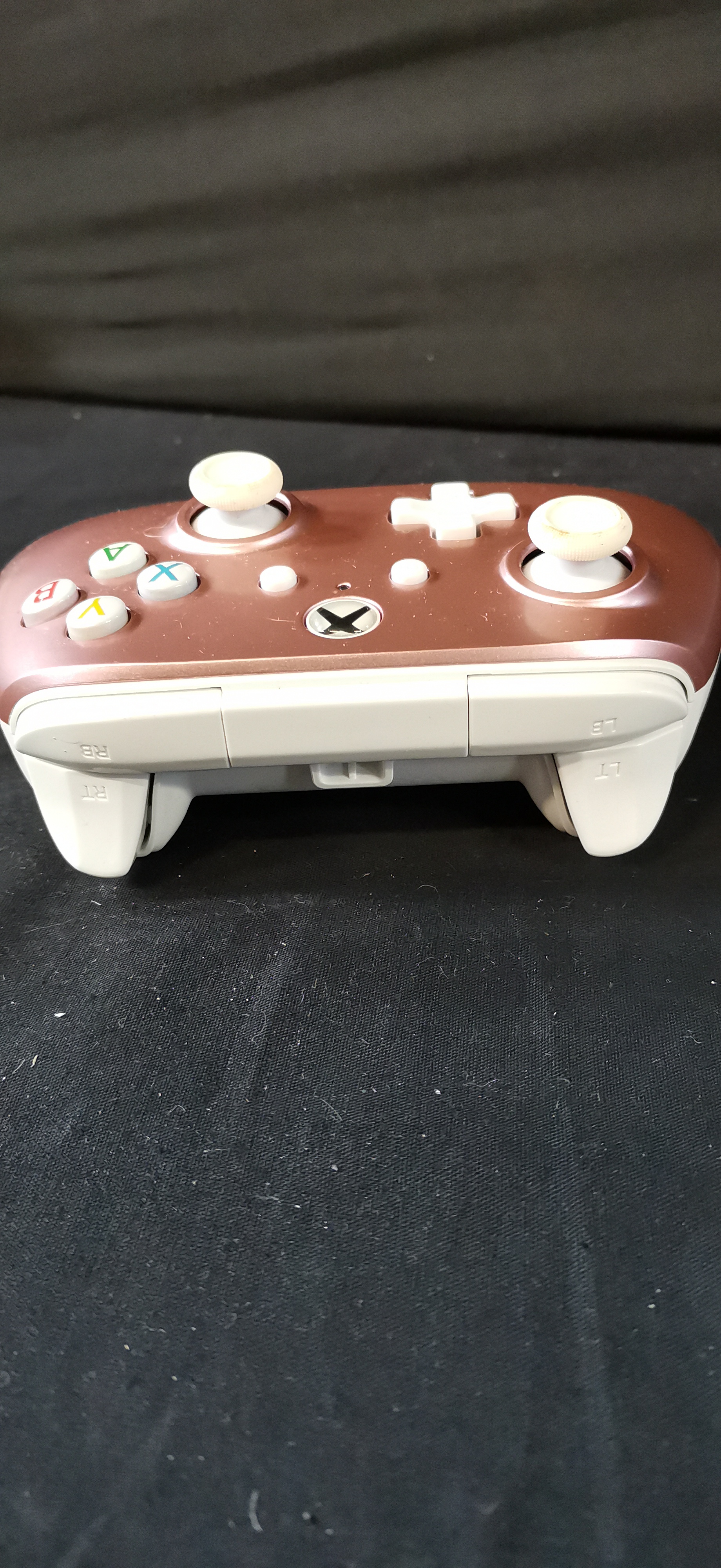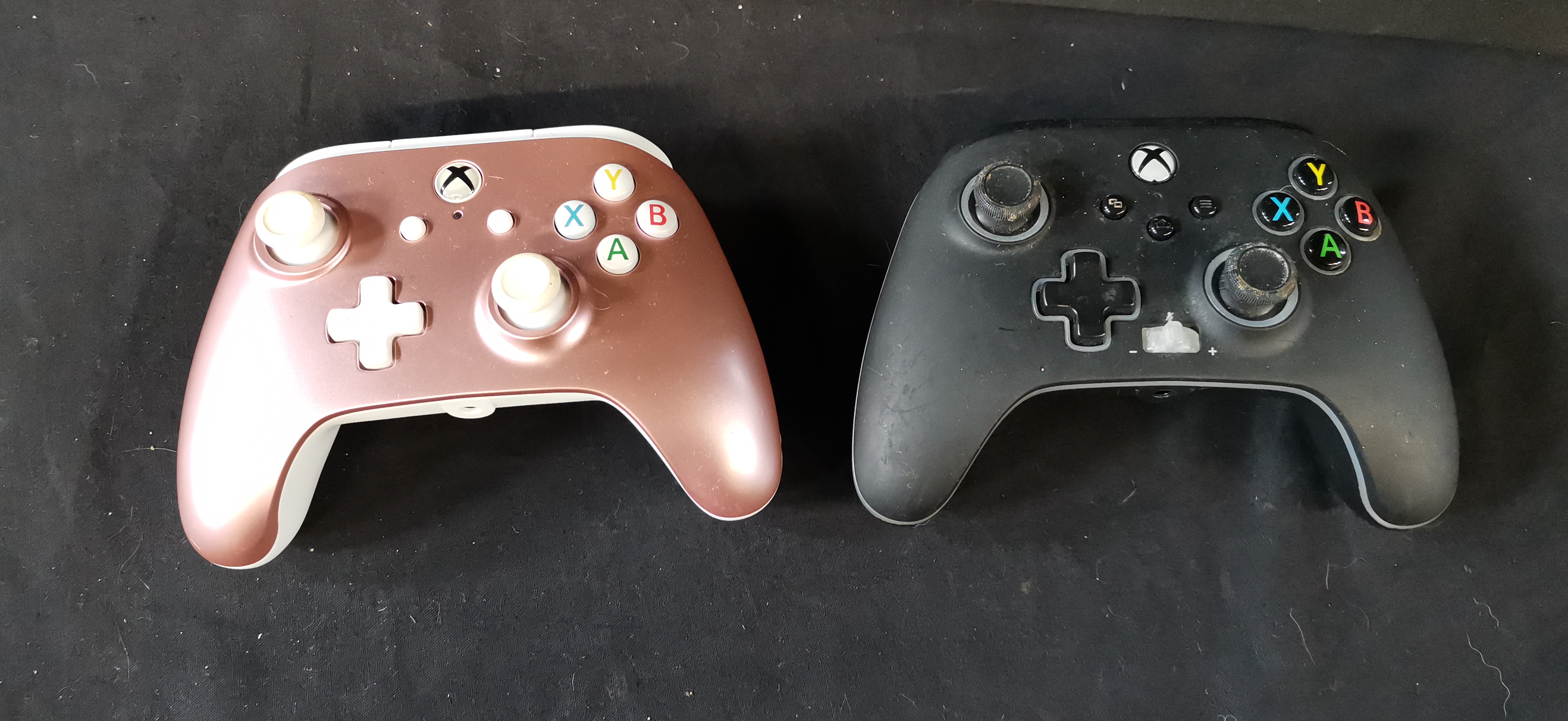 A pair of PowerA wired controllers for Xbox, featuring a metallic rose gold and white model and a black and grey model.