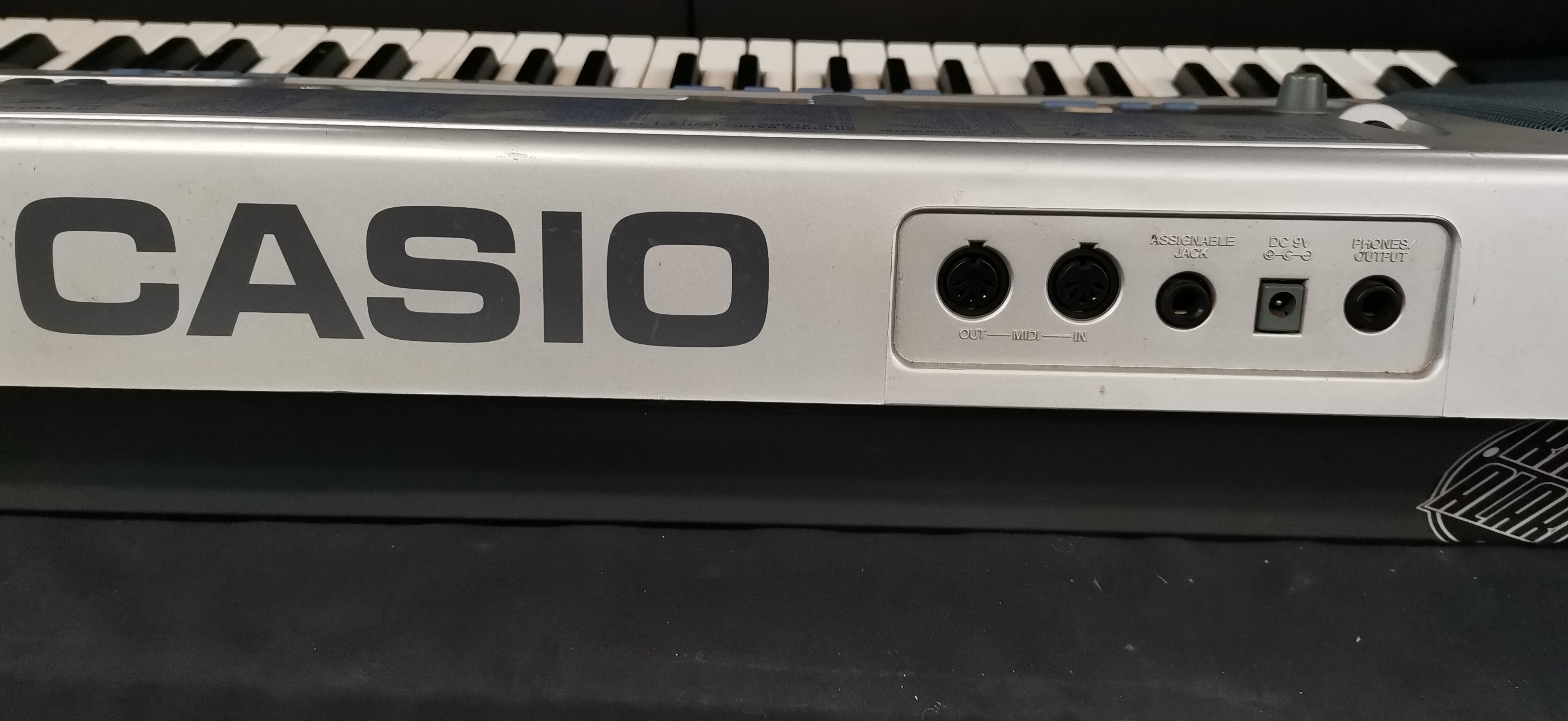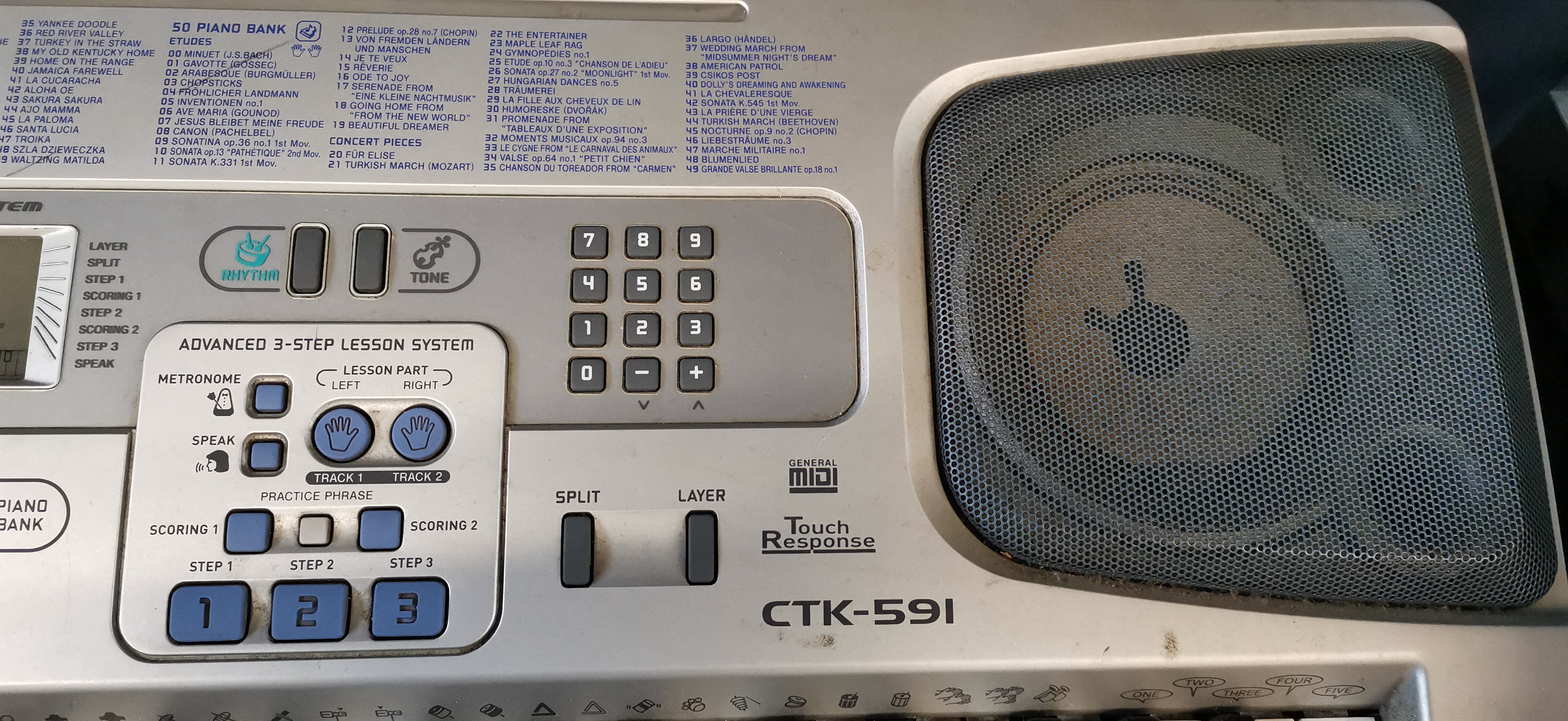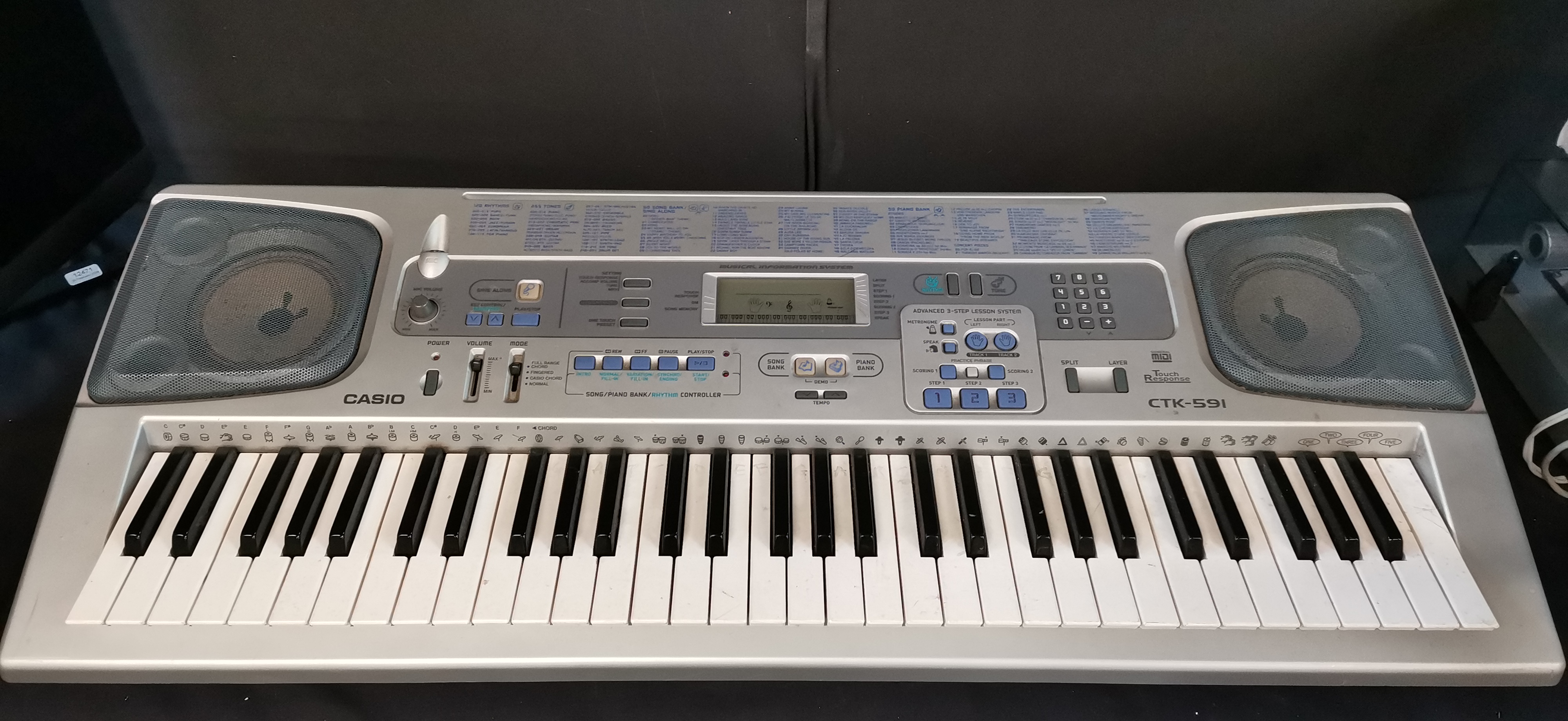 A silver Casio CTK-591 electronic keyboard featuring a musical information system display, touch response keys, and an advanced 3-step lesson system.