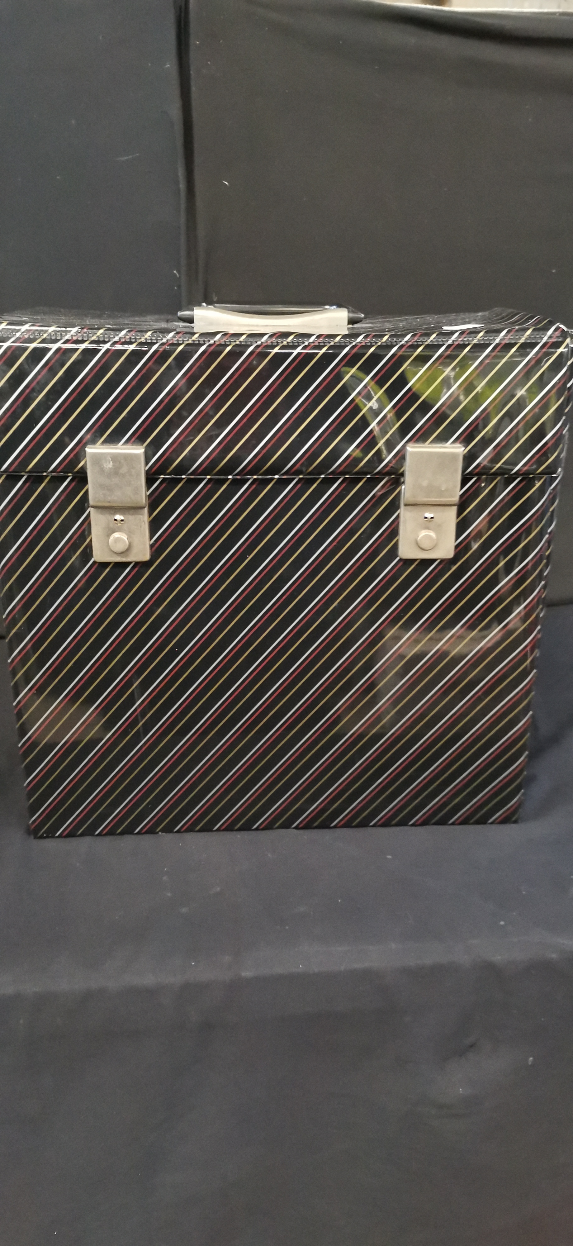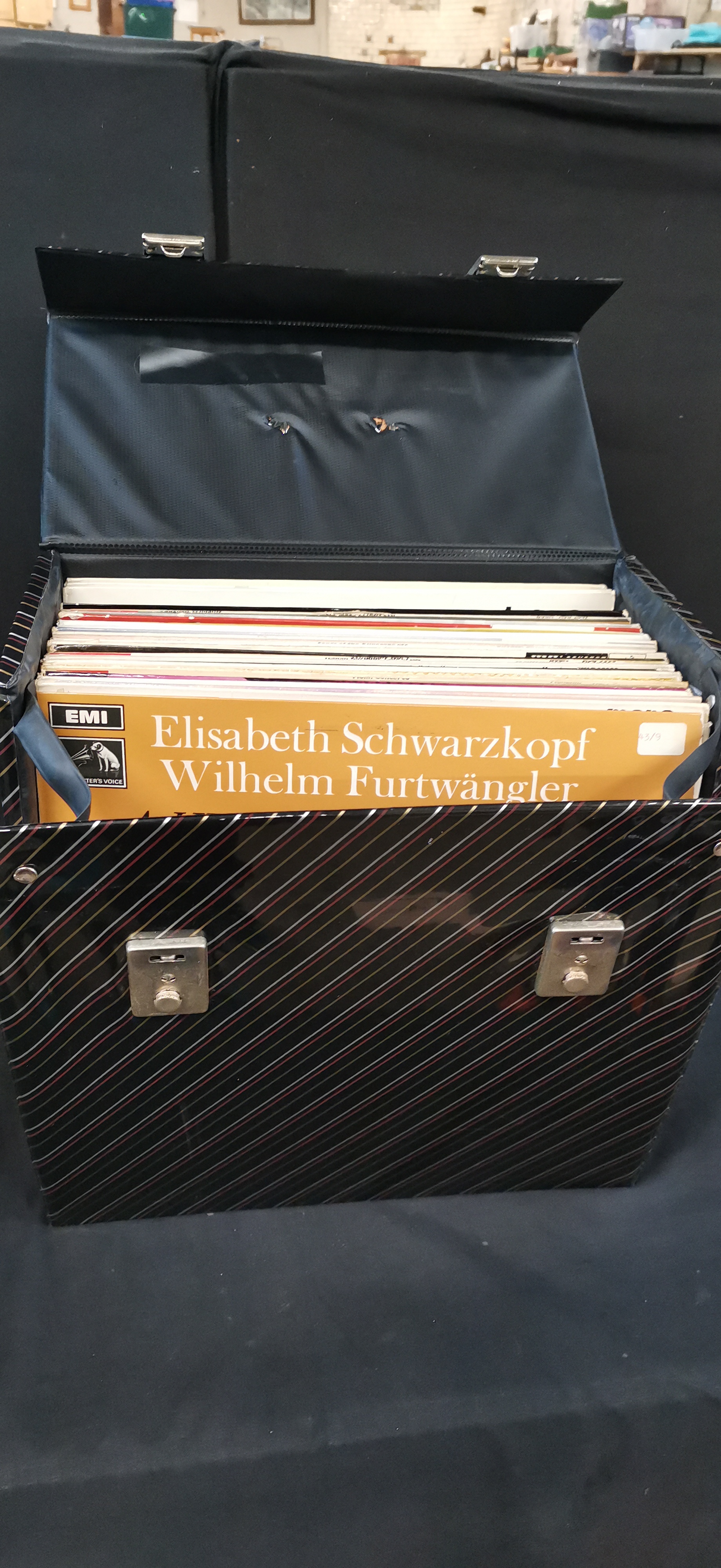 A collection of vinyl records including an Elisabeth Schwarzkopf and Wilhelm Furtwängler EMI album, housed in a black carrying case with multi-coloured diagonal stripes.
